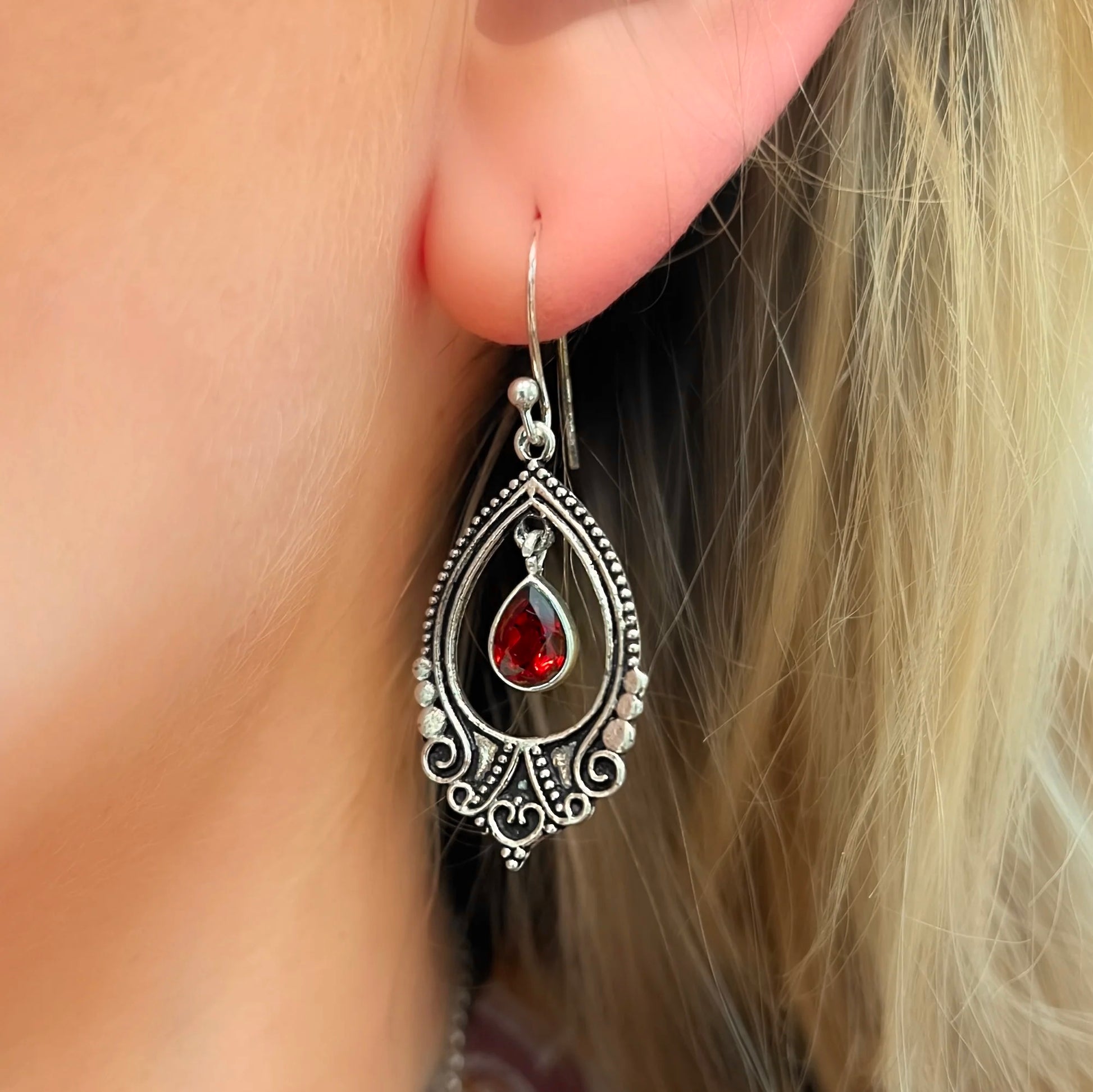 Beautiful Boho Inspired Sterling Silver Filigree Red Garnet Drop Earrings