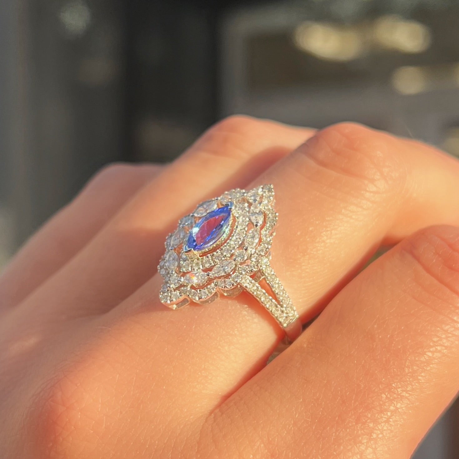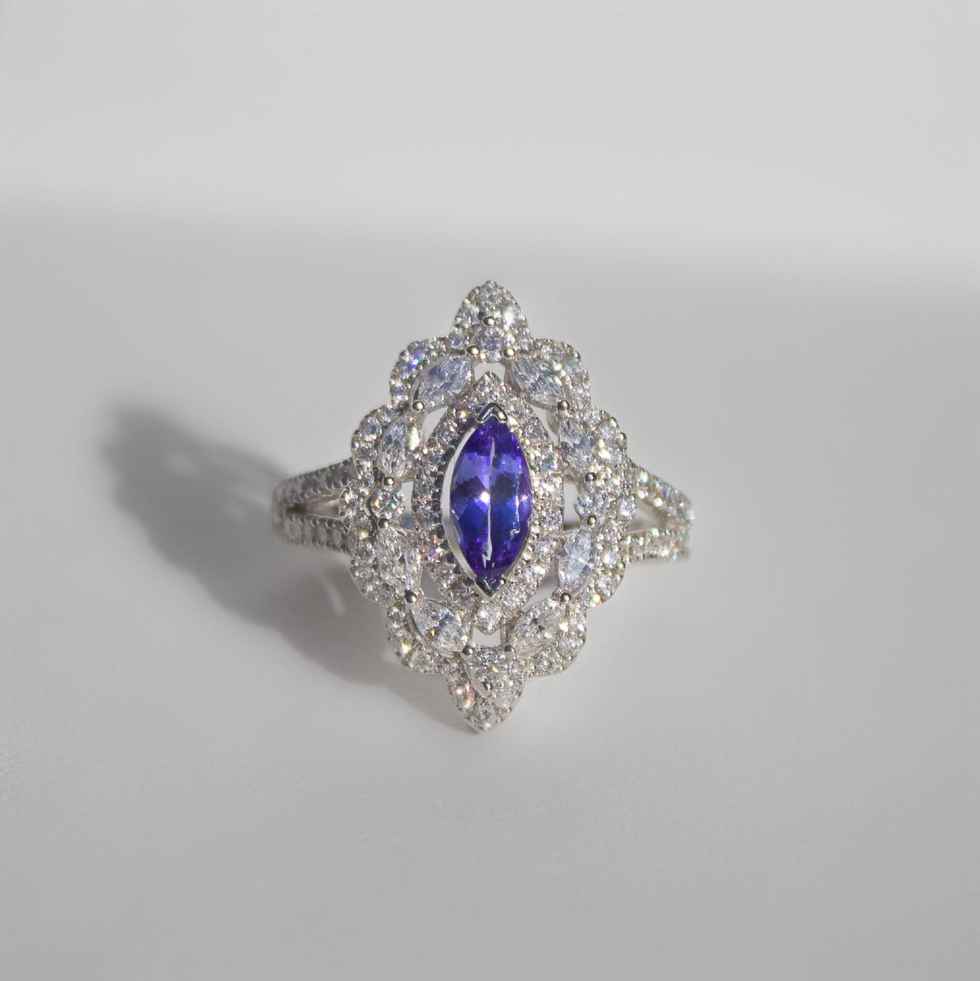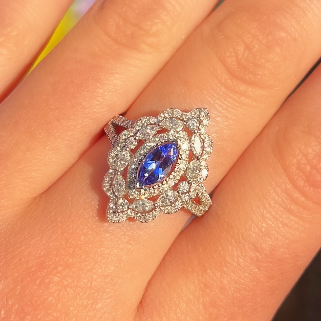The Victoria Ring - Sparkling 18ct White Gold Marquise Tanzanite and Diamond - Size O