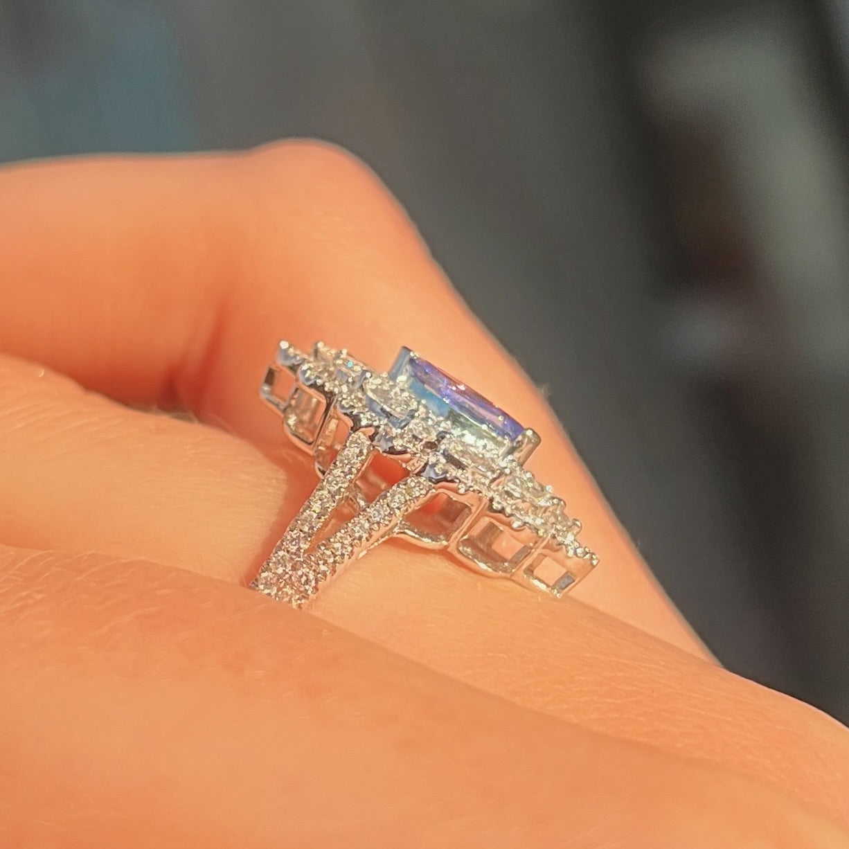 At its heart is a radiant, bright blue tanzanite gemstone, half-bezel set surrounded by an array of glittering, uniquely shaped diamonds. Together, these stones catch the light in a breathtaking display of brilliance, making this ring an unforgettable showstopper.