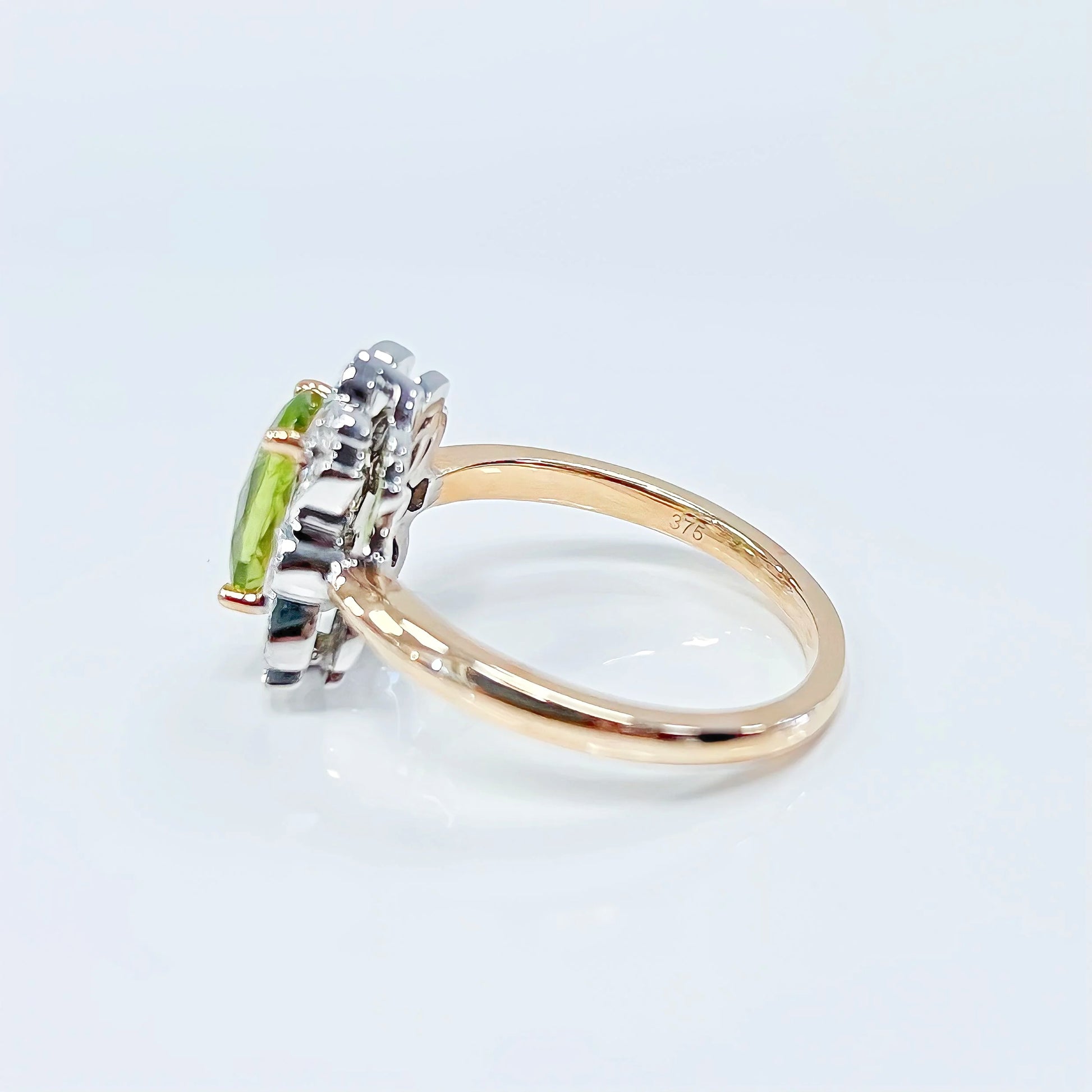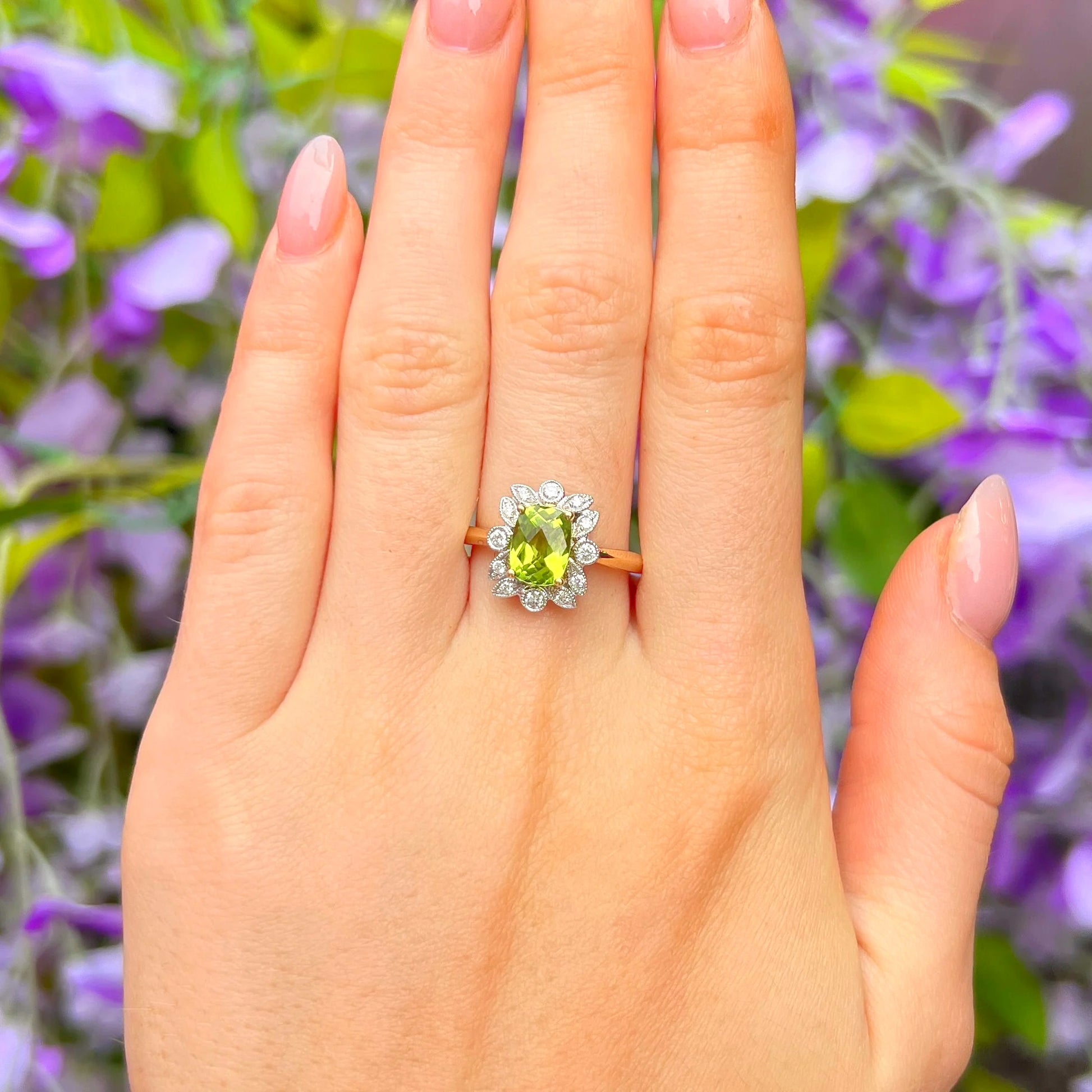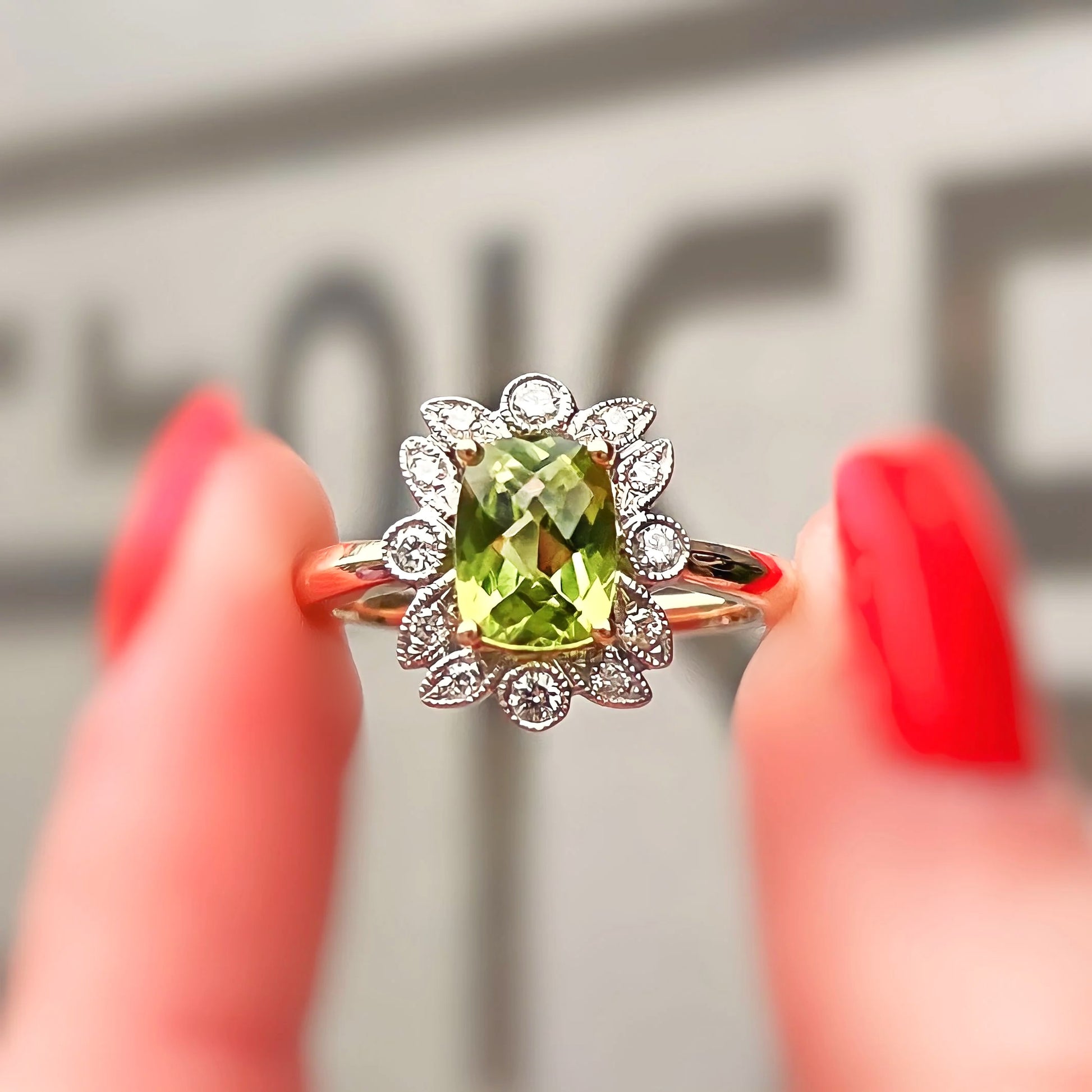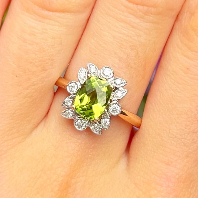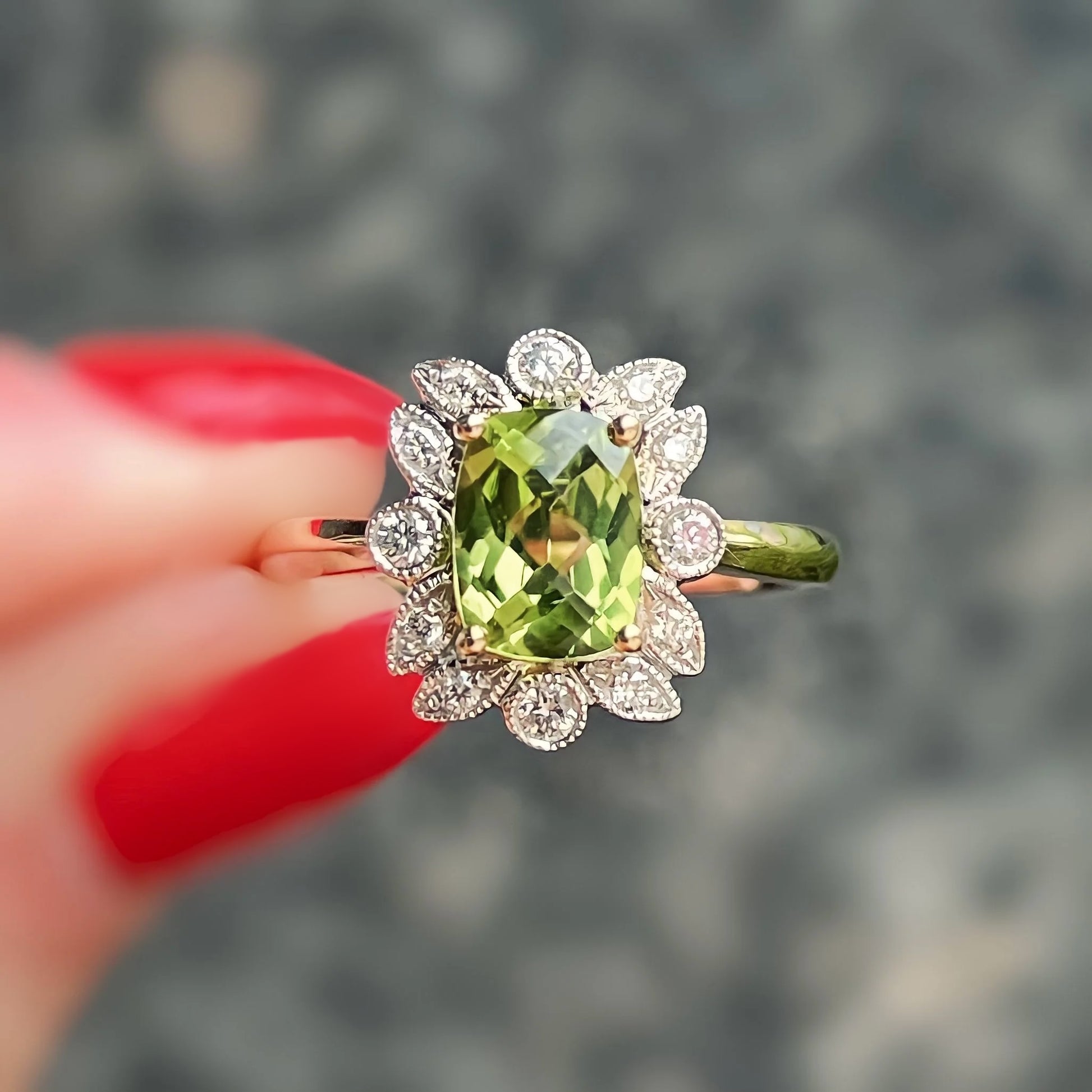 At its centre lies an apple-green, checkerboard-faceted peridot, carefully claw-set in yellow gold to enhance its warm tones. Surrounding it is a nature-inspired natural diamond design, highlighted in white gold to amplify the size, sparkle, fire, and brilliance of the stones.