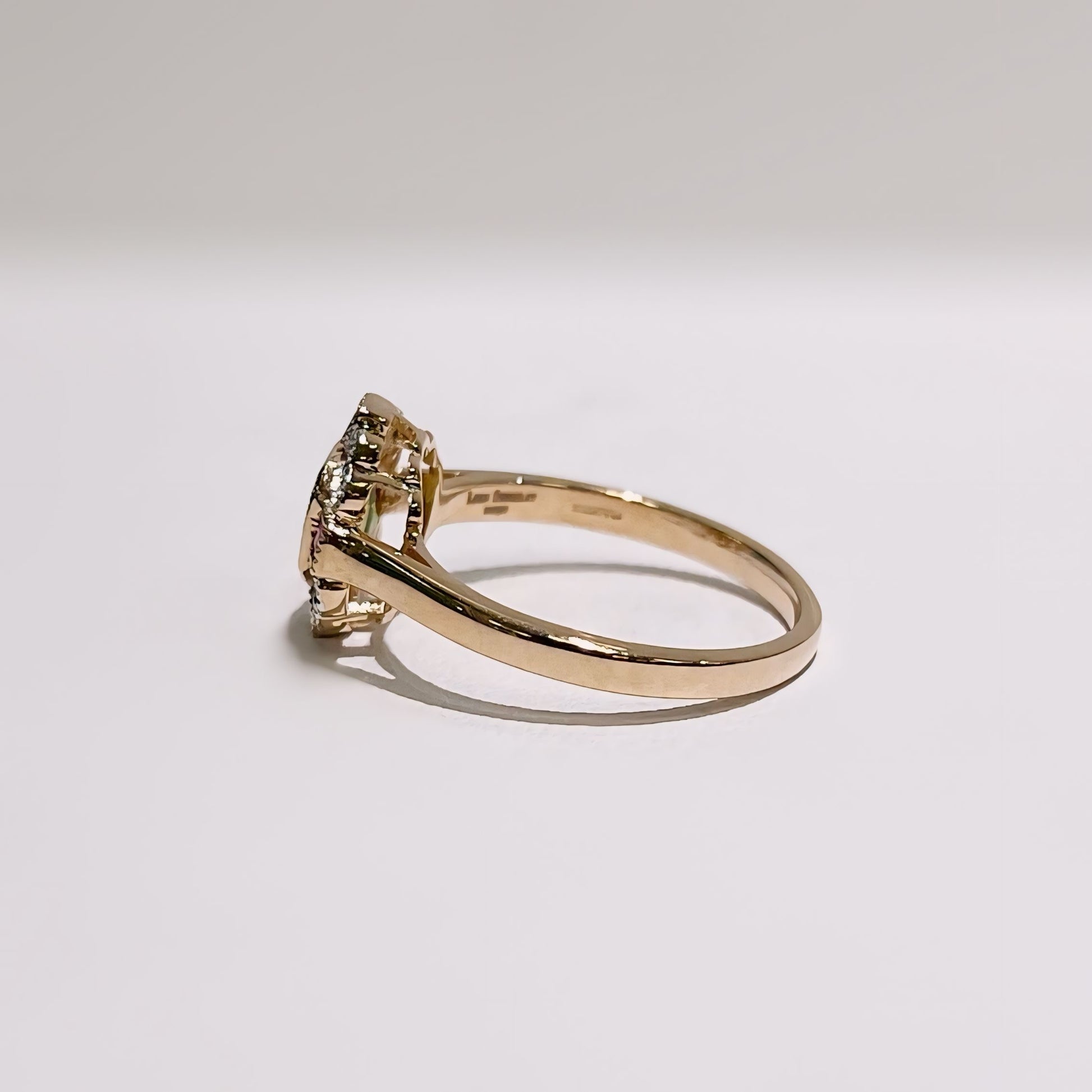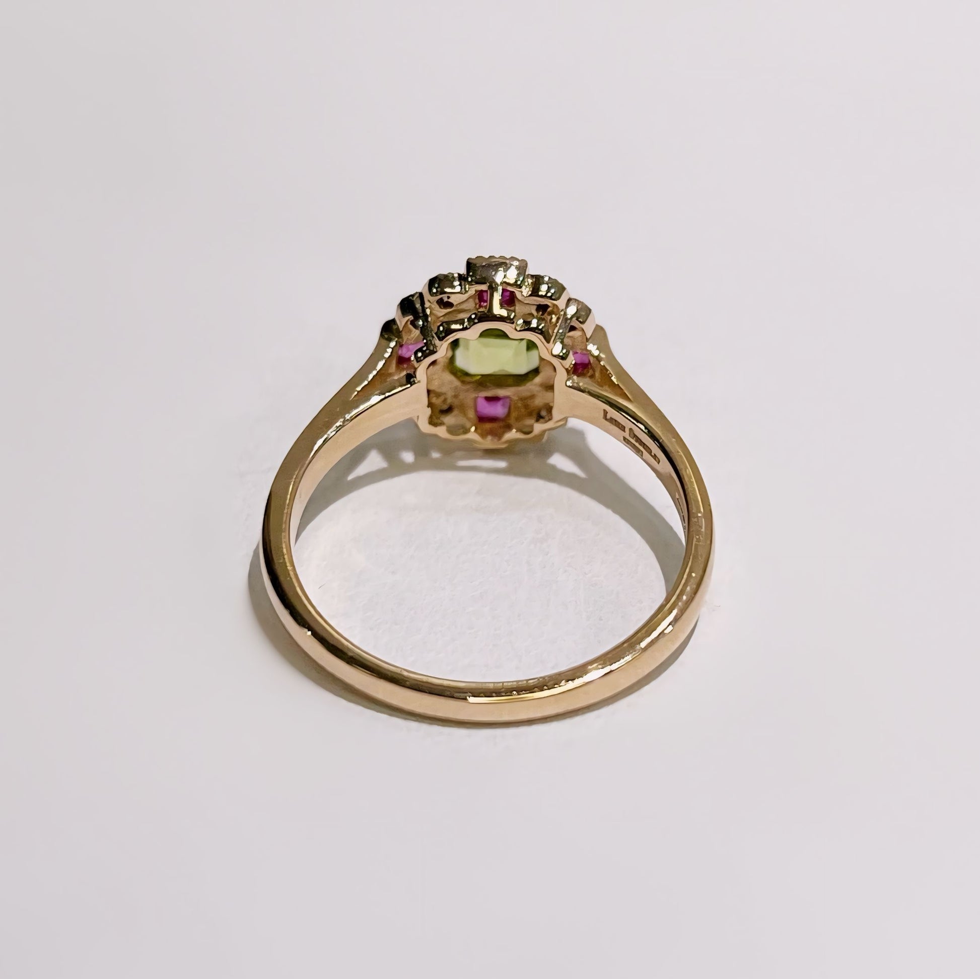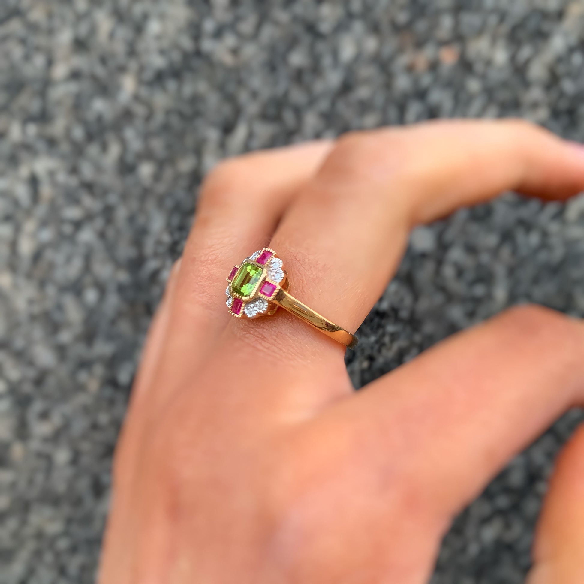 This unique ring features the ultimate colour combo – green and pink! She's been crafted in the Art Deco style, with a central peridot bezel set into warm 9ct yellow gold to enhance its vibrant hue.