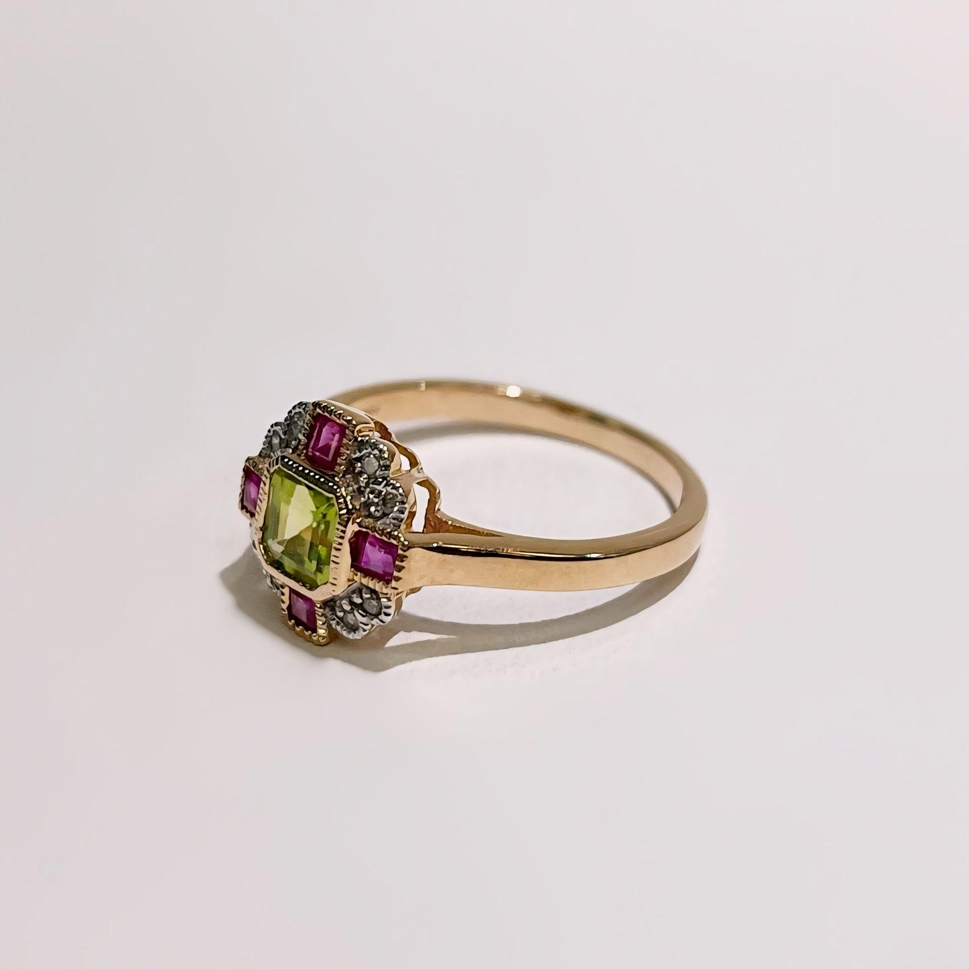 9ct Yellow Gold Art Deco Reproduction Green Peridot, Pink Ruby and Diamond Ring – Size O