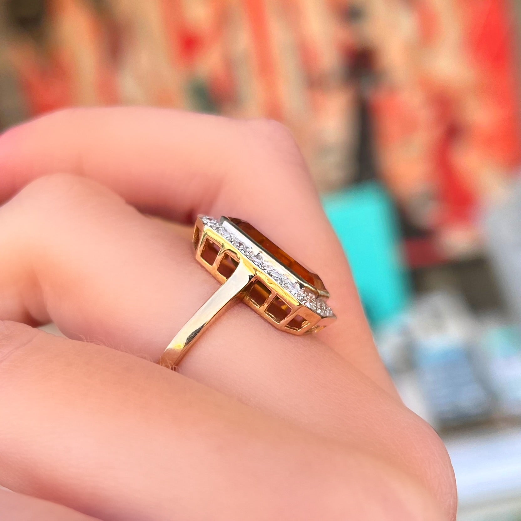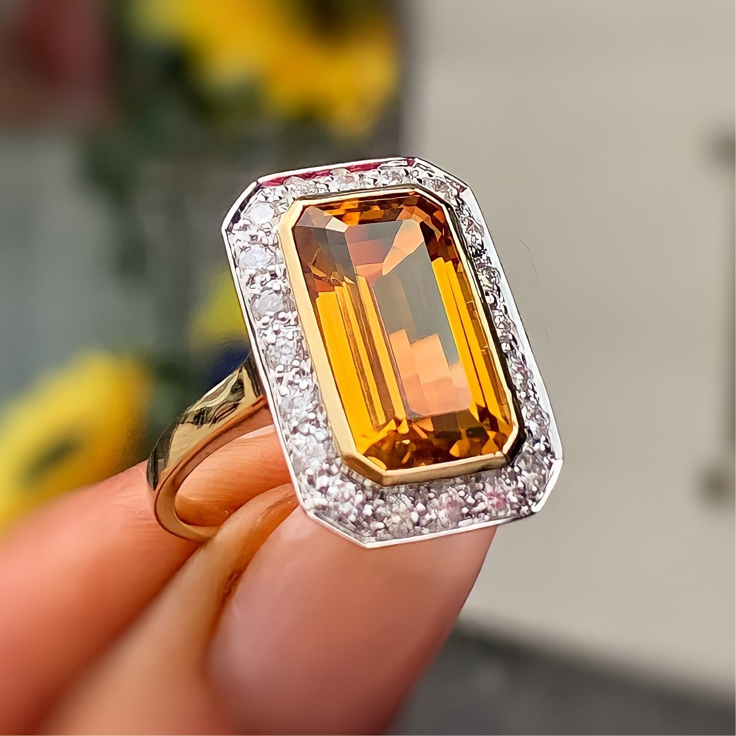 Art Deco Inspired 9ct Yellow Gold Madeira Citrine and Diamond Halo Cocktail Ring - Size N ½