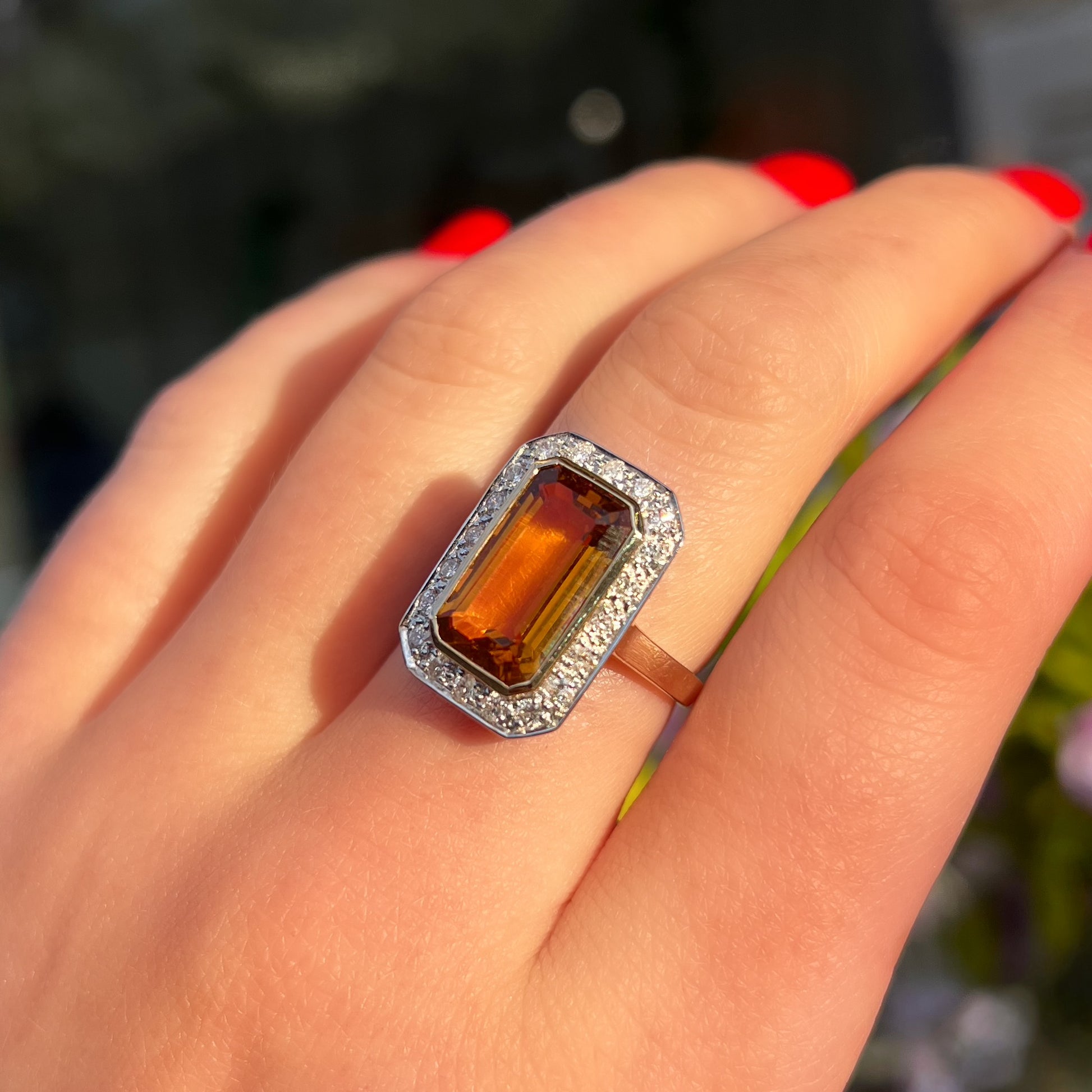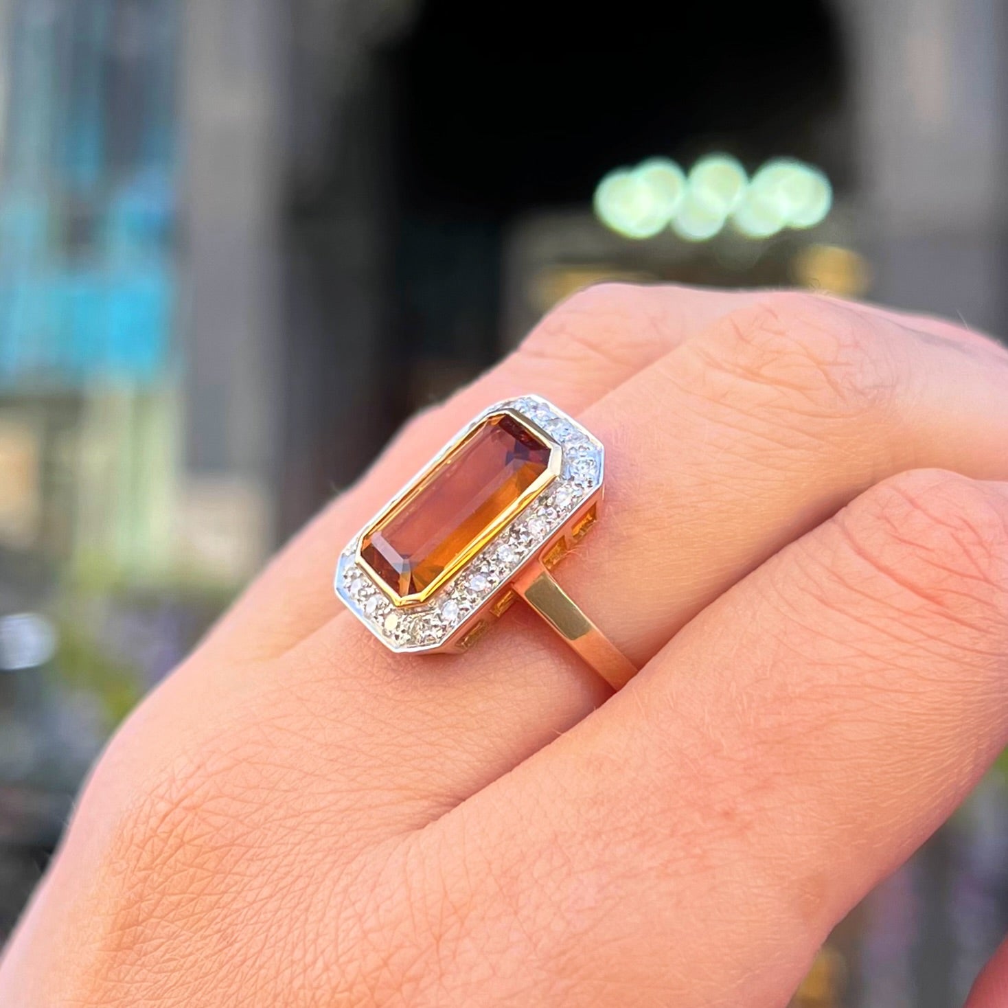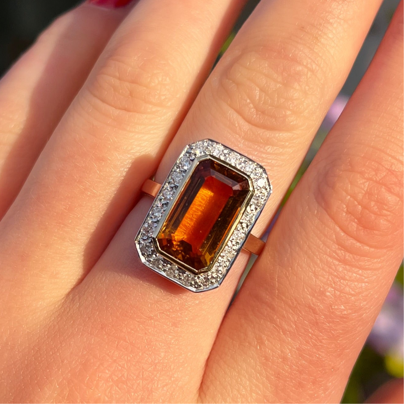 She features an autumnal, warming, emerald-cut madeira citrine bezel set securely into fine, classic 9ct yellow gold to compliment the burnt orange hue of the stone.