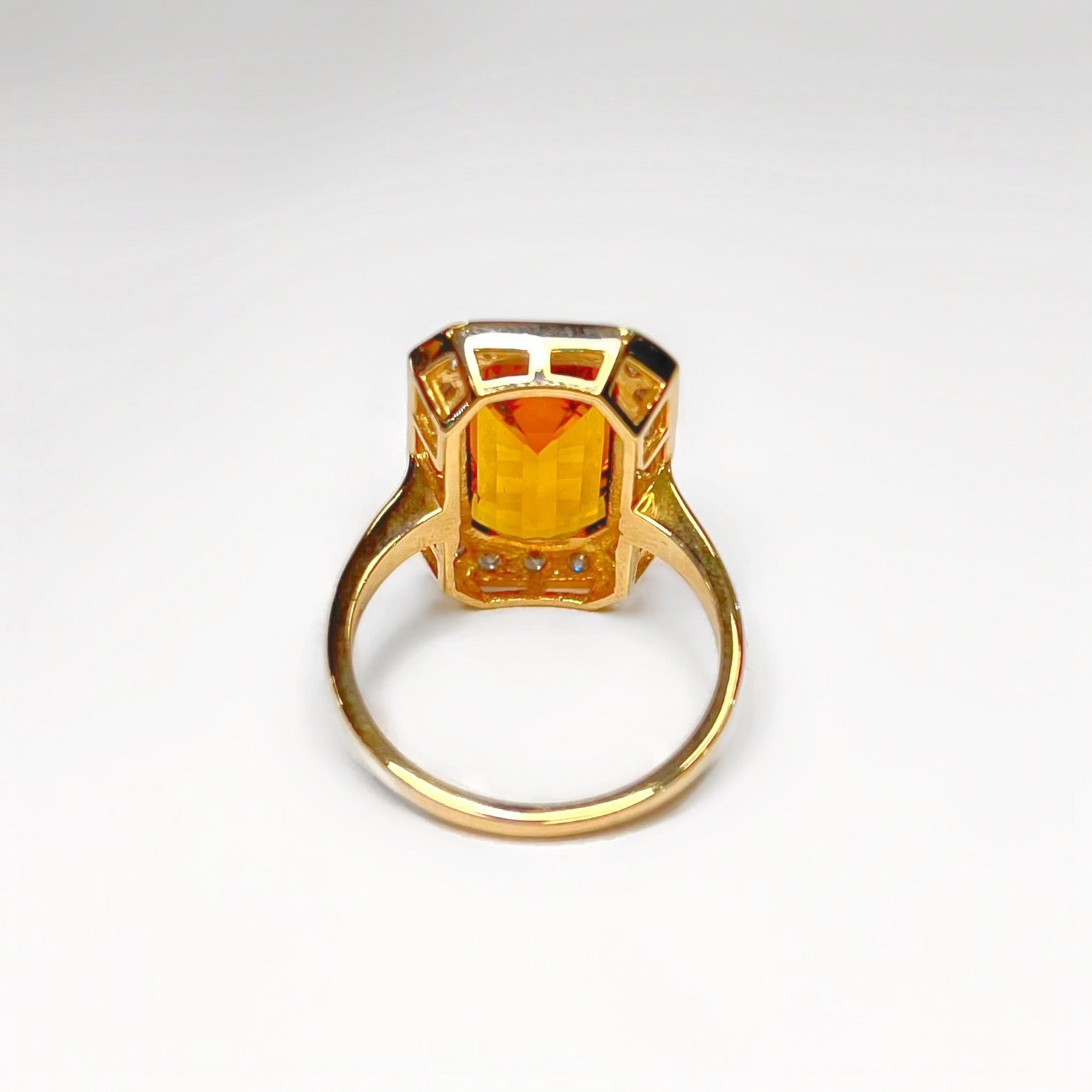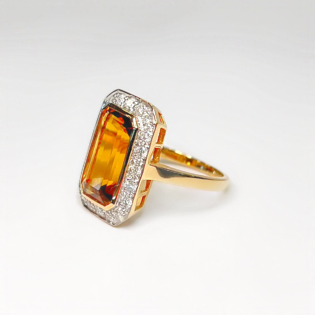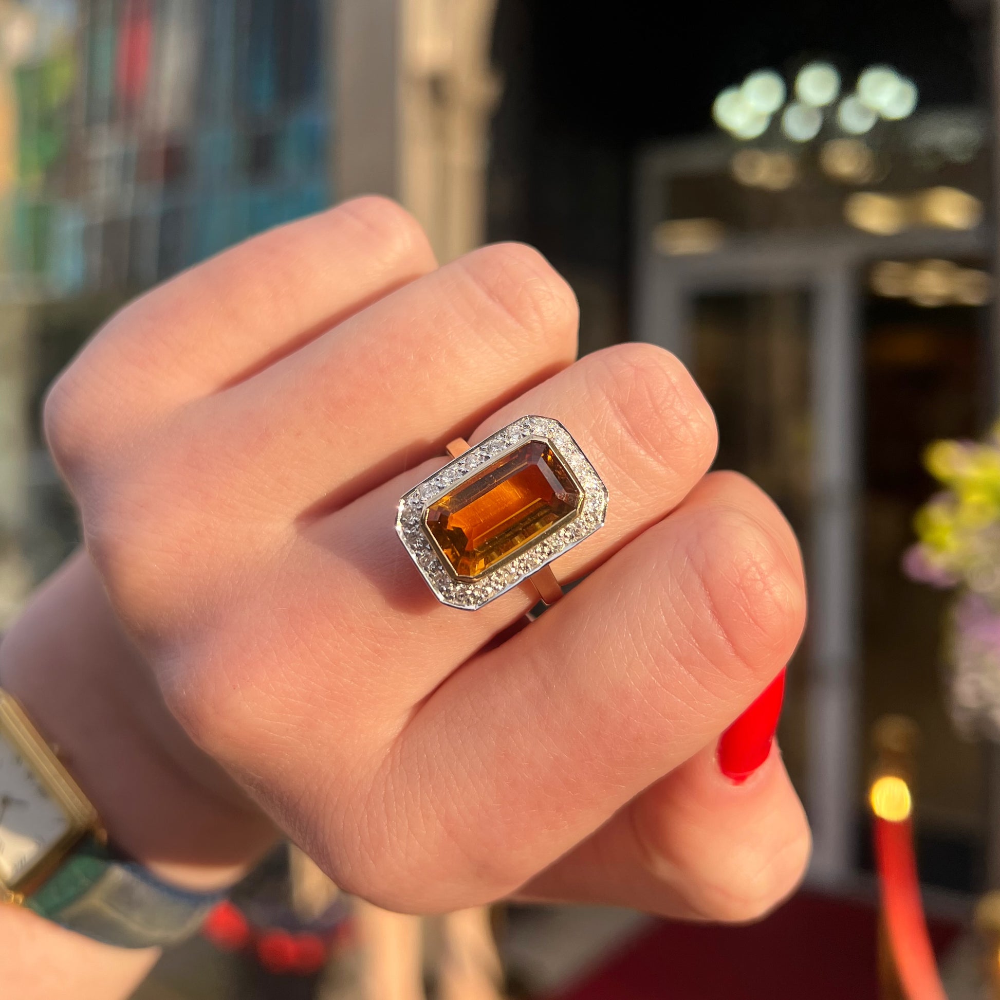 She features an autumnal, warming, emerald-cut madeira citrine bezel set securely into fine, classic 9ct yellow gold to compliment the burnt orange hue of the stone.