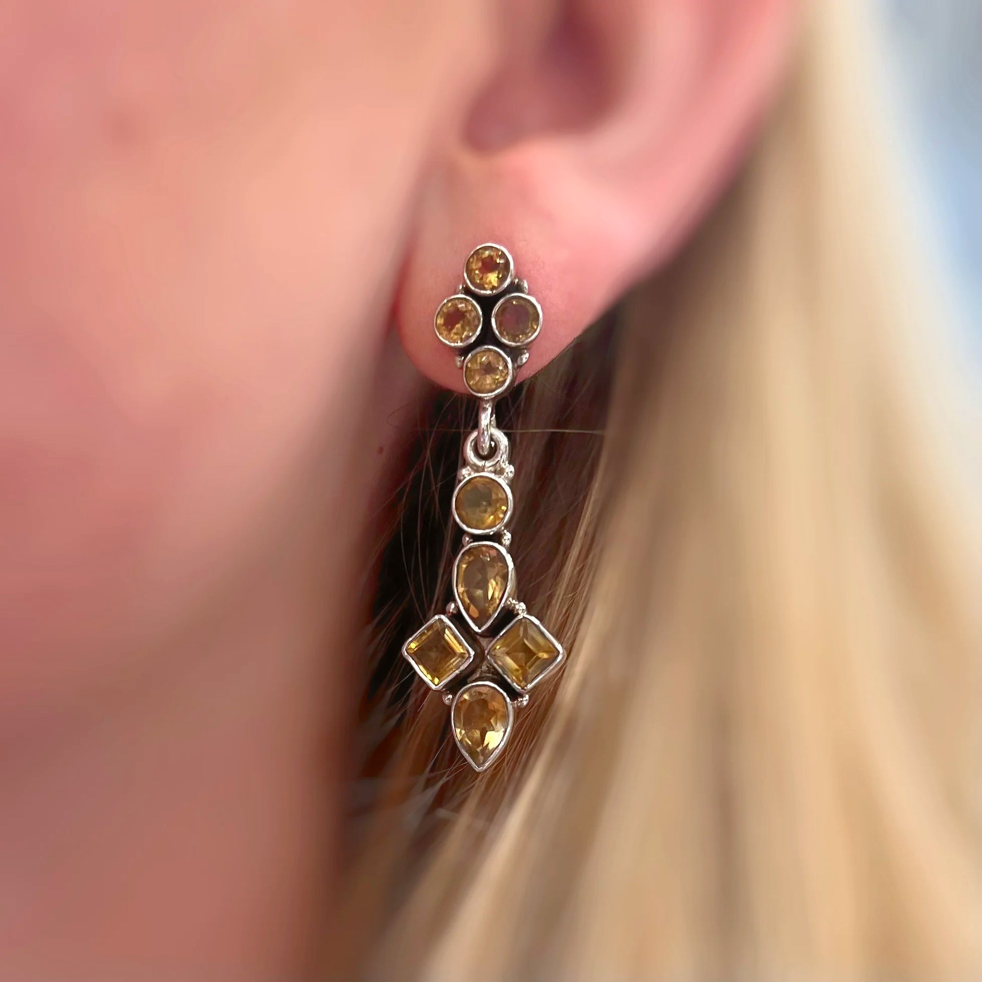 These earrings feature sunny yellow citrine gemstones, of various cuts, bezel set into sterling silver. These earrings feature oxidised detailing to add depth and structure into the design.