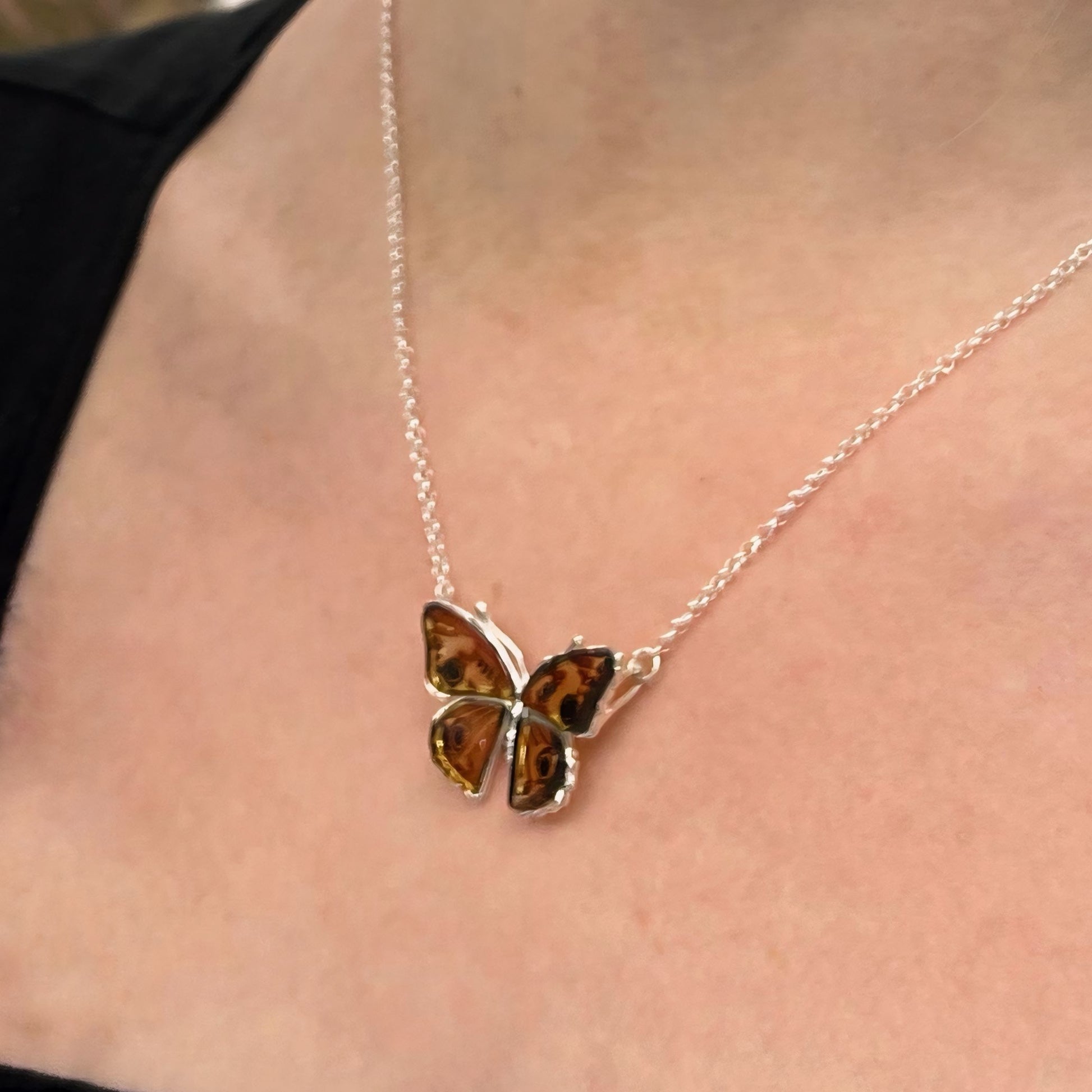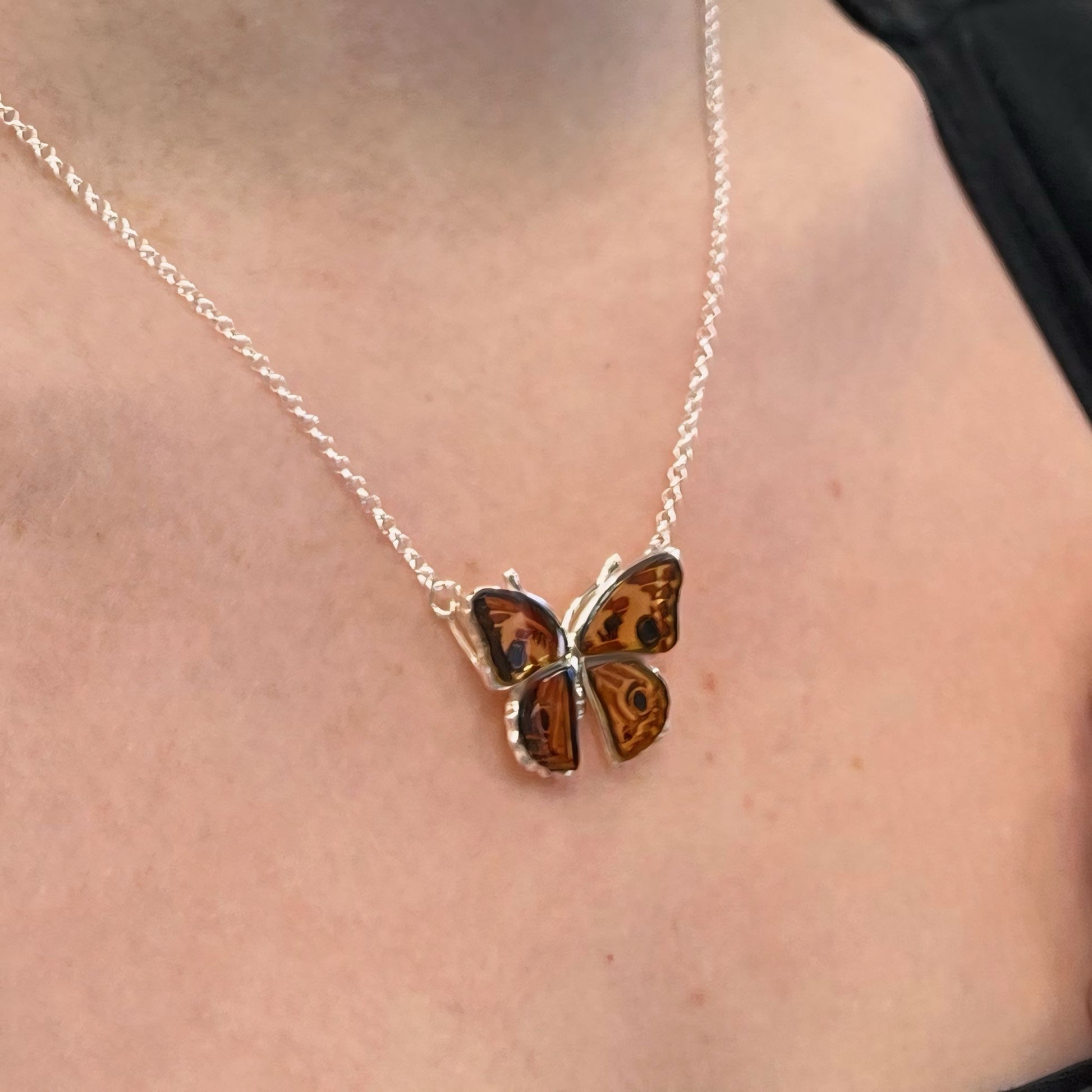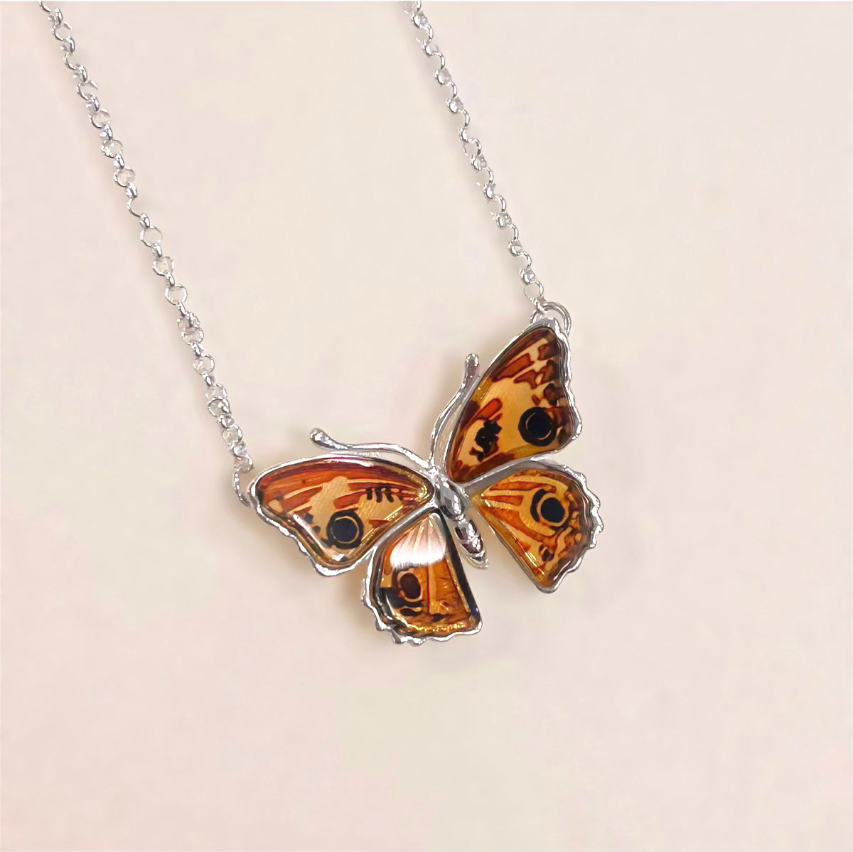 Sterling Silver Amber Peacock Pansy Butterfly Necklace