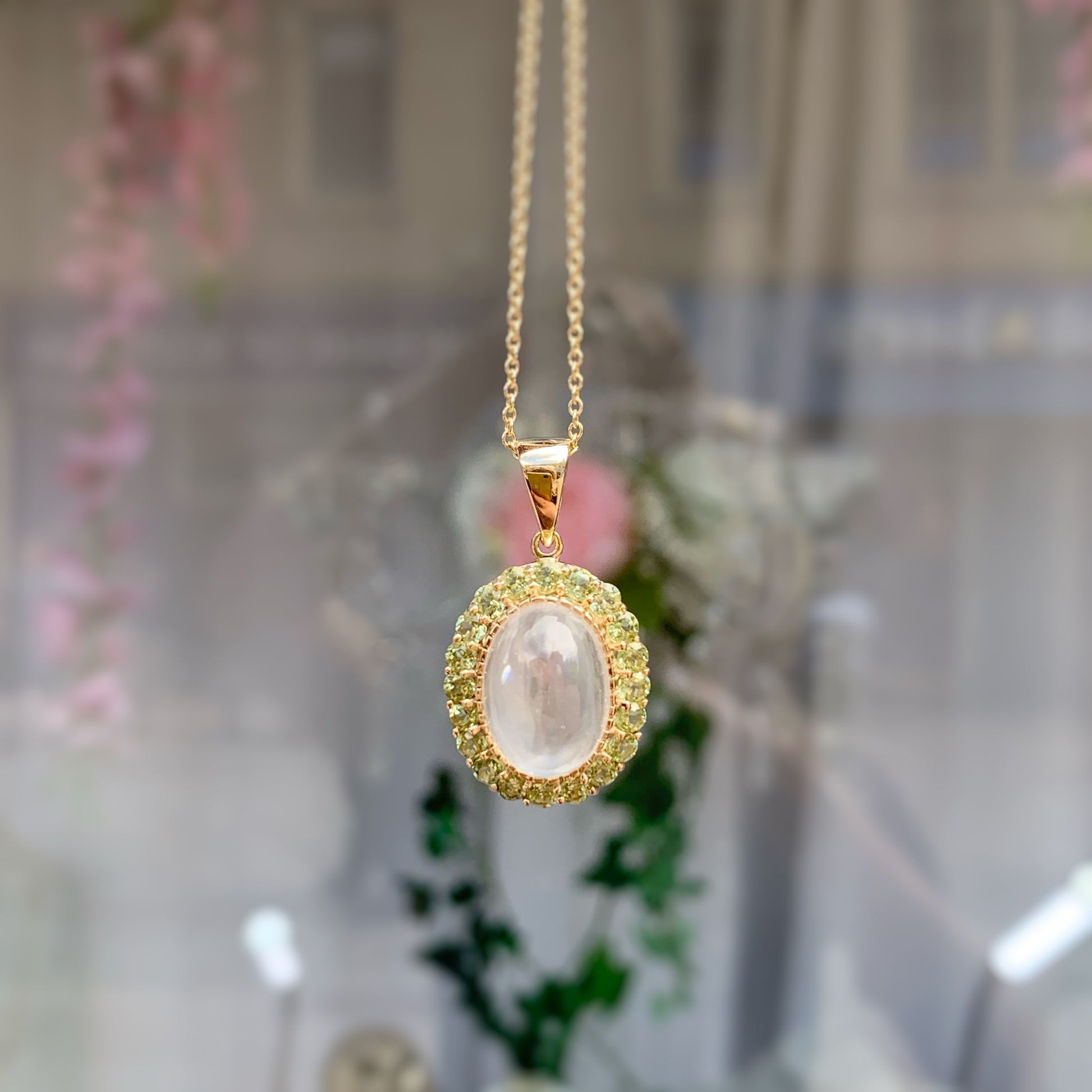 9ct Yellow Gold Moonstone and Peridot Halo Necklace