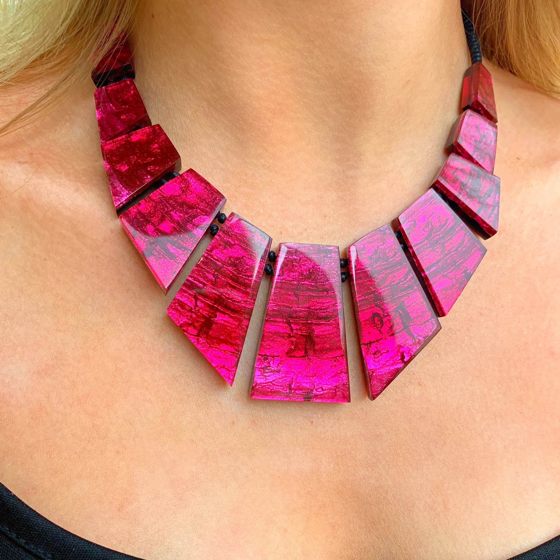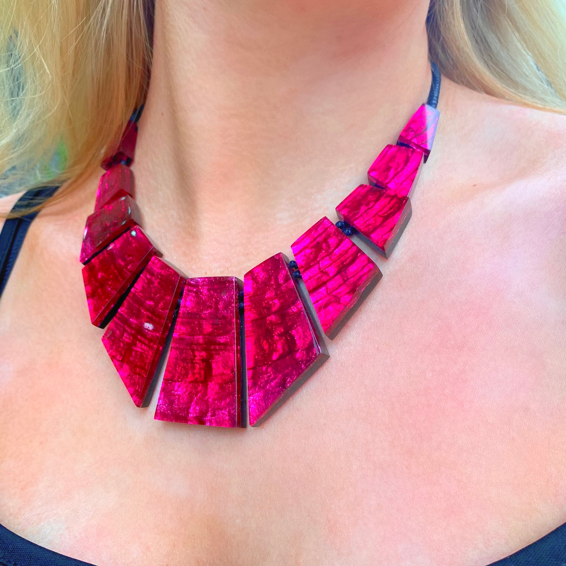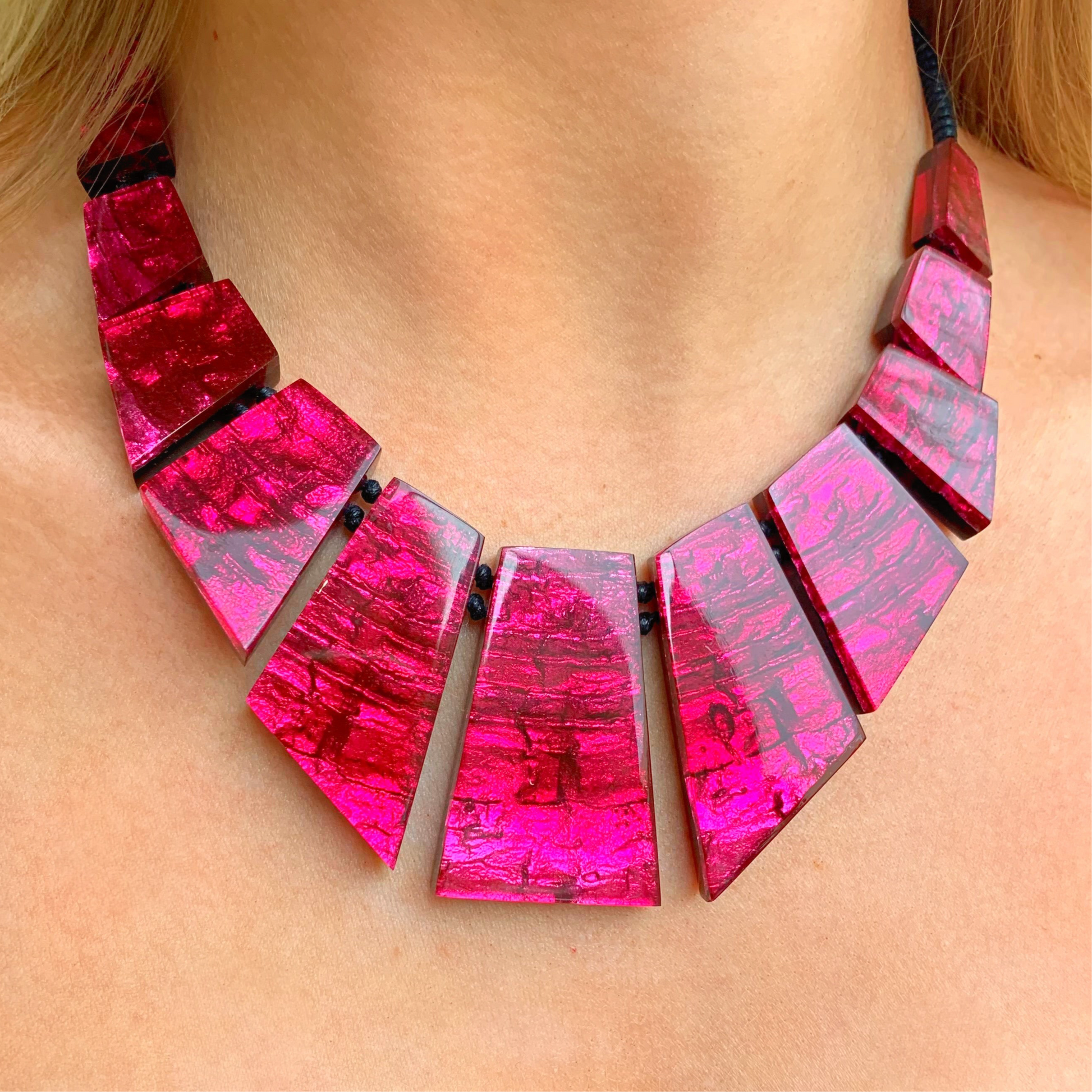 This chunky statement necklace features a graduating arrangement of candy pink geometric resin drop pendants, each drop is knotted in-between to ensure the necklace is secure and sits comfortably on the neckline. To finish, it features a lobster clasp and a chain extender meaning the necklace can be worn at any length between 16 and 18 inches. .