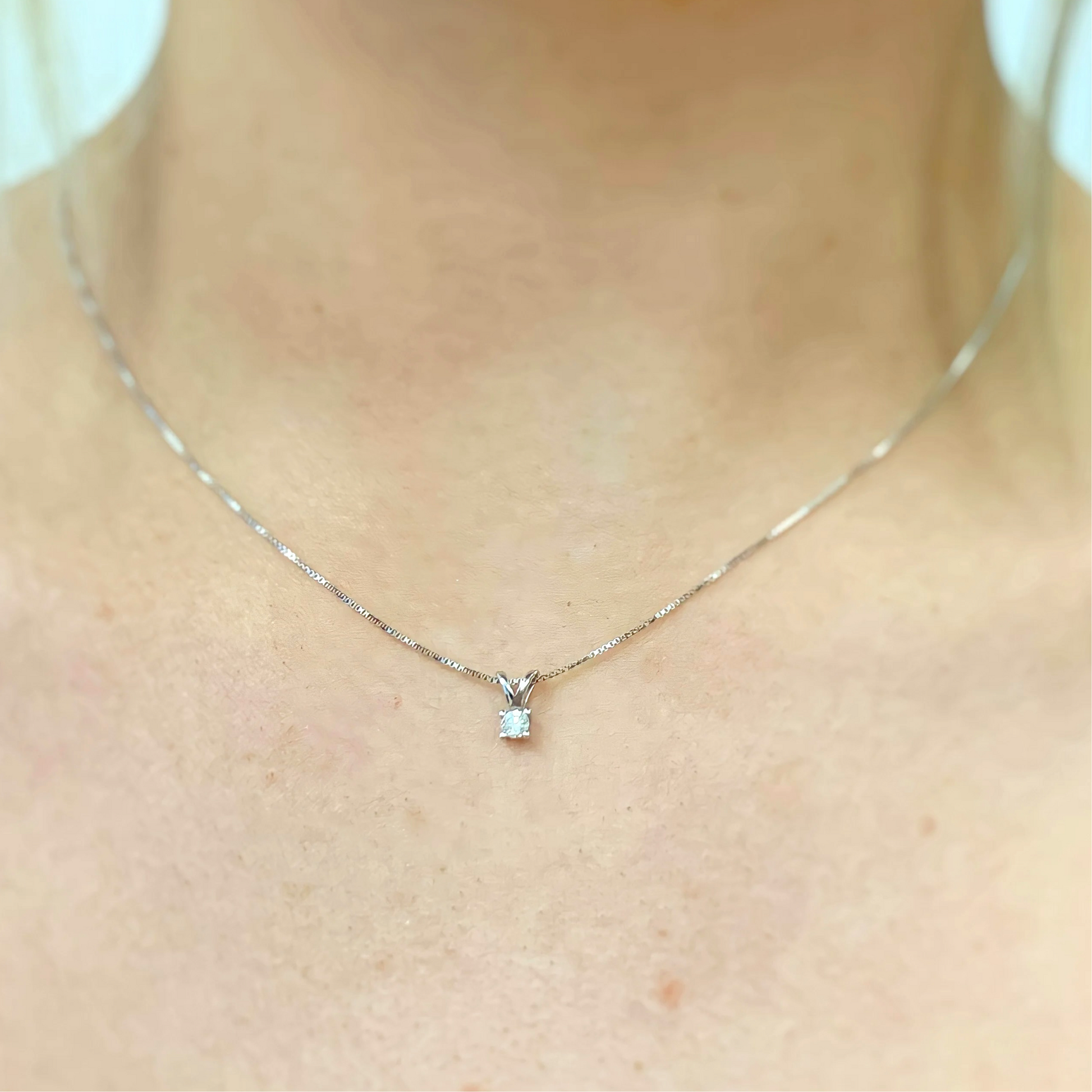 Its timeless design features a 0.15ct. brilliant-cut, round Diamond, expertly claw set into a four-prong setting to give that classic finish. This sweet piece would make a brilliant everyday necklace and effortlessly layers with your other chains.