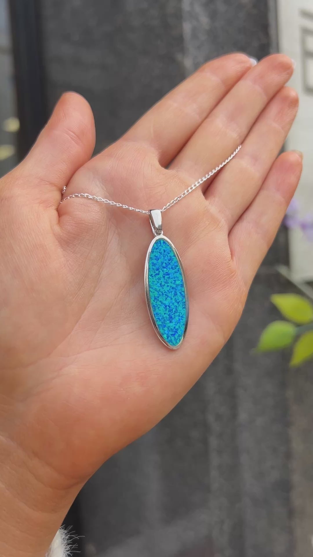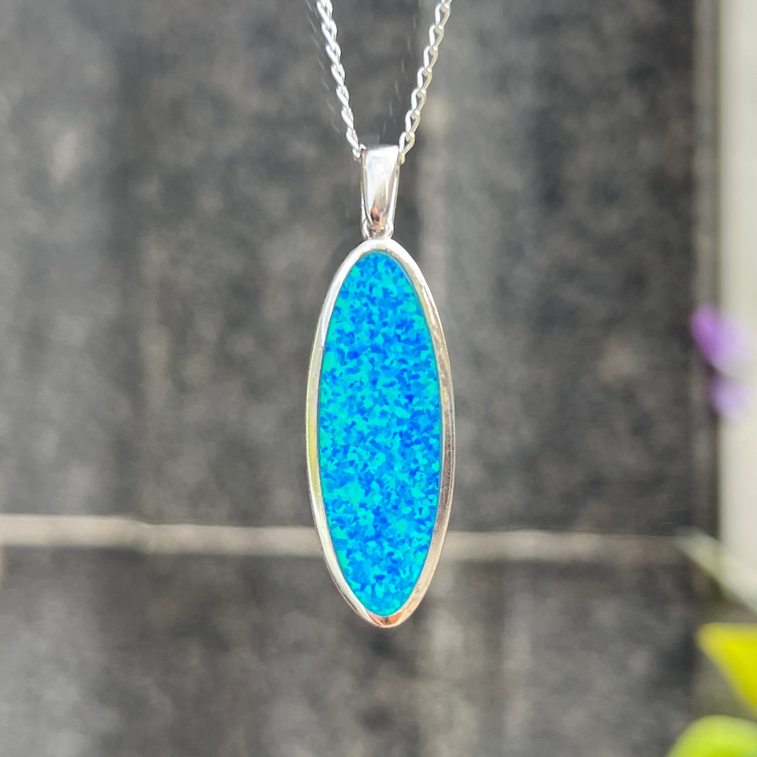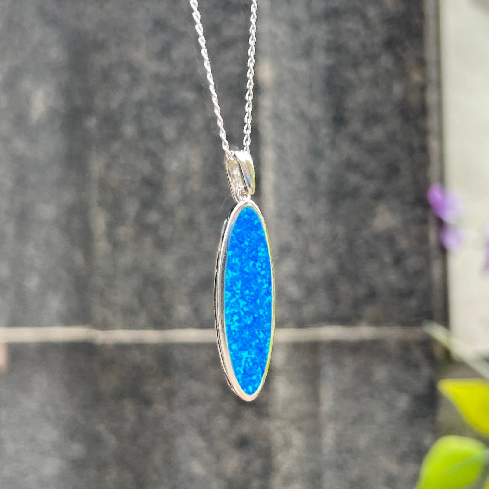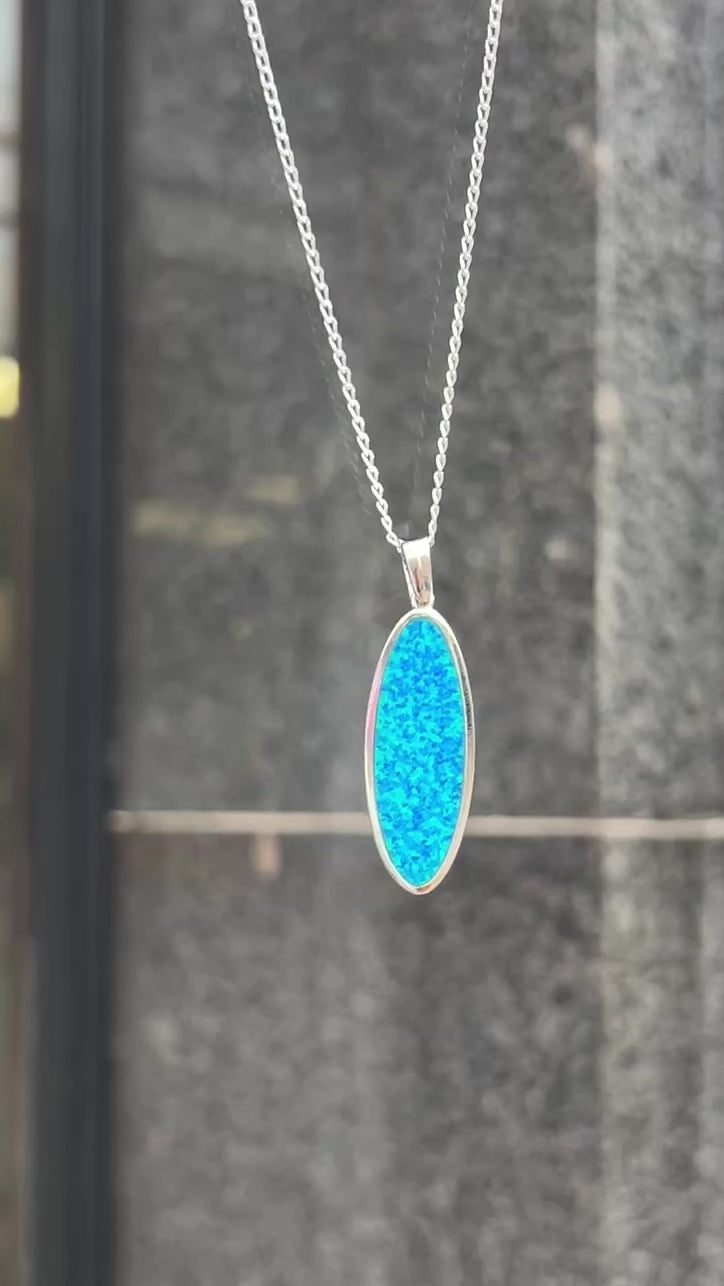 This striking pendantย features one bezelย set flat syntheticย blue oval cut opal set in sterling silver.
