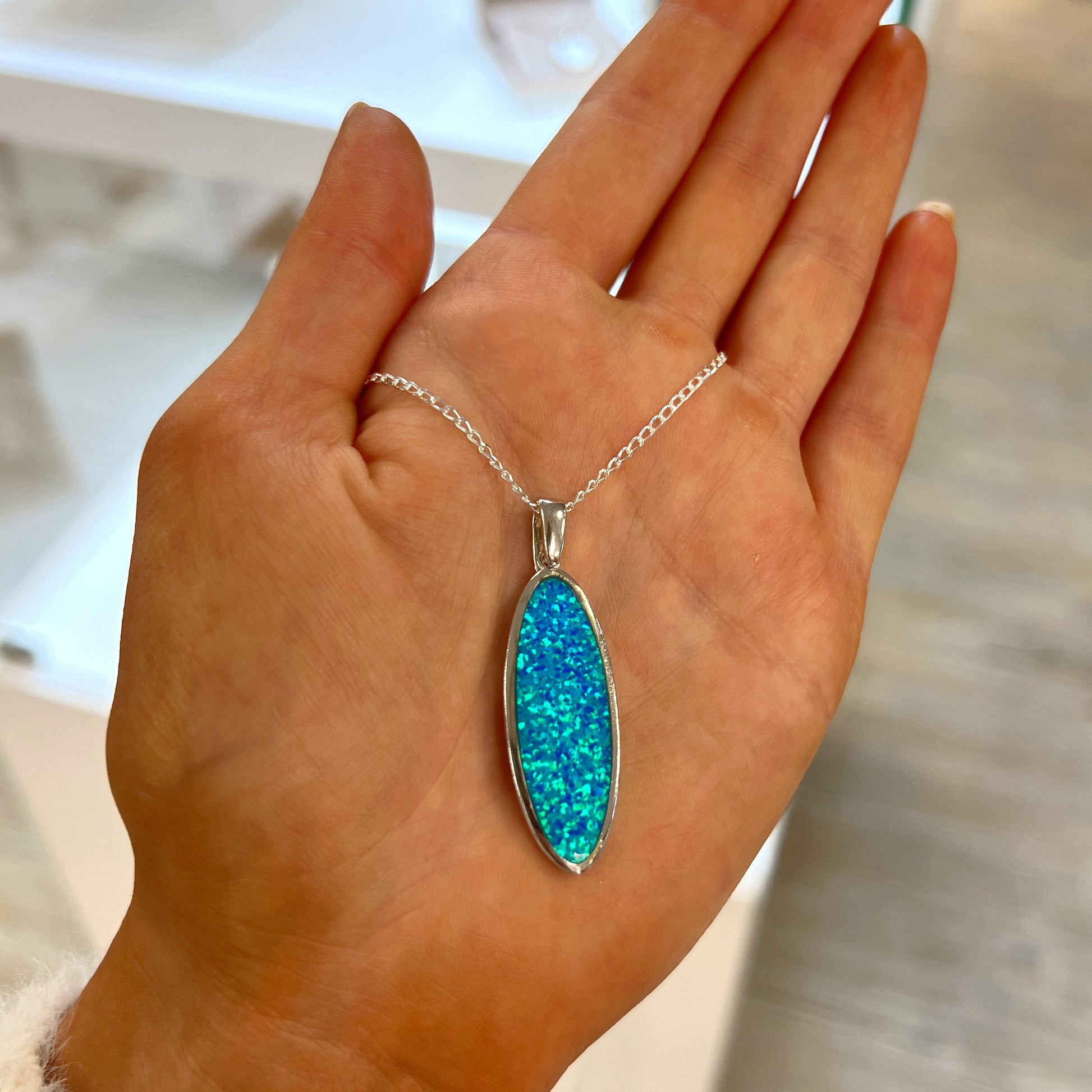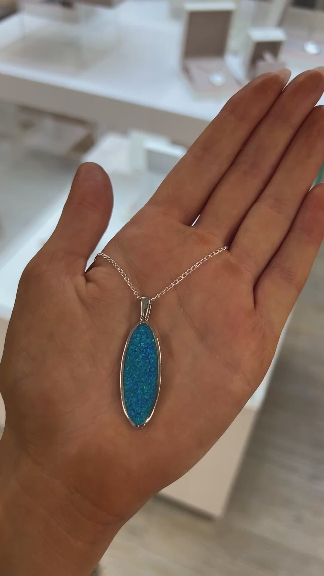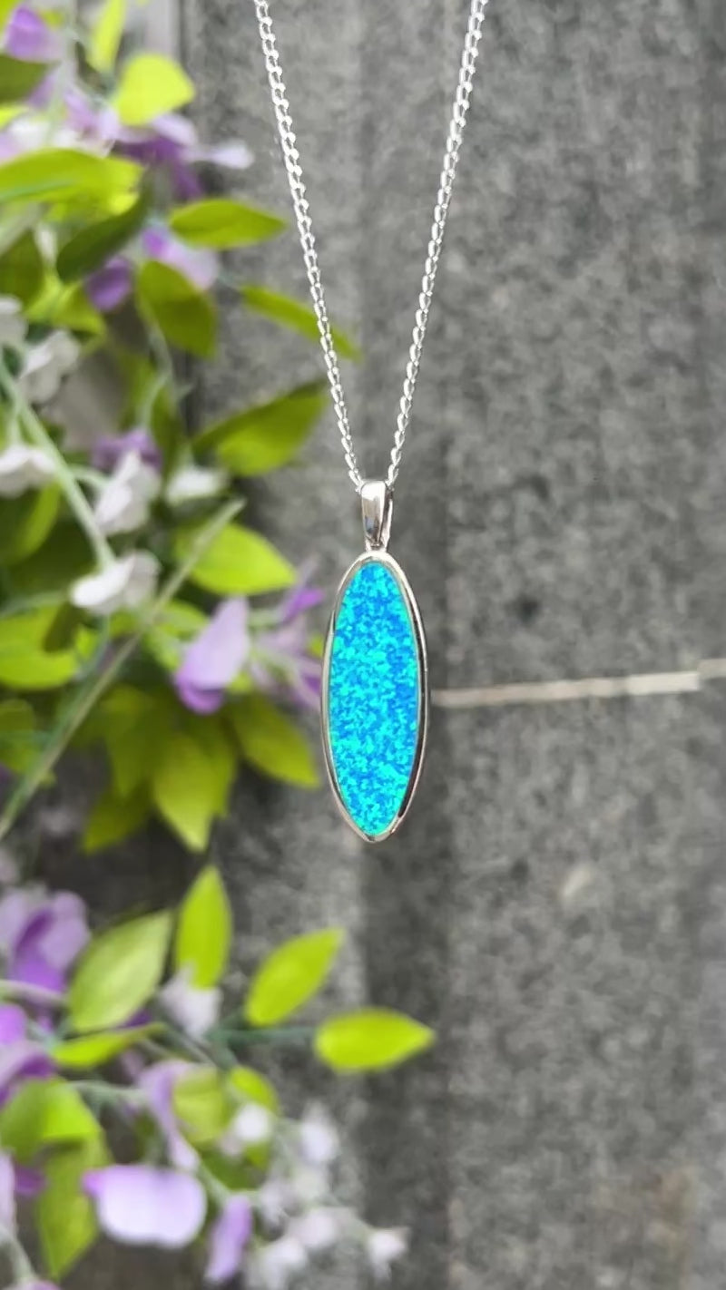 This striking pendantย features one bezelย set flat syntheticย blue oval cut opal set in sterling silver.