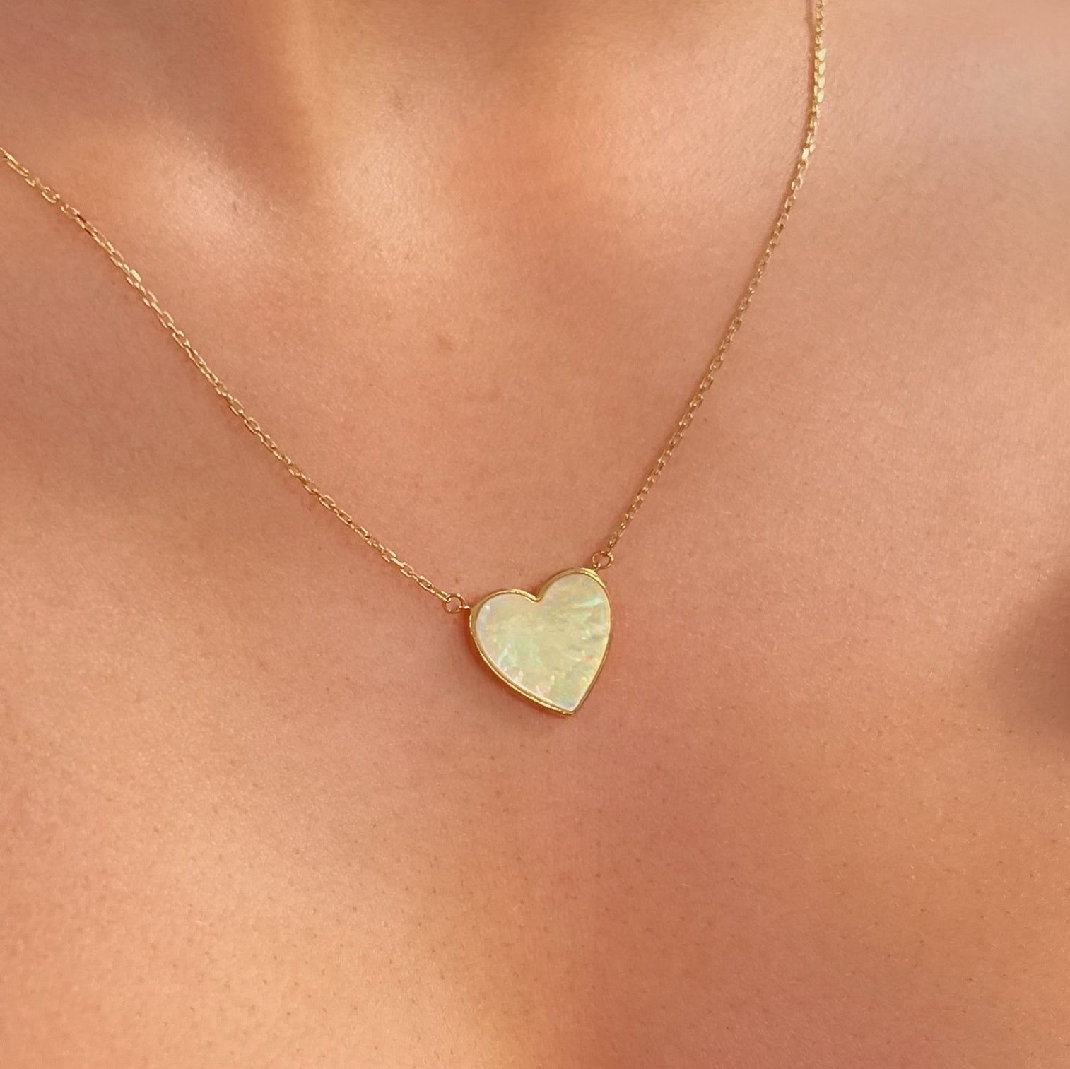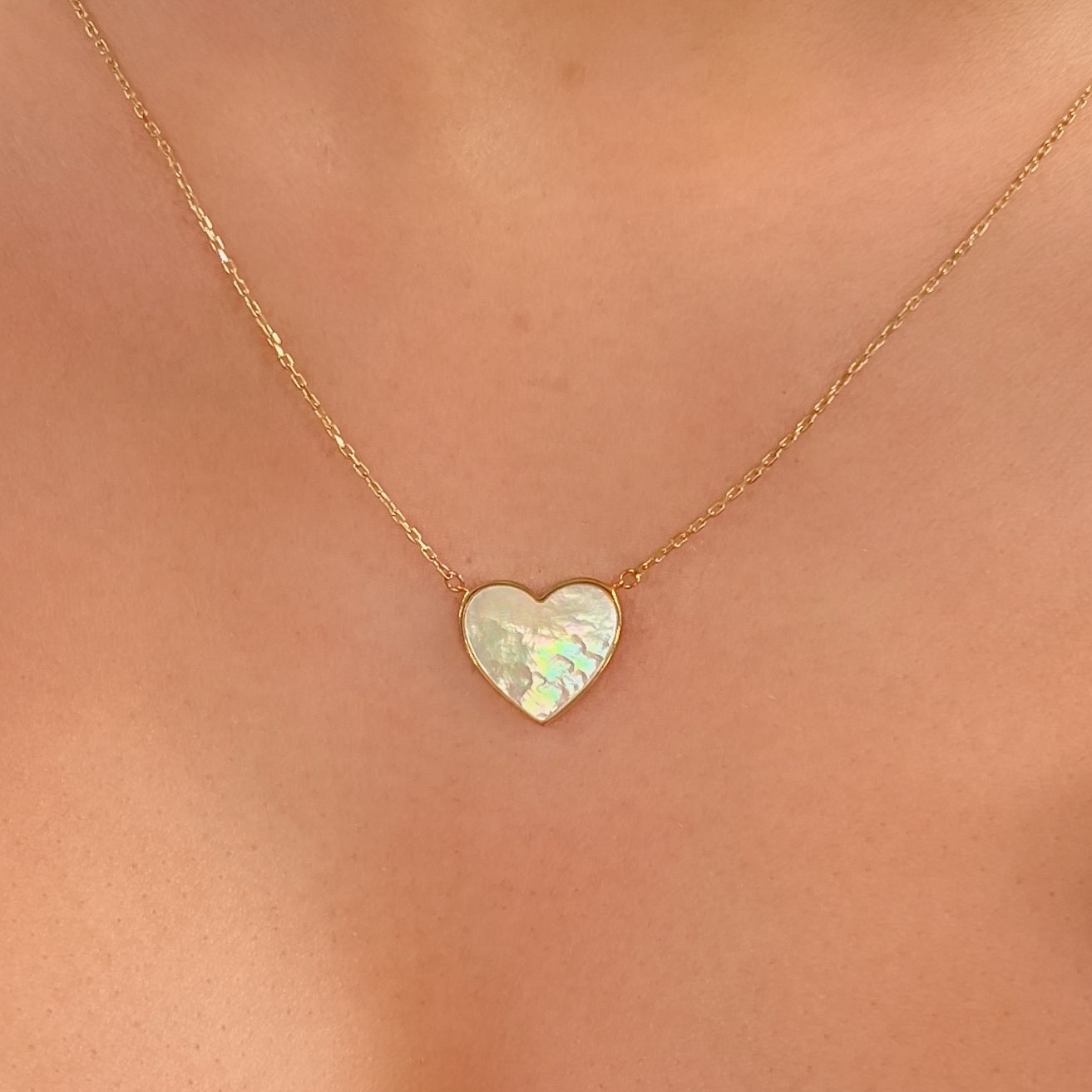 A shimmering heart-shaped slice of mother-of-pearl is expertly bezel-set in 9ct yellow gold, enhancing the stone’s natural iridescence and giving it a designer-inspired finish.