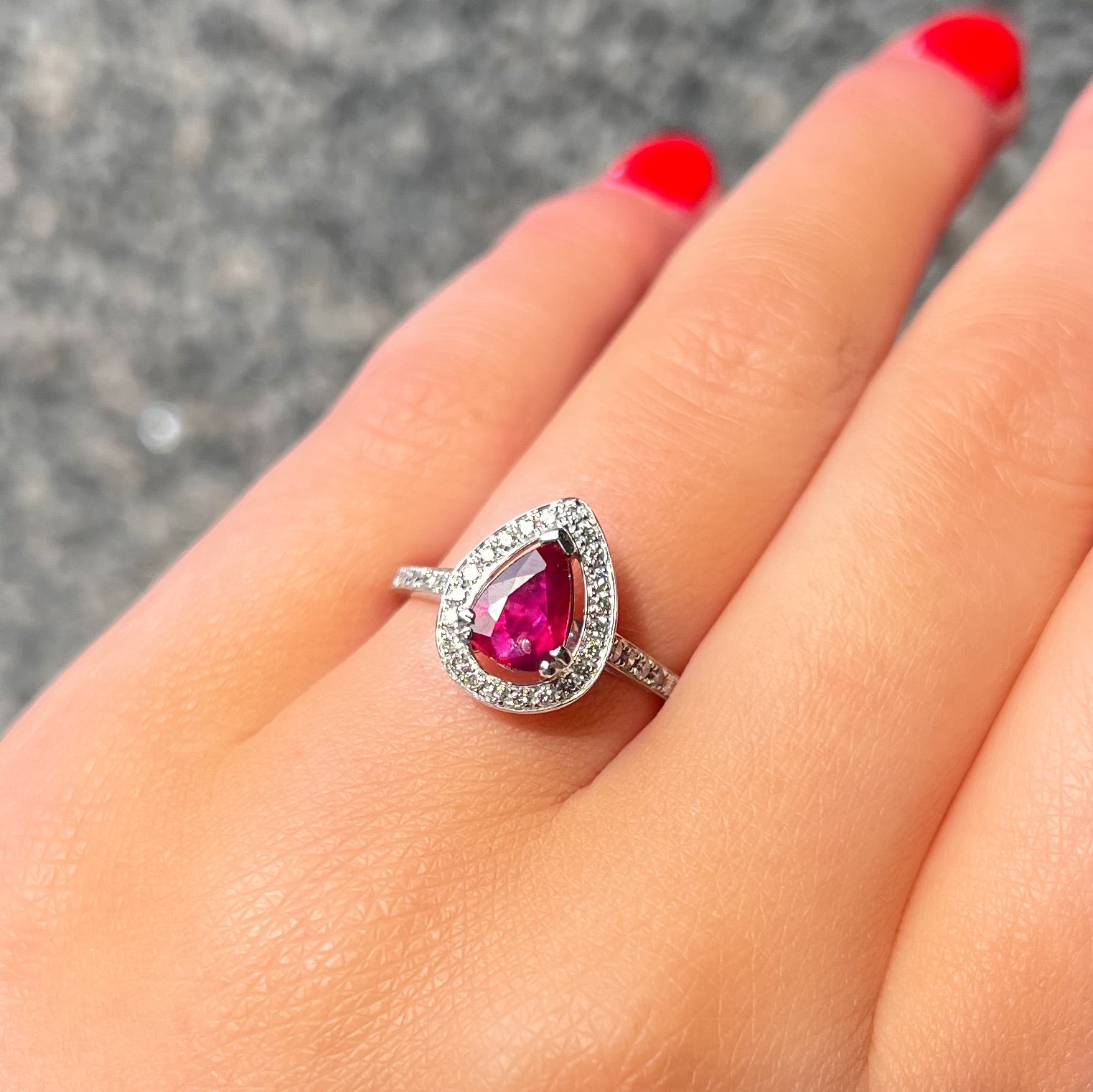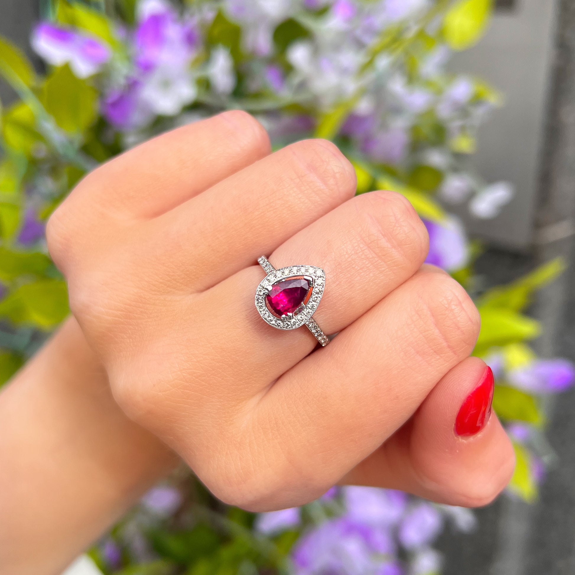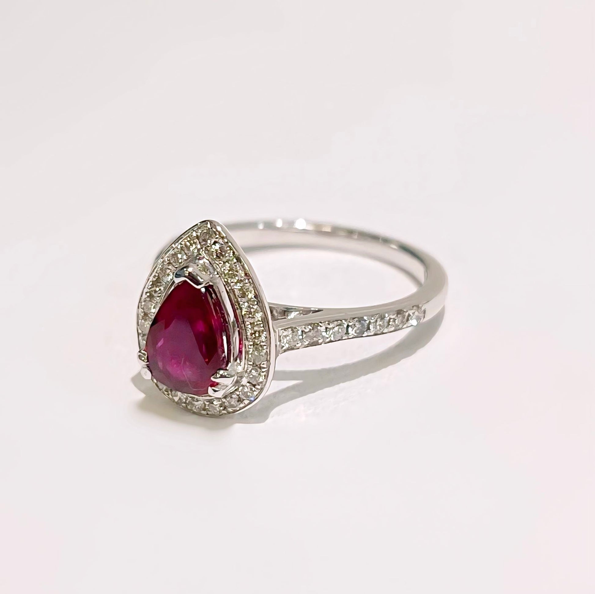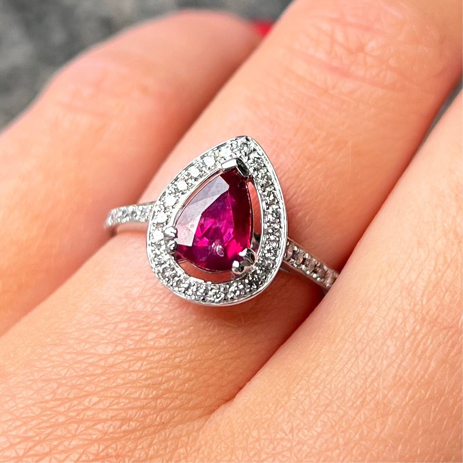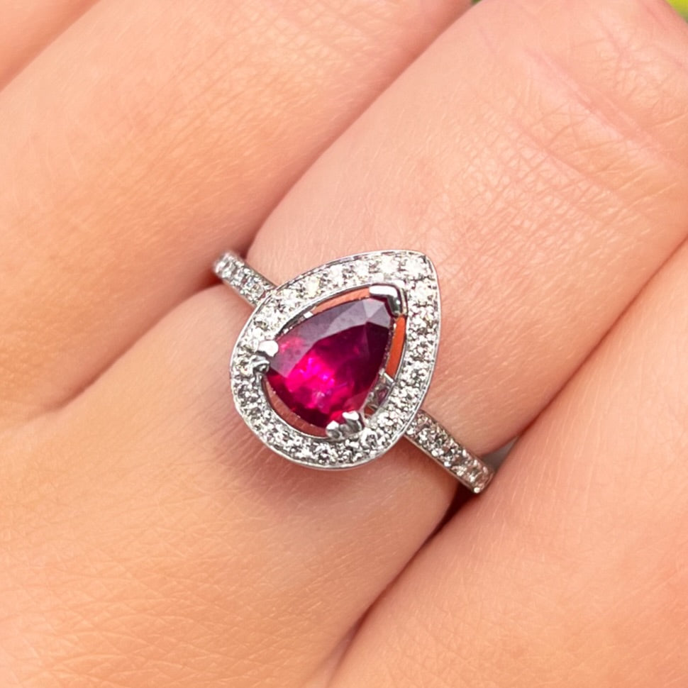Expertly made in 18ct white gold, this ring features a 1.2 ct pear-shaped ruby of a fierce fuschia hue.