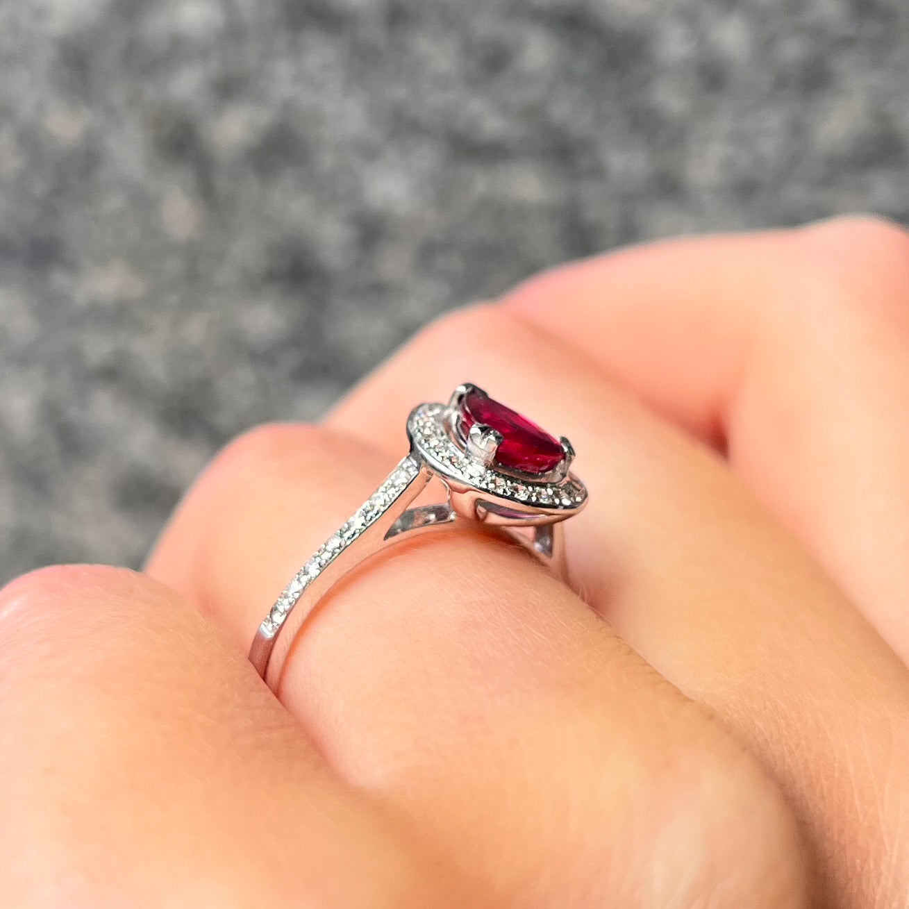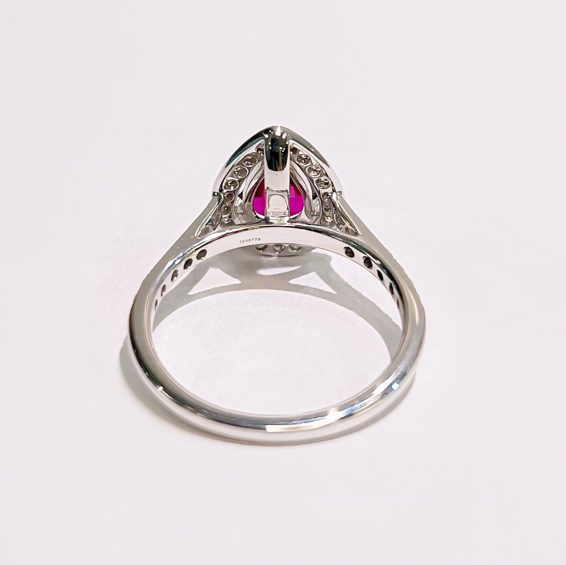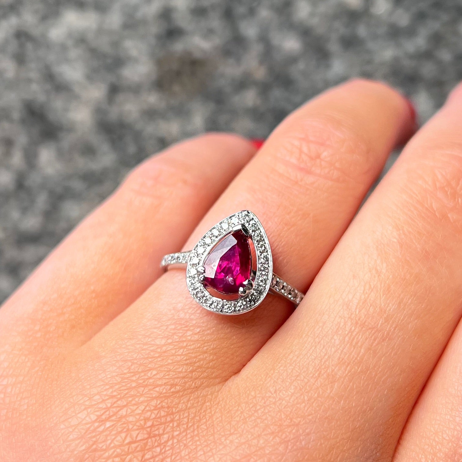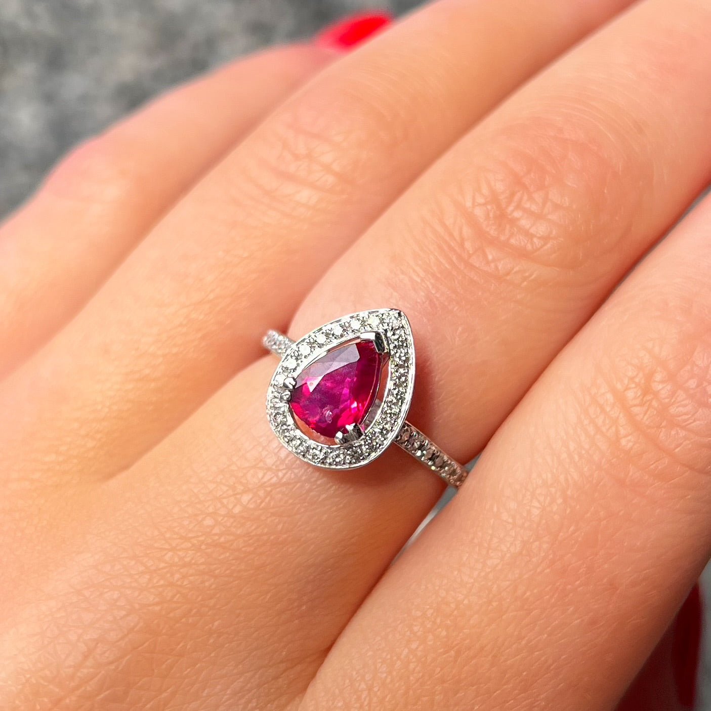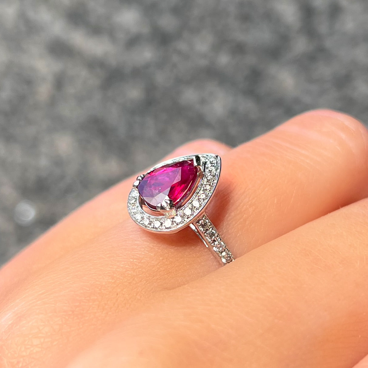 Expertly made in 18ct white gold, this ring features a 1.2 ct pear-shaped ruby of a fierce fuschia hue.
