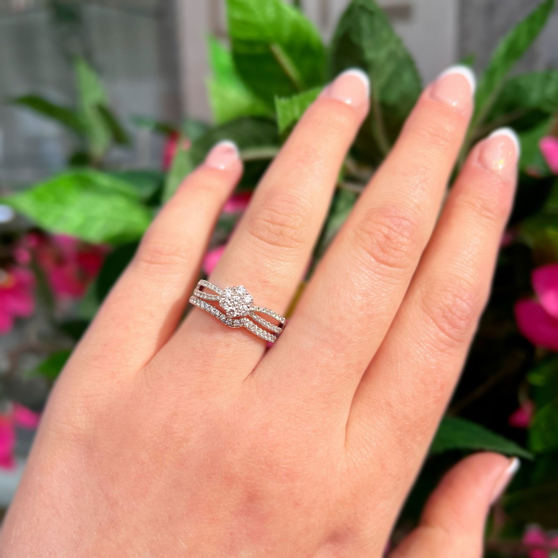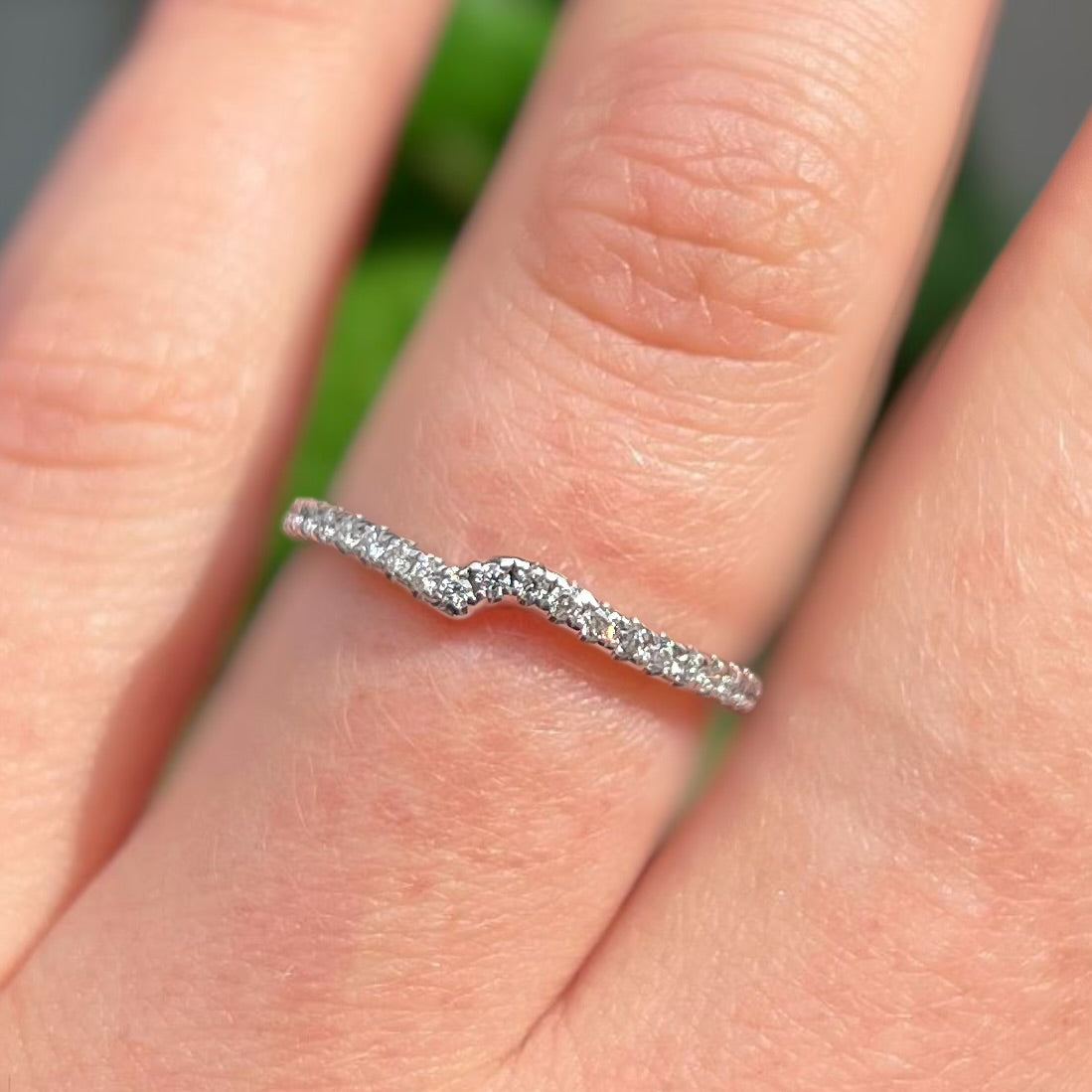 A beautiful band ring with a twist! Crafted in shining platinum, she features natural mined diamonds expertly pavé-set into a dainty half-eternity design with a gentle wave — making it a perfect shape to fit alongside a wedding band. (See example in pictures)