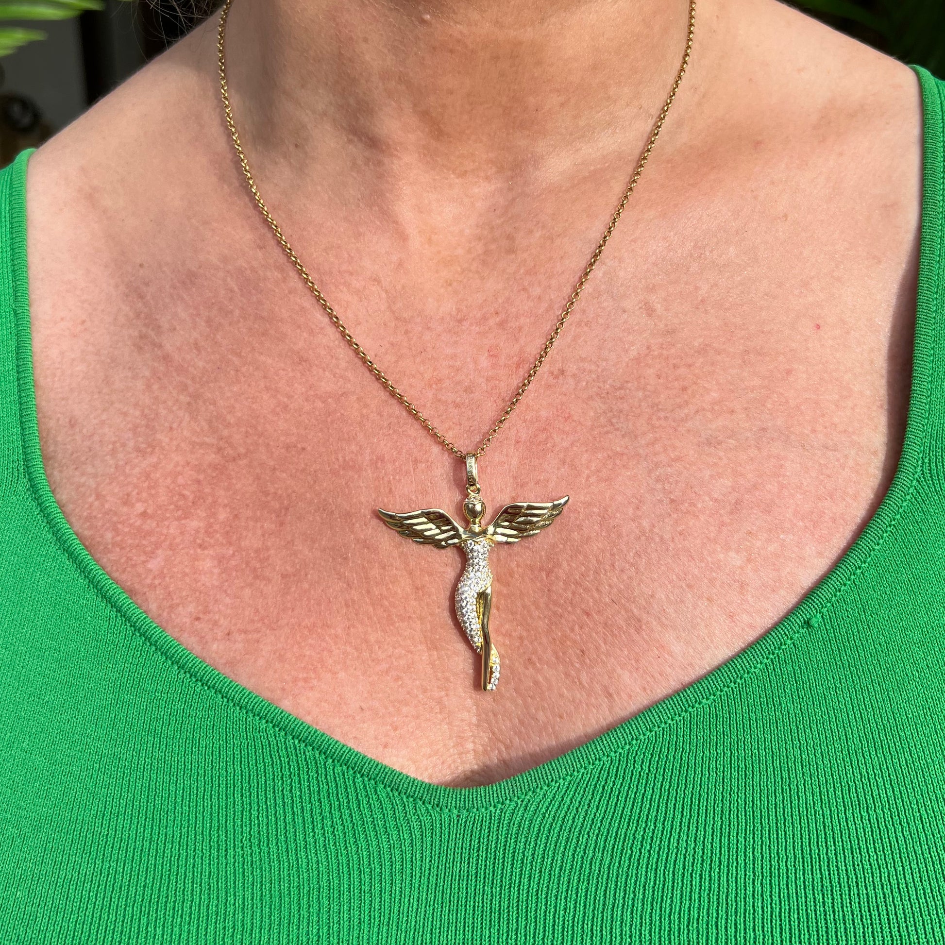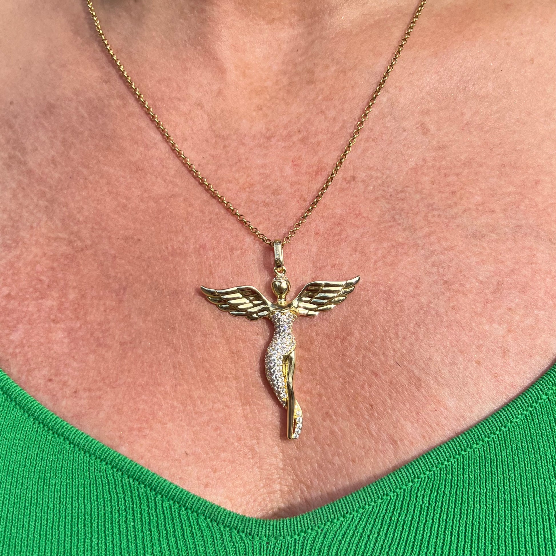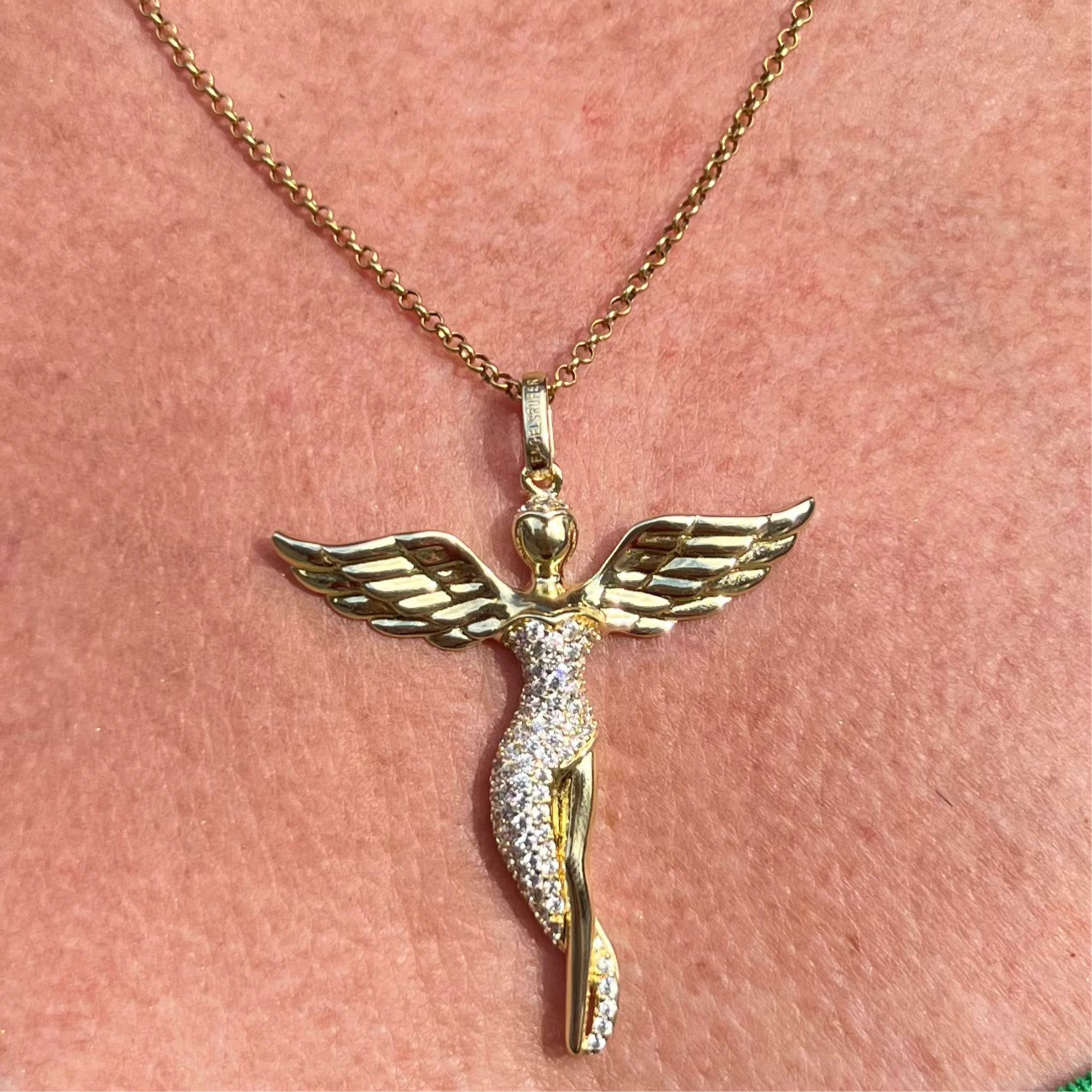 This gorgeous angel pendant from the engelstrufer brand is yellow gold plated on sterling silver and is encrusted with cubic zirconia stones to make it glitter. This is the large size.