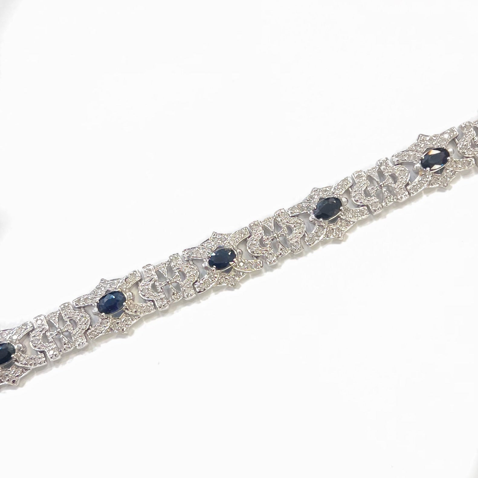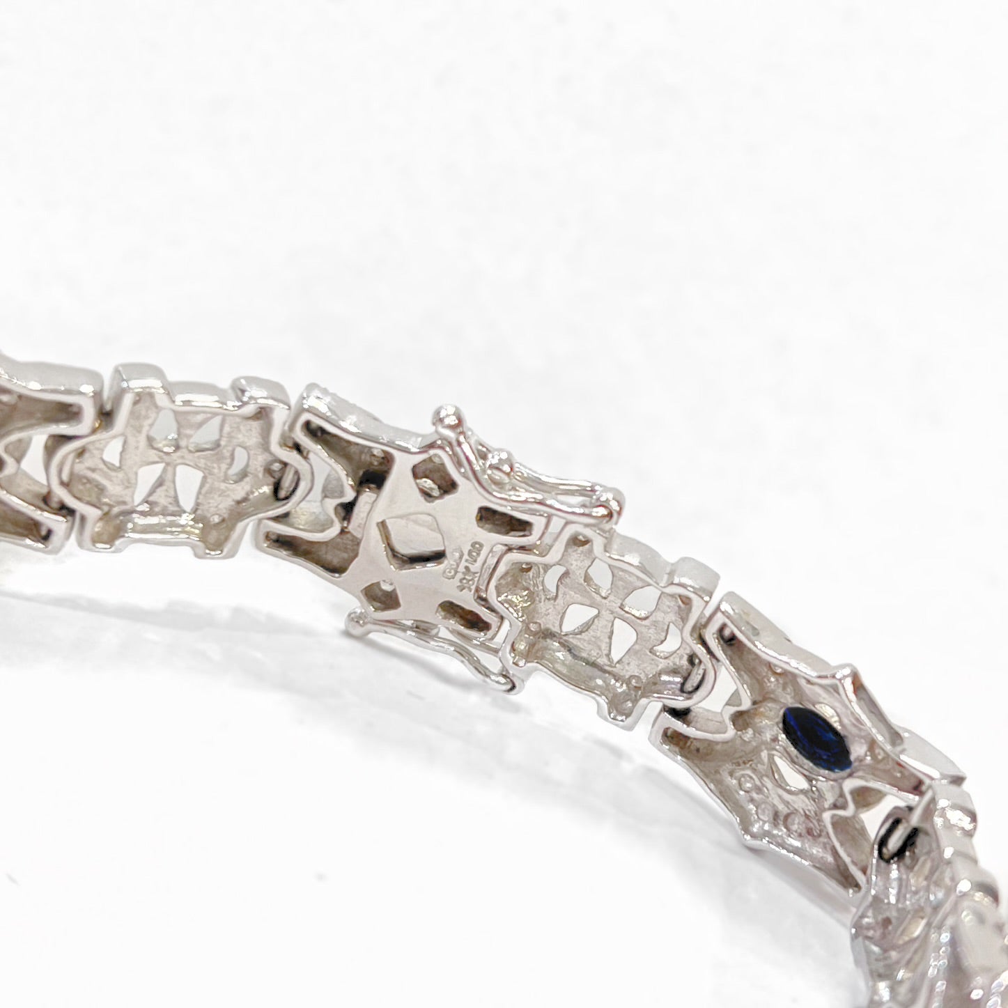 Expertly crafted in gleaming 18ct white gold, this elegant bracelet features eight detailed links, each showcasing a deep blue oval-cut faceted natural sapphire claw set at the centre. Every stone is surrounded by pavé-set natural diamonds for that classic sparkle.