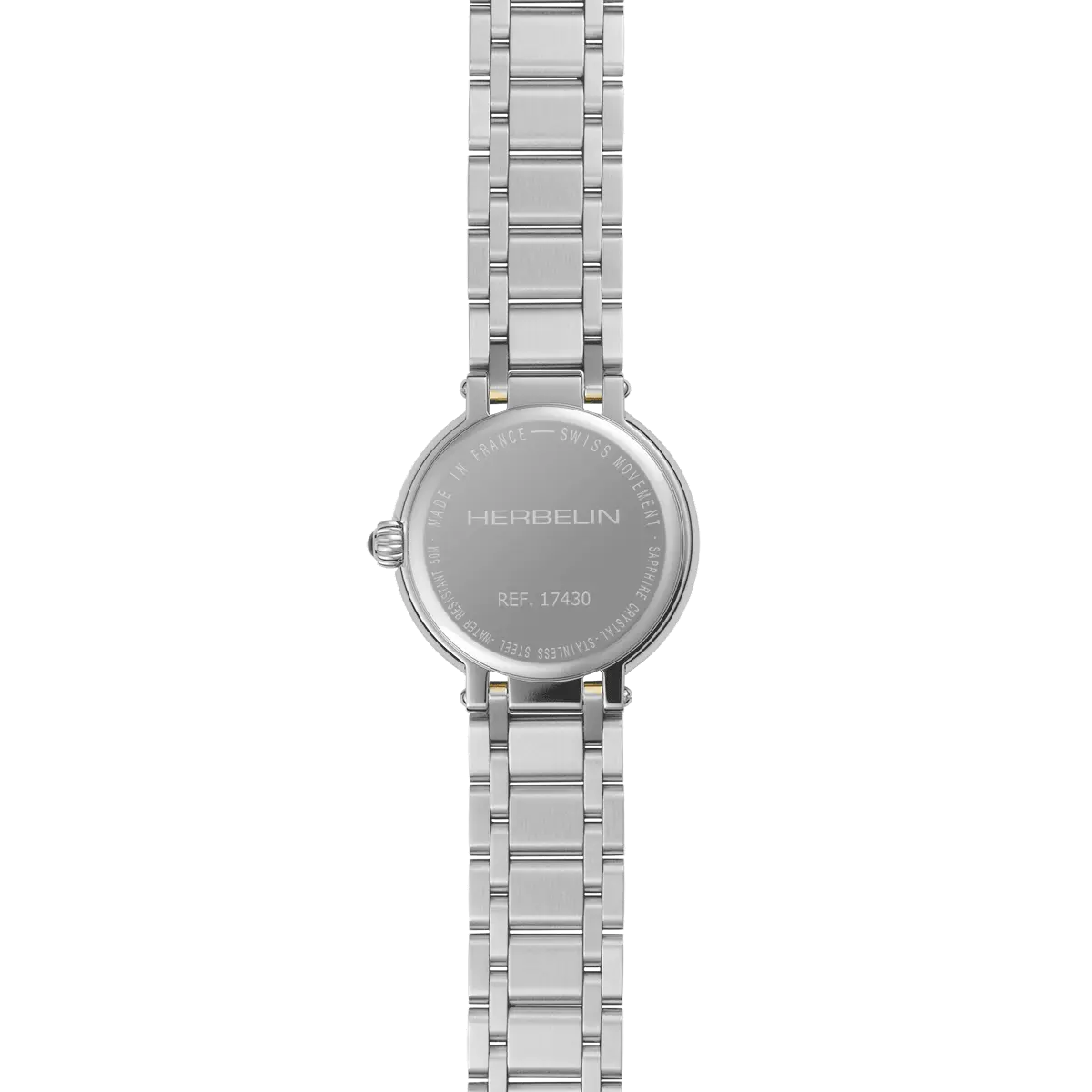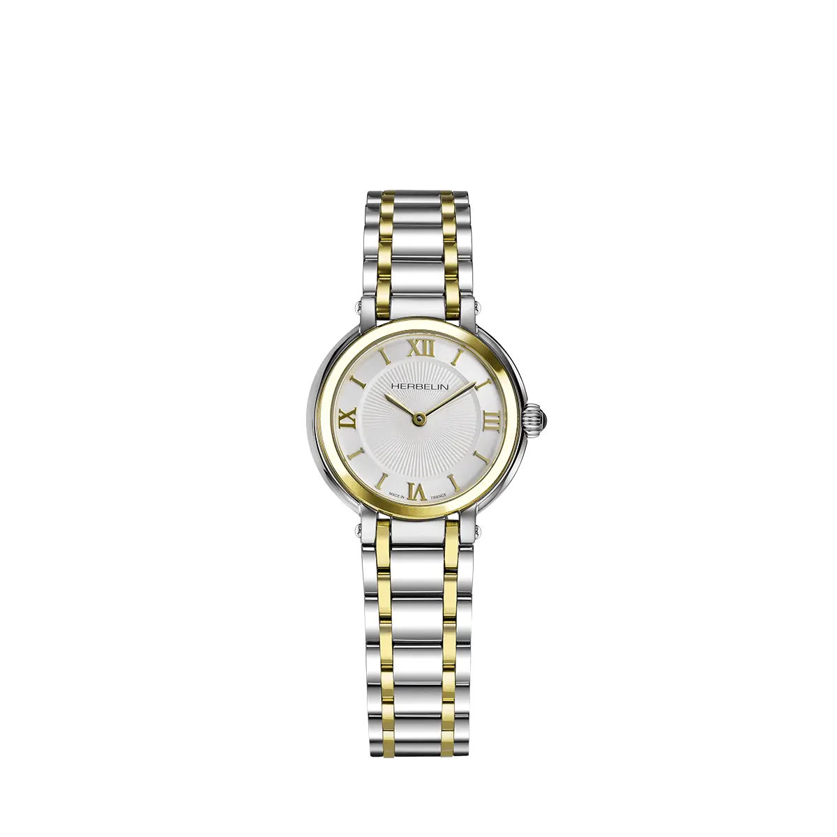 Galet is the new collection from the Herbelin watchmaking house. This model with automatic movement is a mixture between classicism and modernity. A true wristwatch that will elegantly dress up women's wrists. With a genuine mother-of-pearl dial punctuated with Roman numerals, Galet is a delicate and refined watch. The mix of yellow gold PVD and stainless steel brings a touch of brilliance to this model.