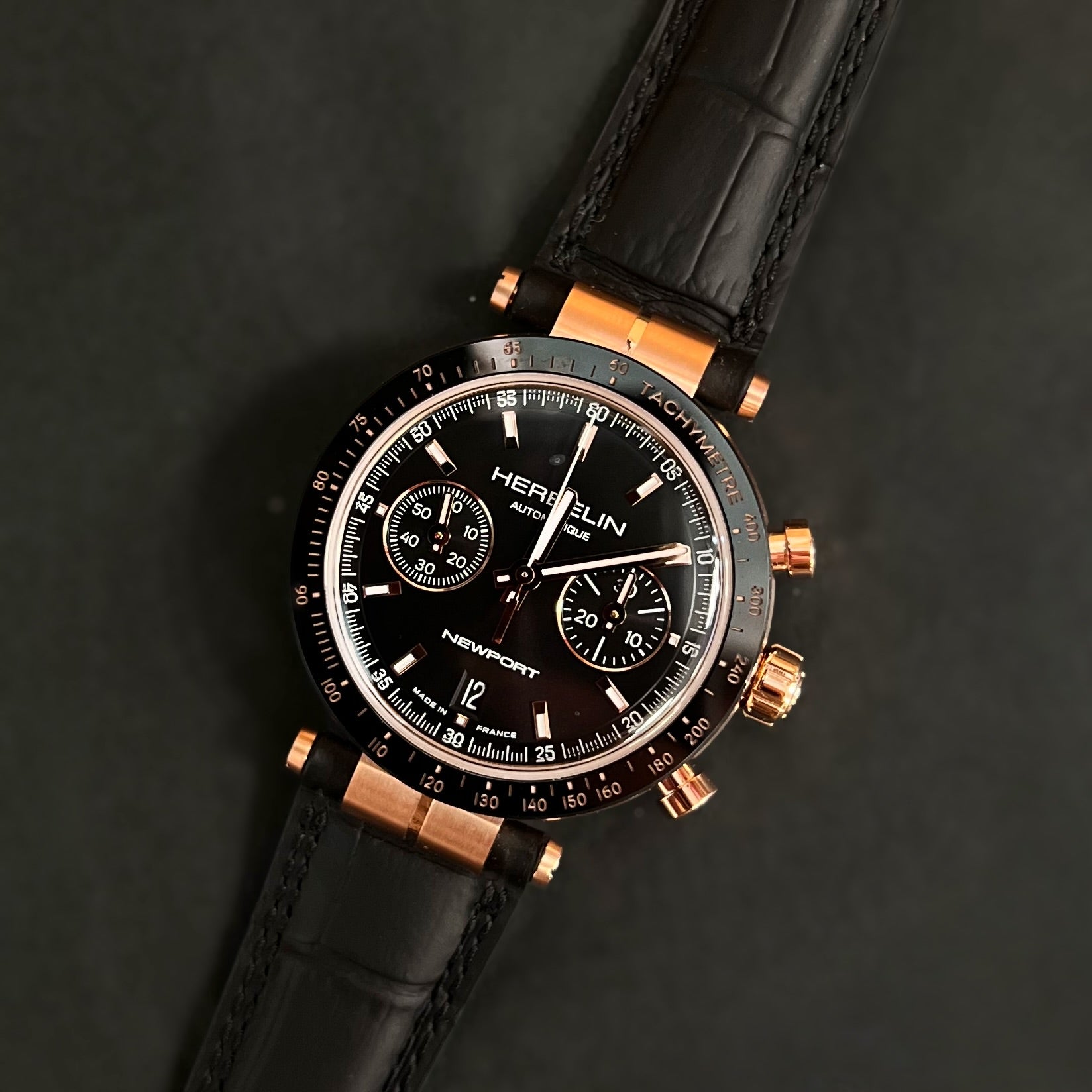 The Herbelin Newport Heritage Chronograph Limited Edition is a refined expression of French watchmaking excellence, blending iconic 1980s design with modern sophistication. Limited to just 300 pieces worldwide, this 42mm timepiece features a bold black dial with rose gold-tone accents, housed in a black and rose gold PVD-coated stainless steel case and is number 162. A black ceramic tachymeter bezel, “glass-box” sapphire crystal, and a luxurious black leather strap complete the watch’s striking, nautical-inspired aesthetic.