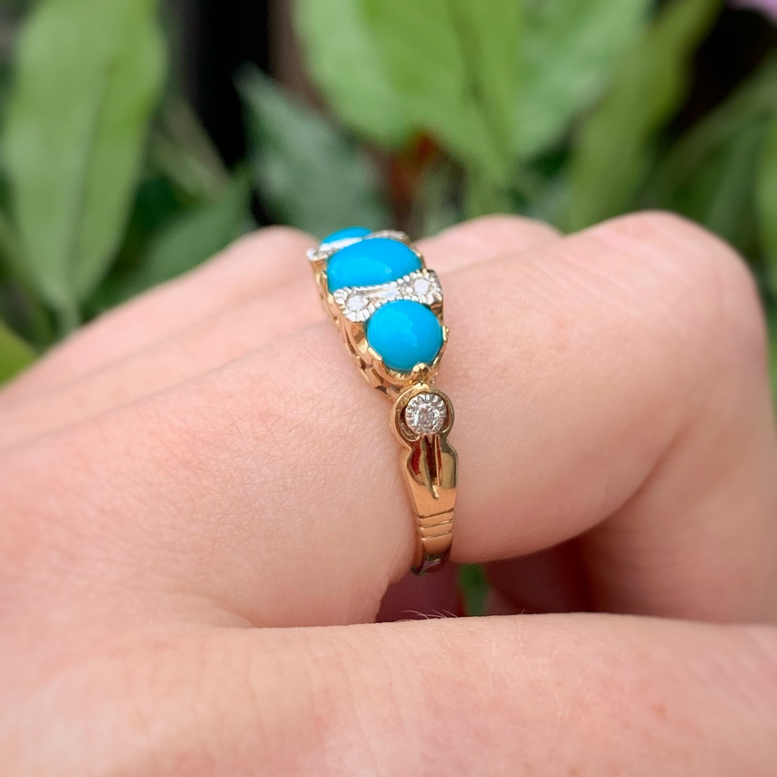 This gorgeous Edwardian ring is expertly crafted in 9ct Yellow Gold with a beautifully decorative gallery allowing light to flood in through the back of the Diamonds. She features three vibrant Turquoise gemstones beaded into an intricate band design with Diamonds interspersed in between each stone. To finish, the setting of each Diamond has been cleverly Rhodium Plated to give the illusion of a larger size.