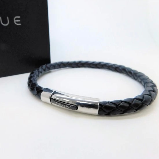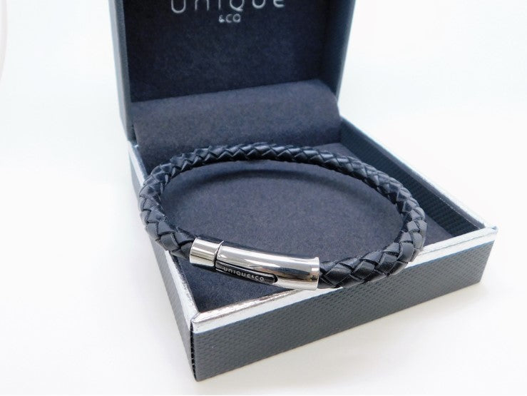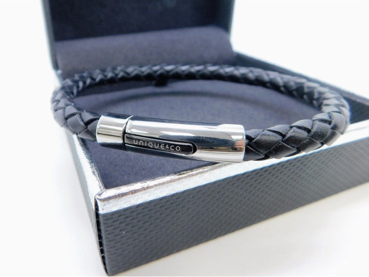 Mens UNIQUE & Co. black leather bracelet with silver and black steel clasp