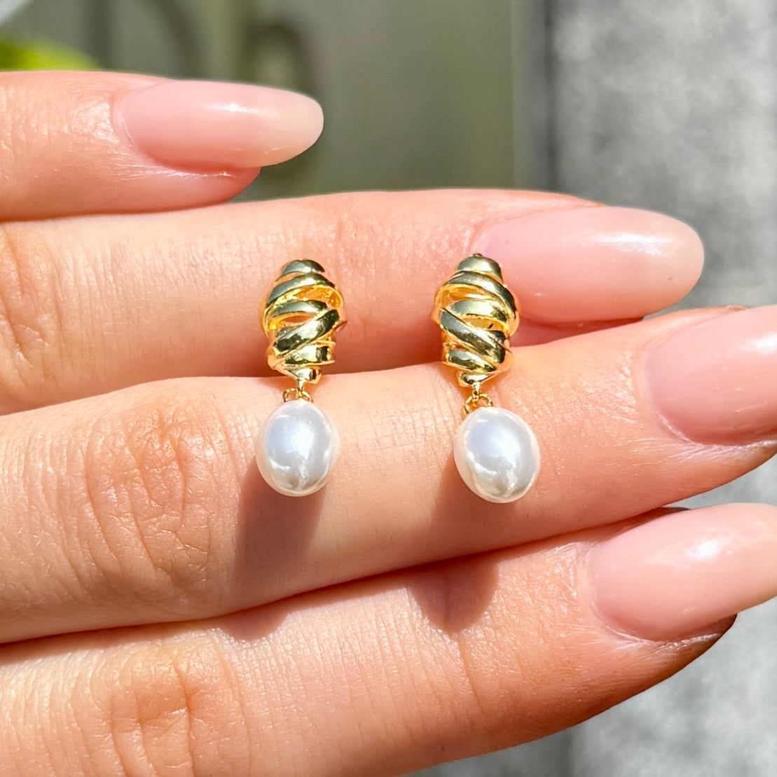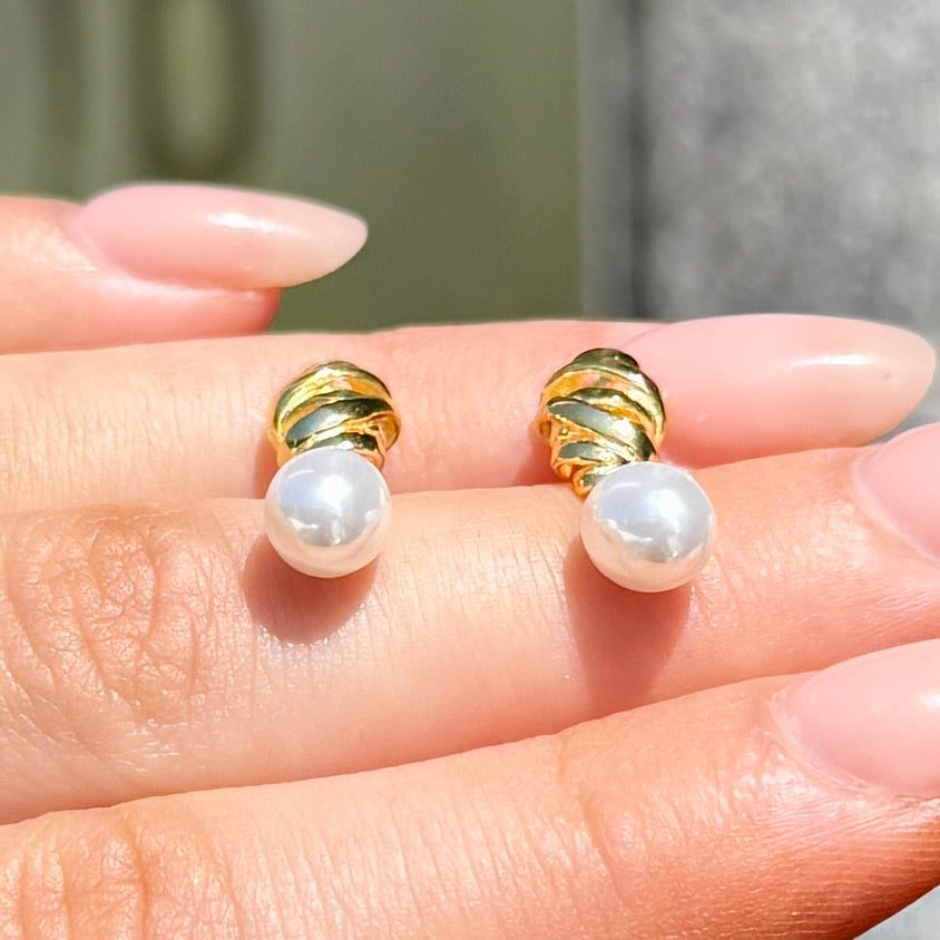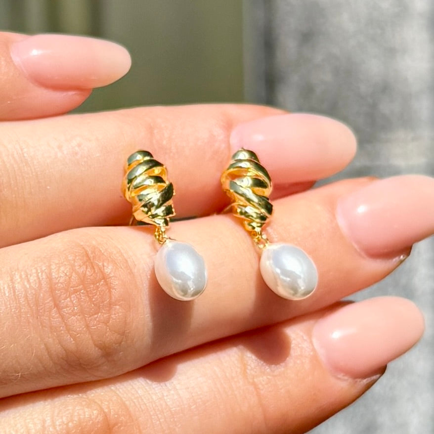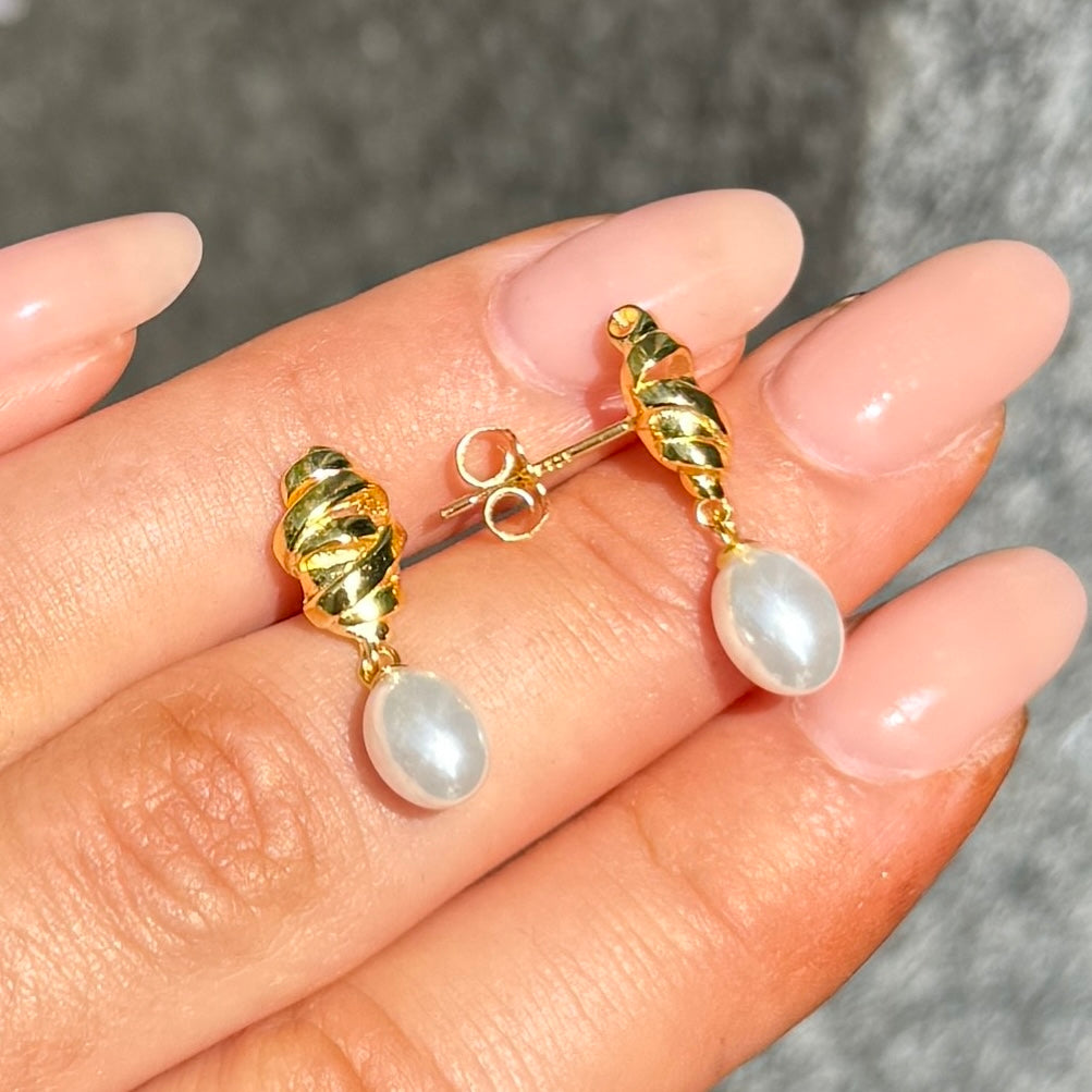 These sweet 9ct gold plated on sterling silver earrings each feature a twist design and a white real freshwater pearl.