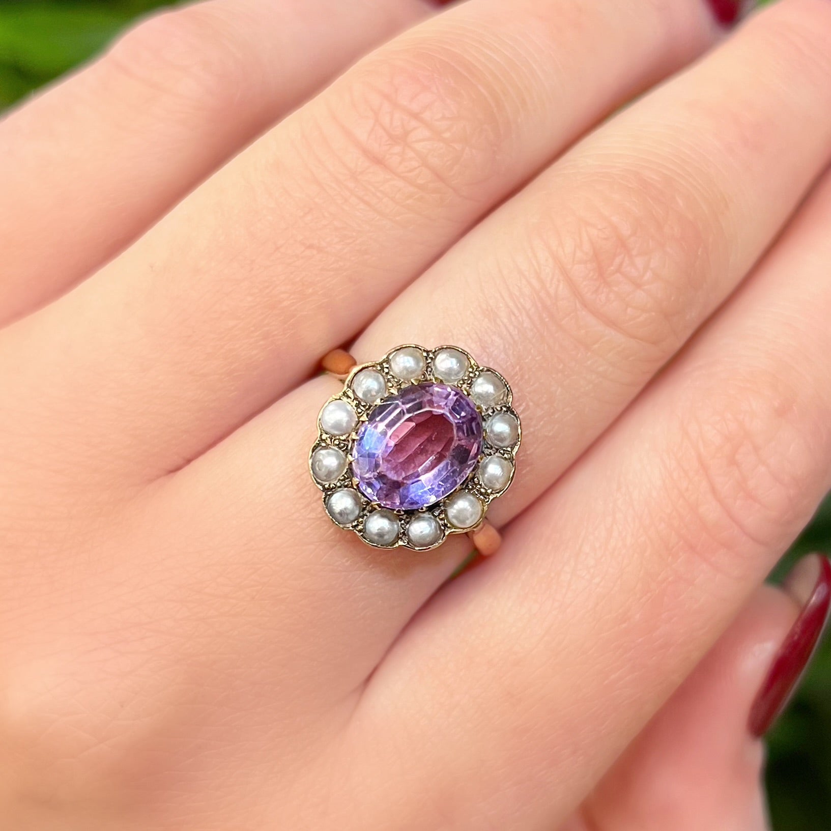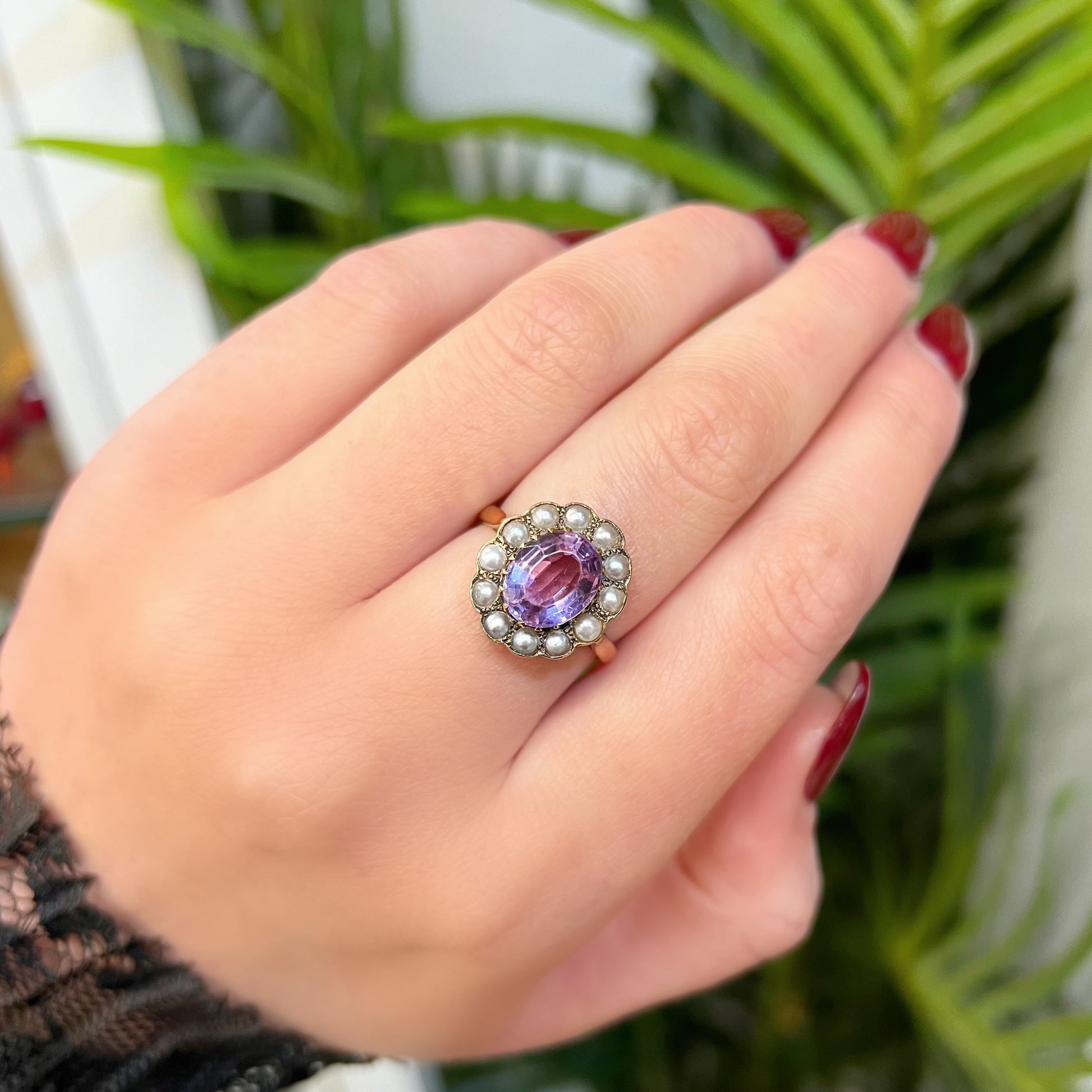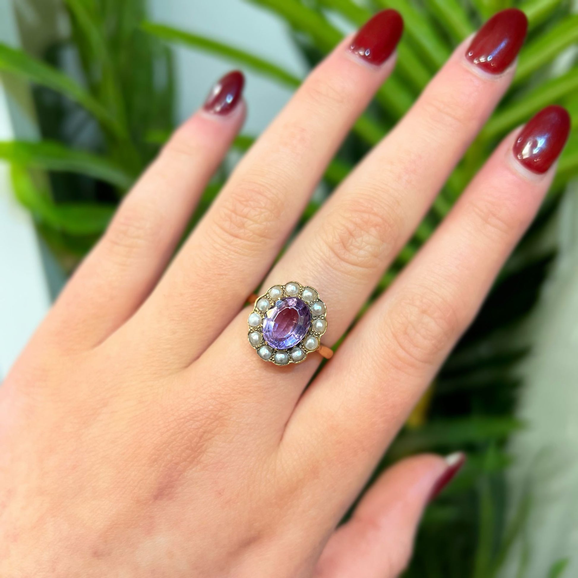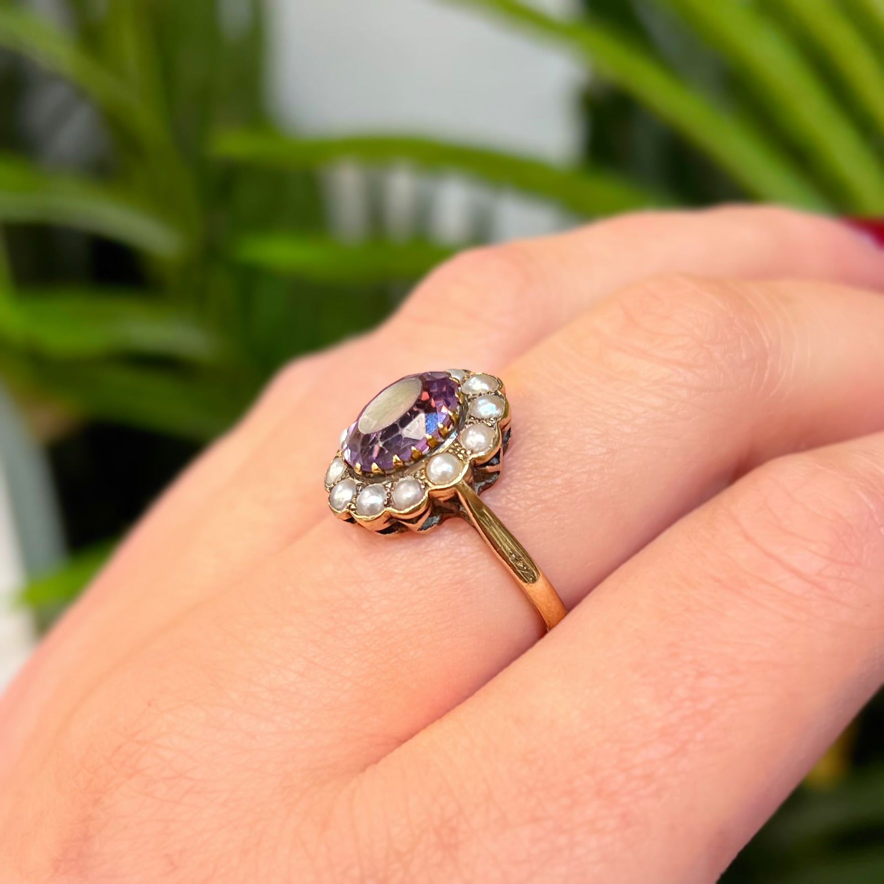 Vintage 9ct Yellow Gold Purple Amethyst and Pearl Cluster Ring - Size O
