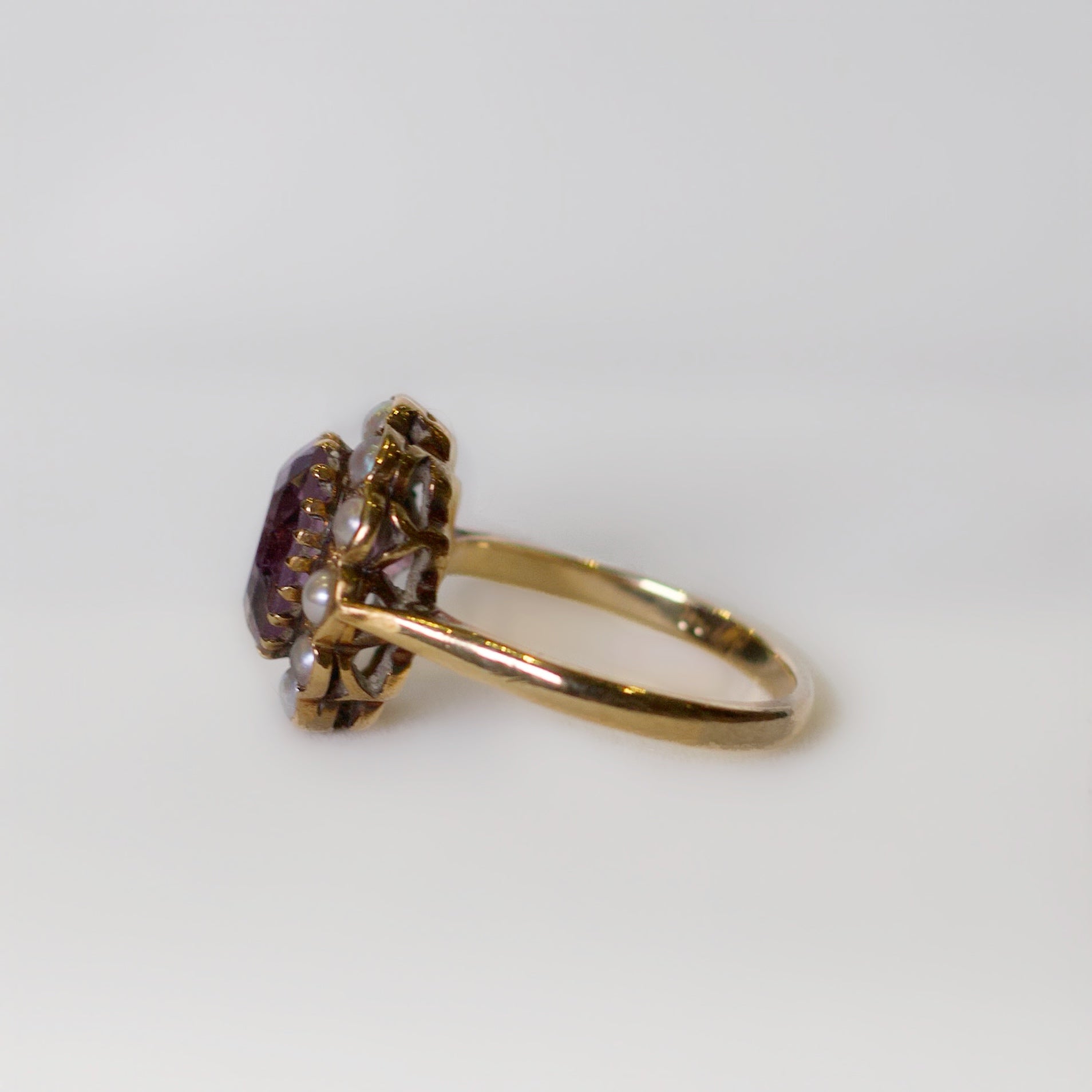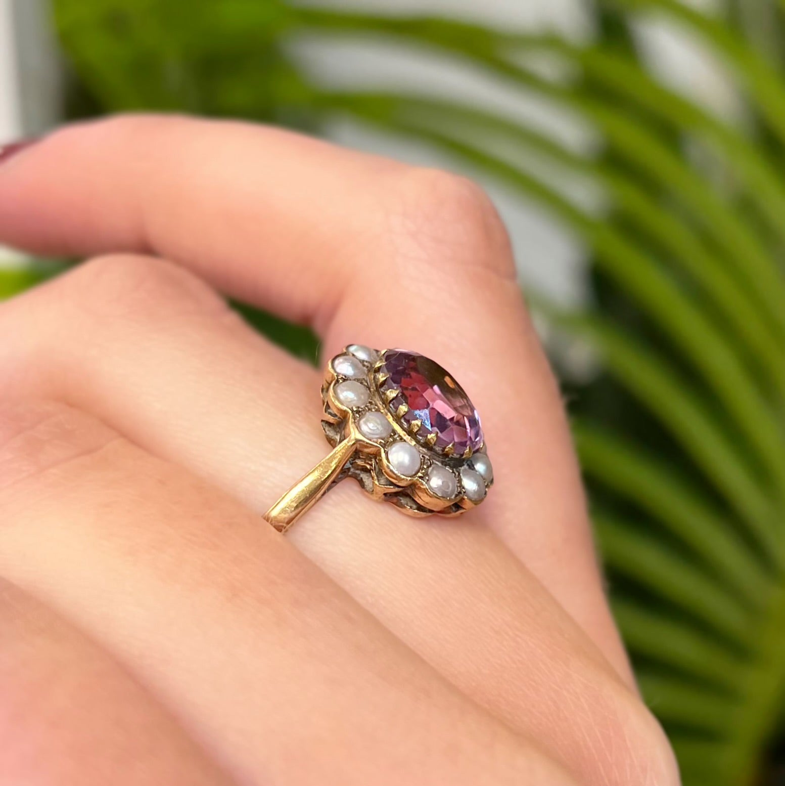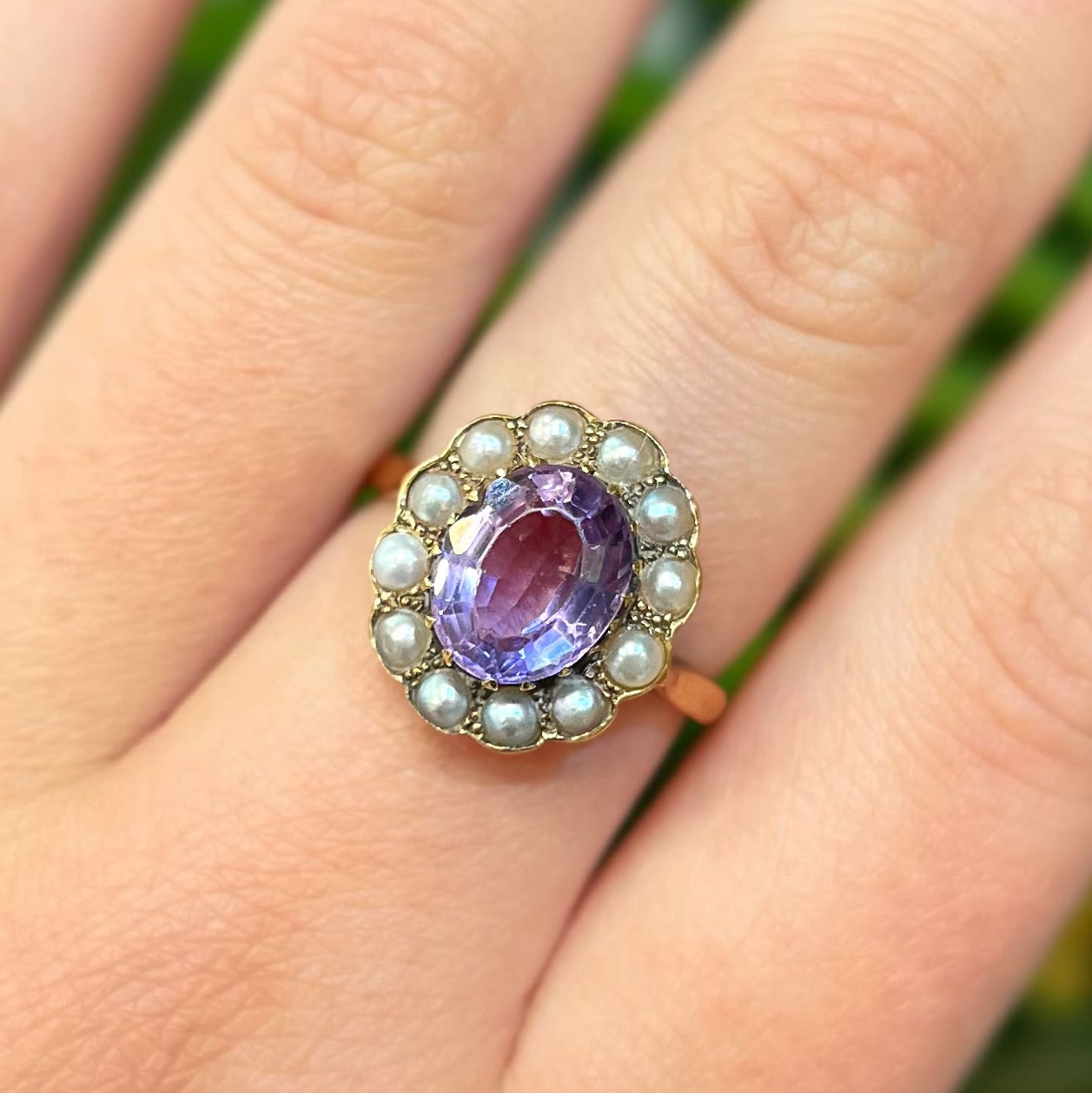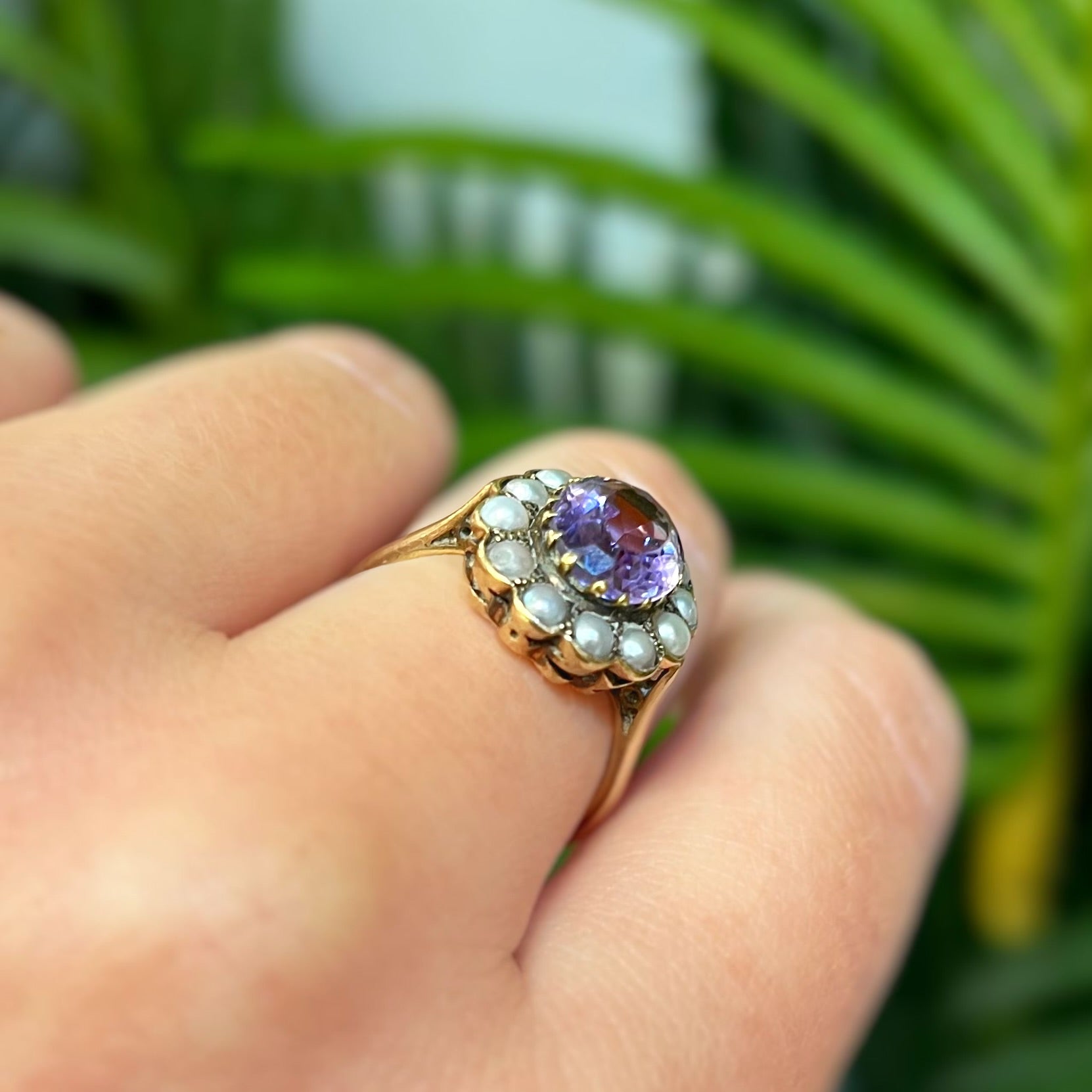 Vintage 9ct Yellow Gold Purple Amethyst and Pearl Cluster Ring - Size O