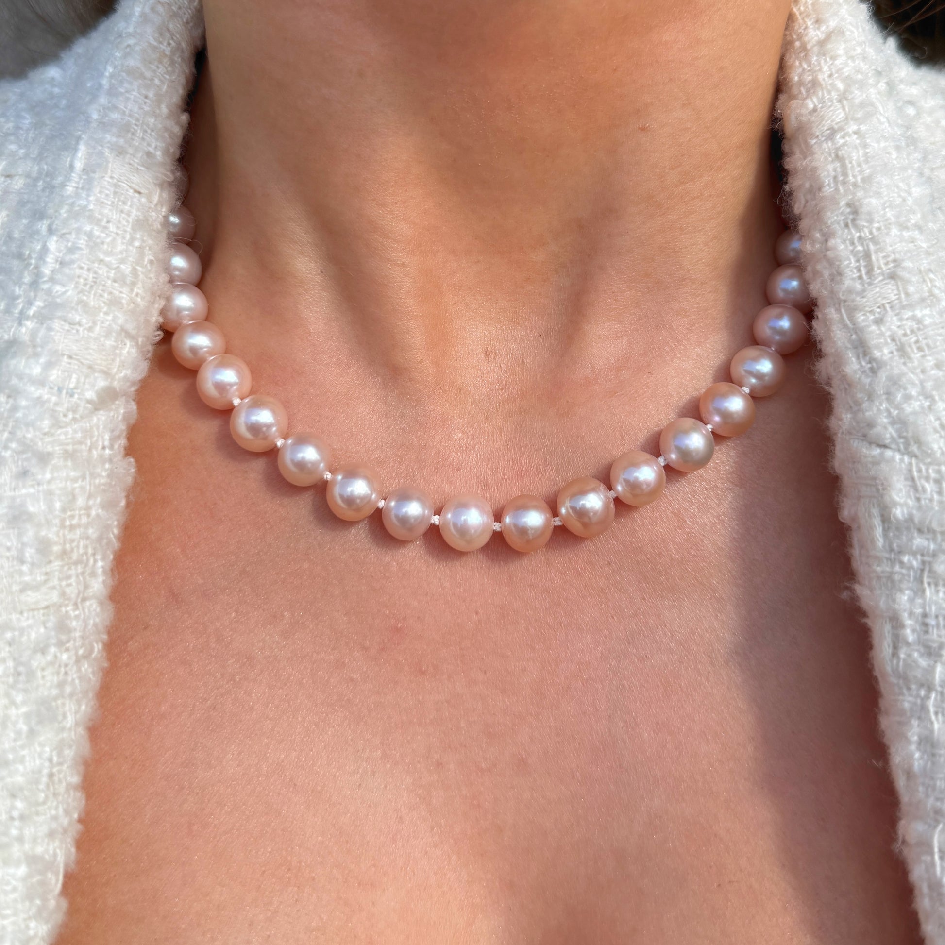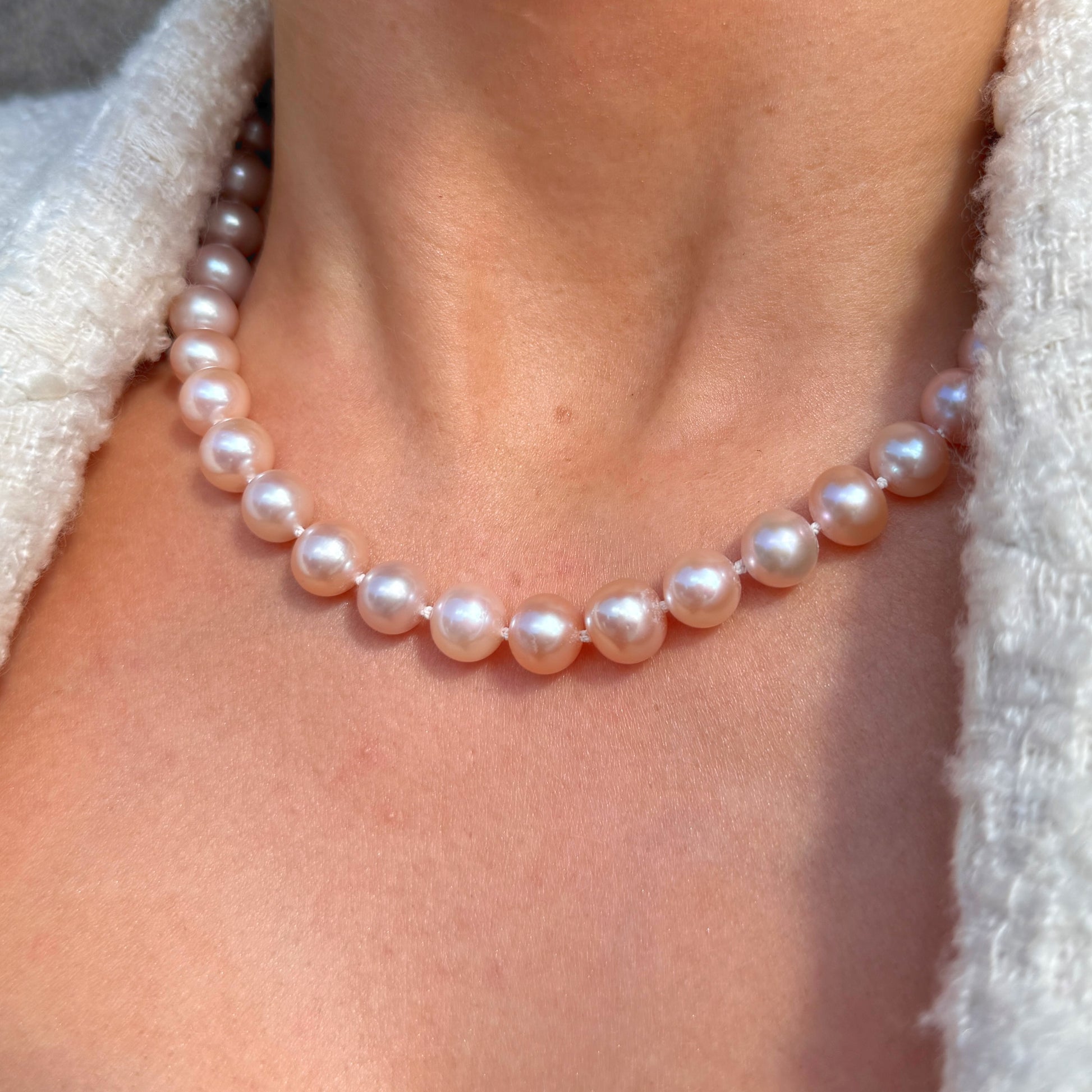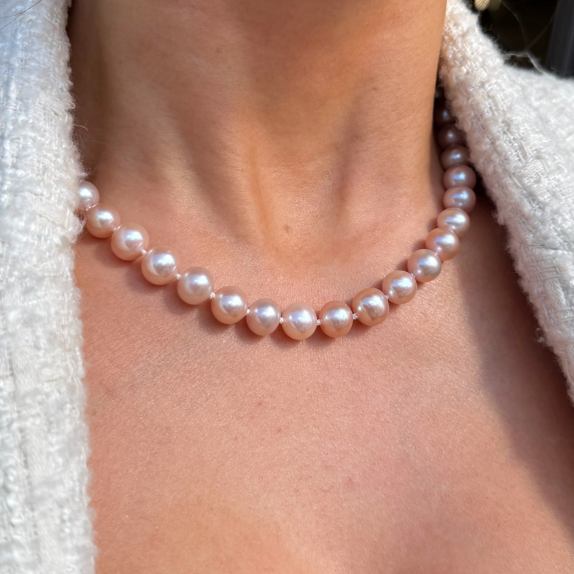 This classic necklace was handmade by our expert artisan stringers here on-site at Eloise. It features soft salmon pink real freshwater pearls, with a 9ct yellow gold bolt ring catch.
