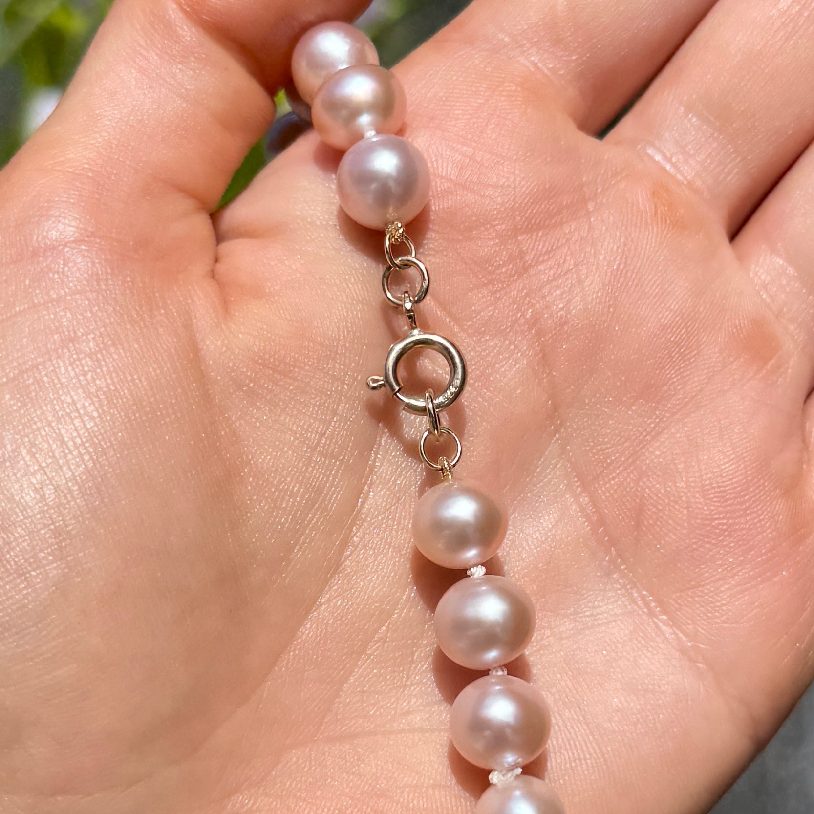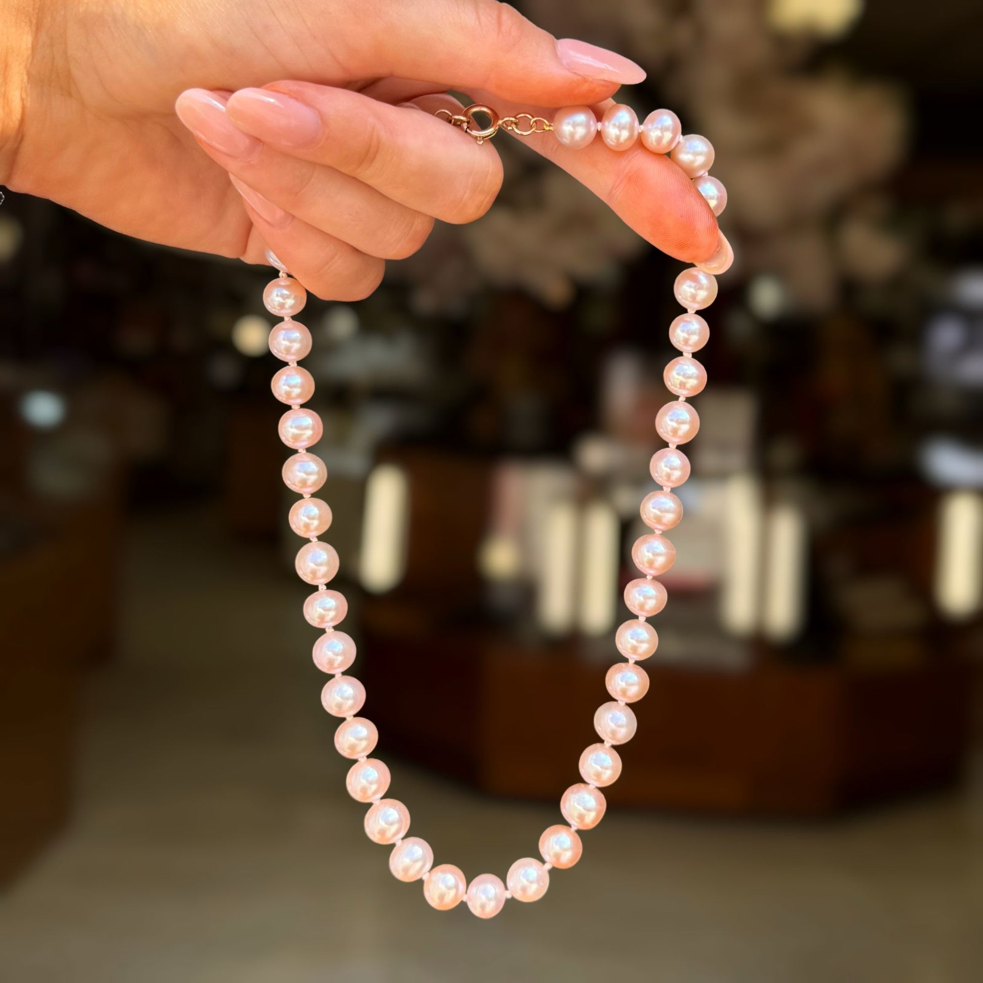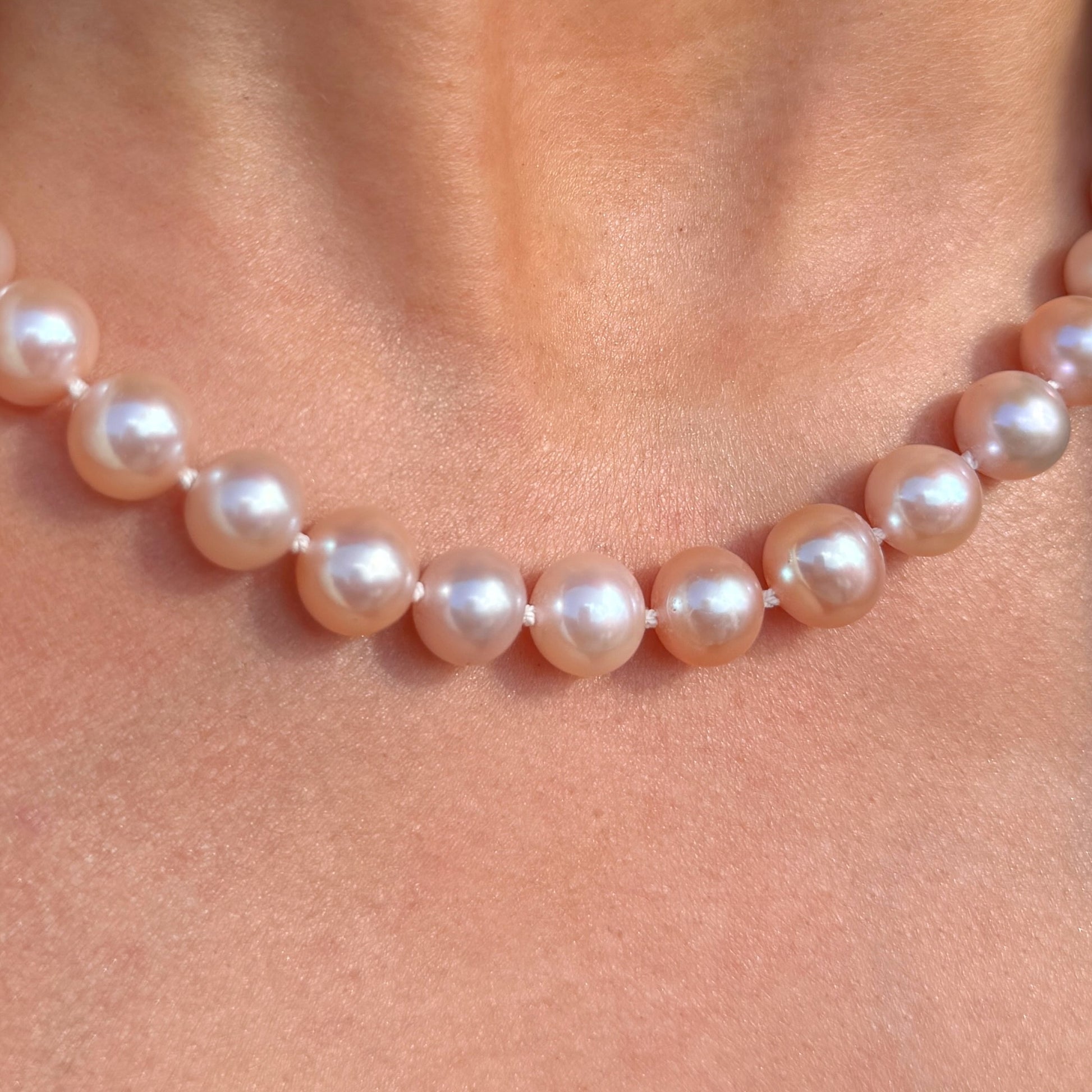 This classic necklace was handmade by our expert artisan stringers here on-site at Eloise. It features soft salmon pink real freshwater pearls, with a 9ct yellow gold bolt ring catch.