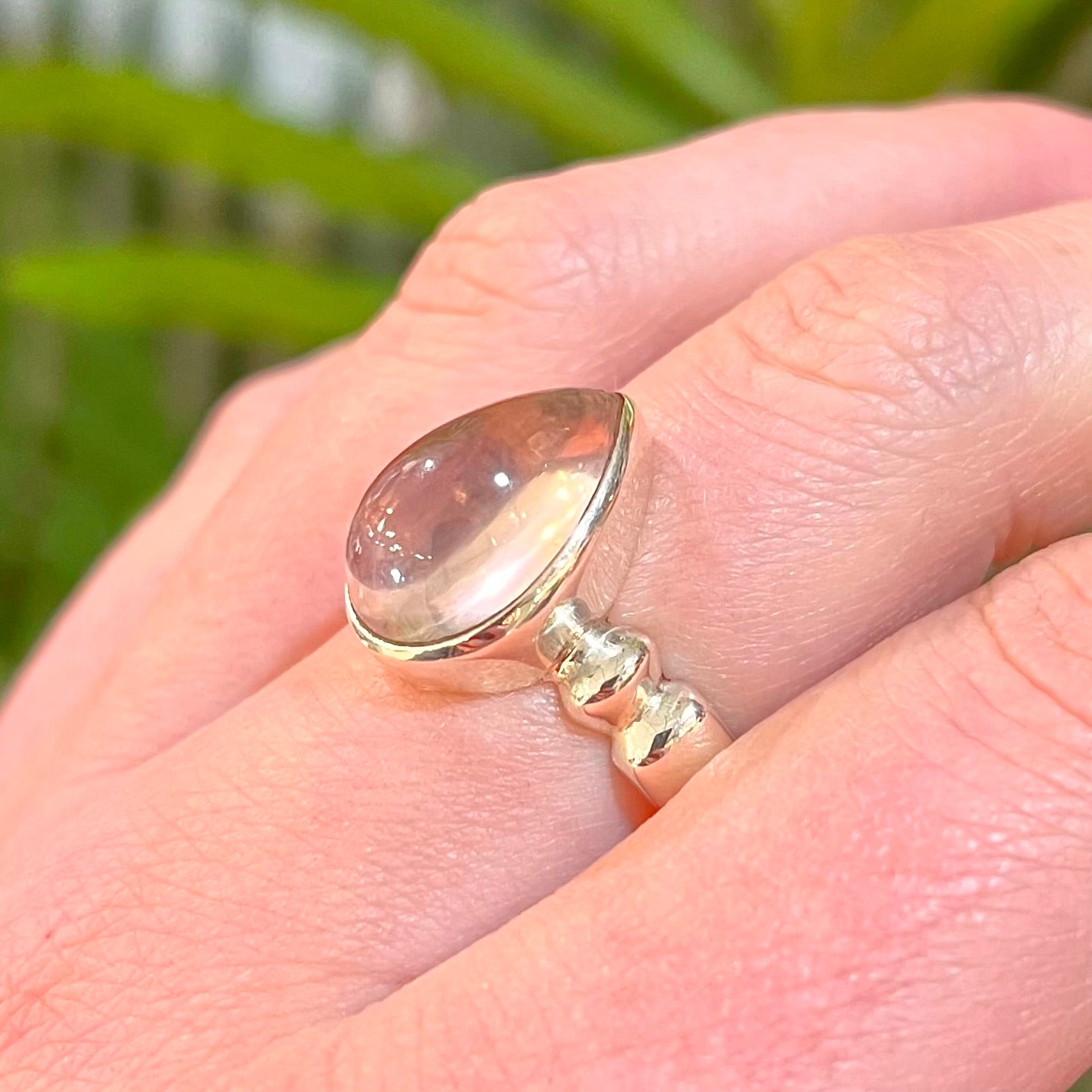 This ring features a pear cut rose quartz cabochon stone, bezel set in sterling silver.