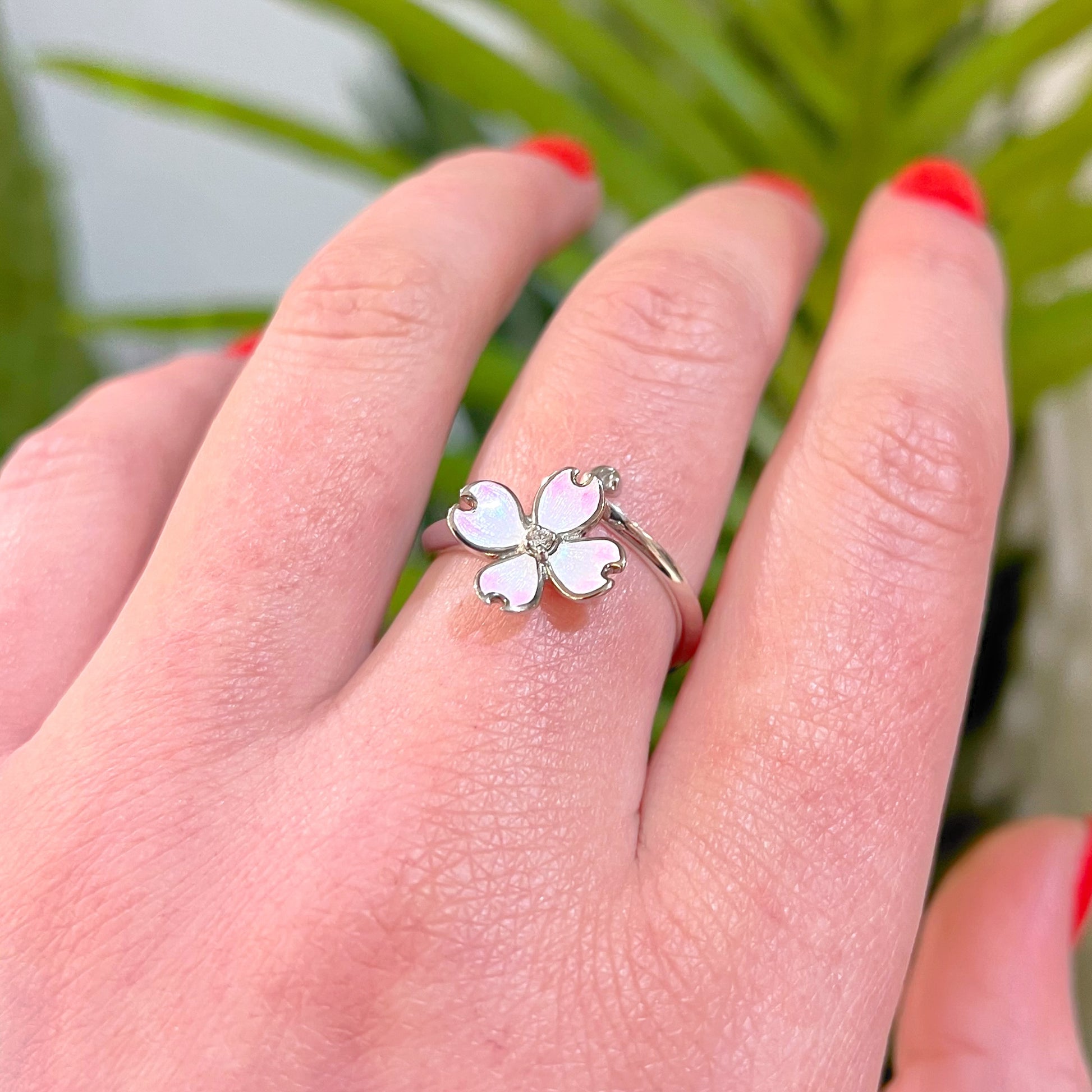 Sterling Silver Pink Enamel Flower & Diamond Ring - Adjustable Size