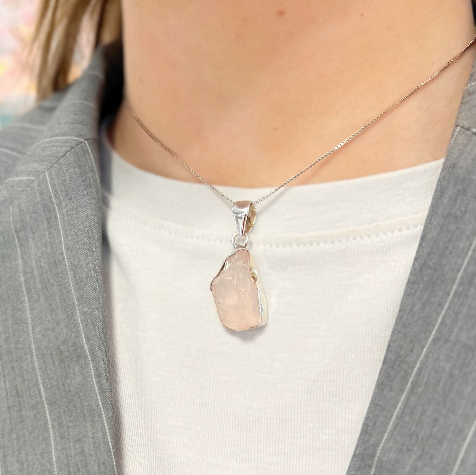 This beautiful necklace features a rough cut pale pink rose quartz gemstone, bezel set in sterling silver.