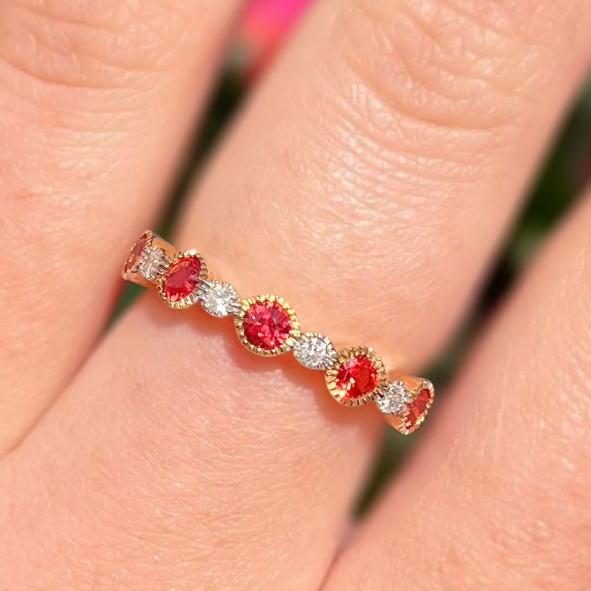 A rare and striking eternity band, crafted in 9ct yellow gold and set with five vivid burnt orange sapphires, beautifully contrasted by natural brilliant-cut diamonds.