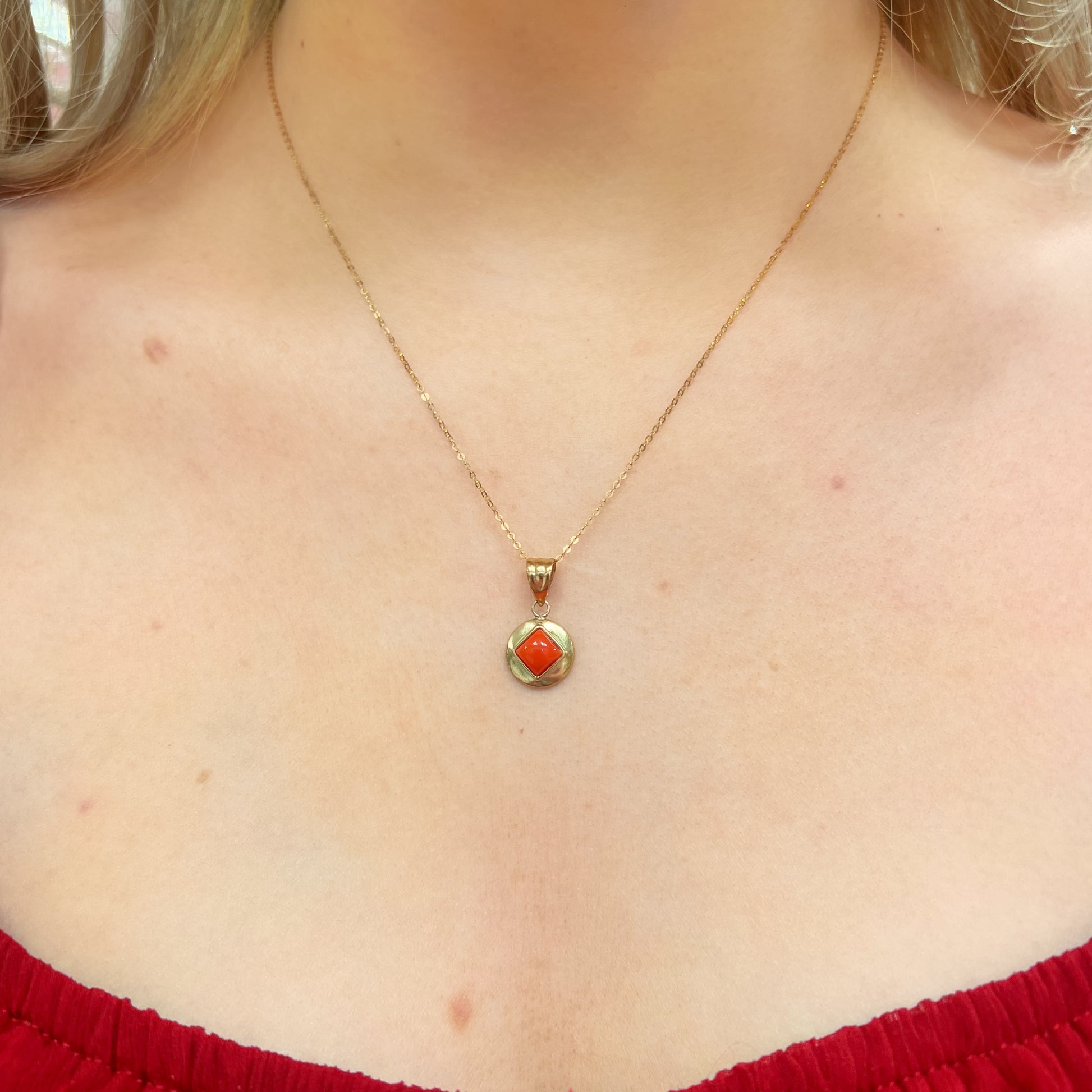This particular piece features a punchy peach-coloured square coral bezel set into a timeless 9ct yellow gold disc. Finished with a fine trace chain, this piece would make a great everyday necklace and is suitable for trendy layering.