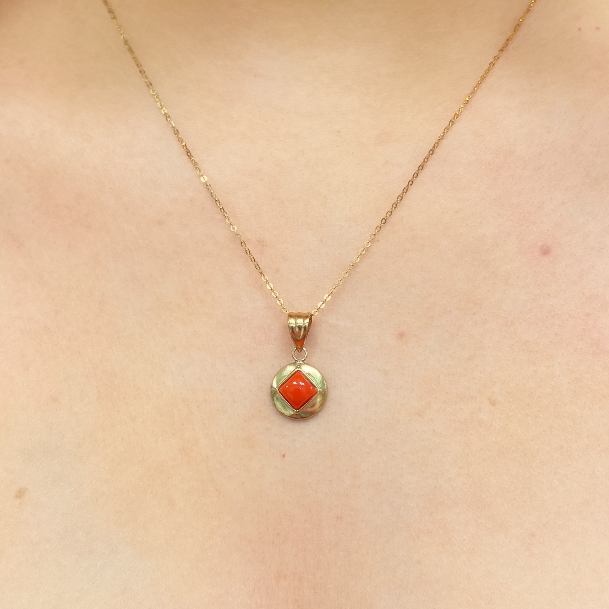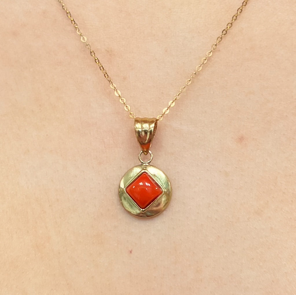 Rare and Timeless 9ct Yellow Gold Small Coral Disc Necklace