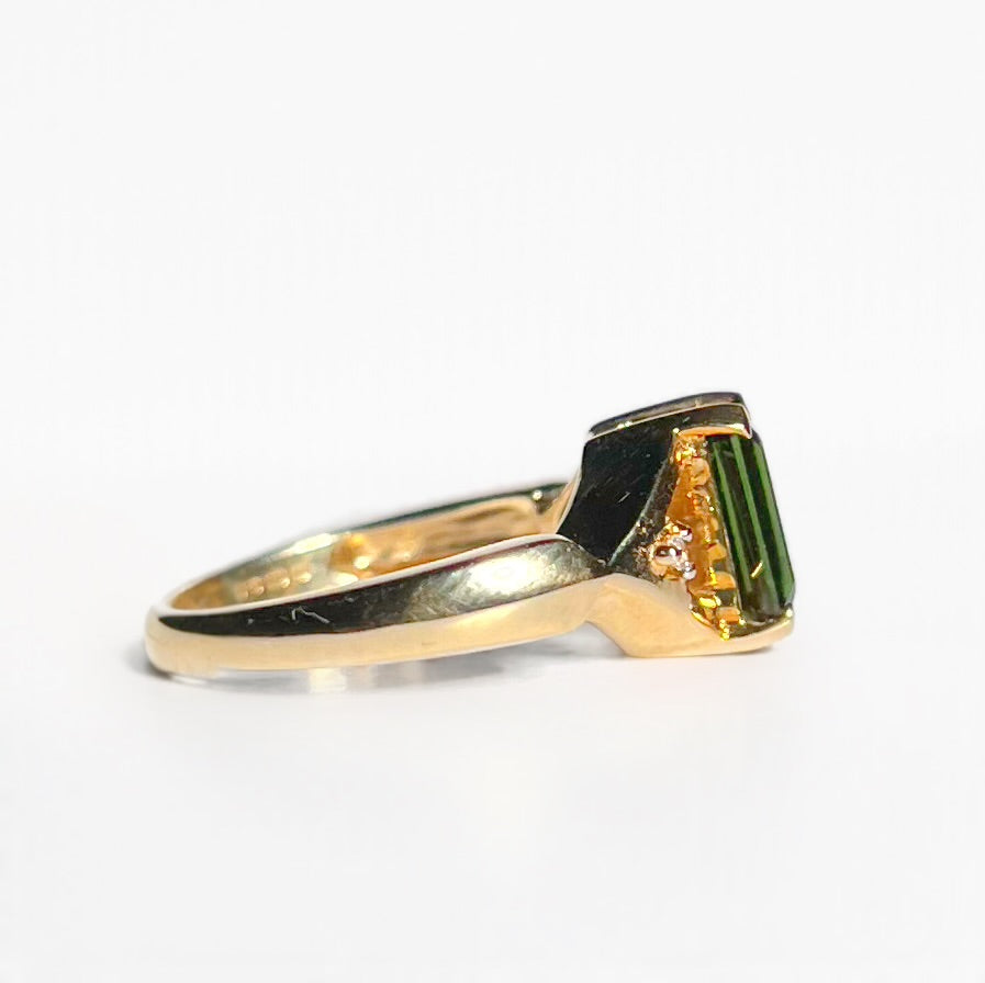This one is a magnificent find! Made in classic 9ct yellow gold, she features a deep forest green baguette-cut tourmaline, expertly claw set at the heart of the design.
