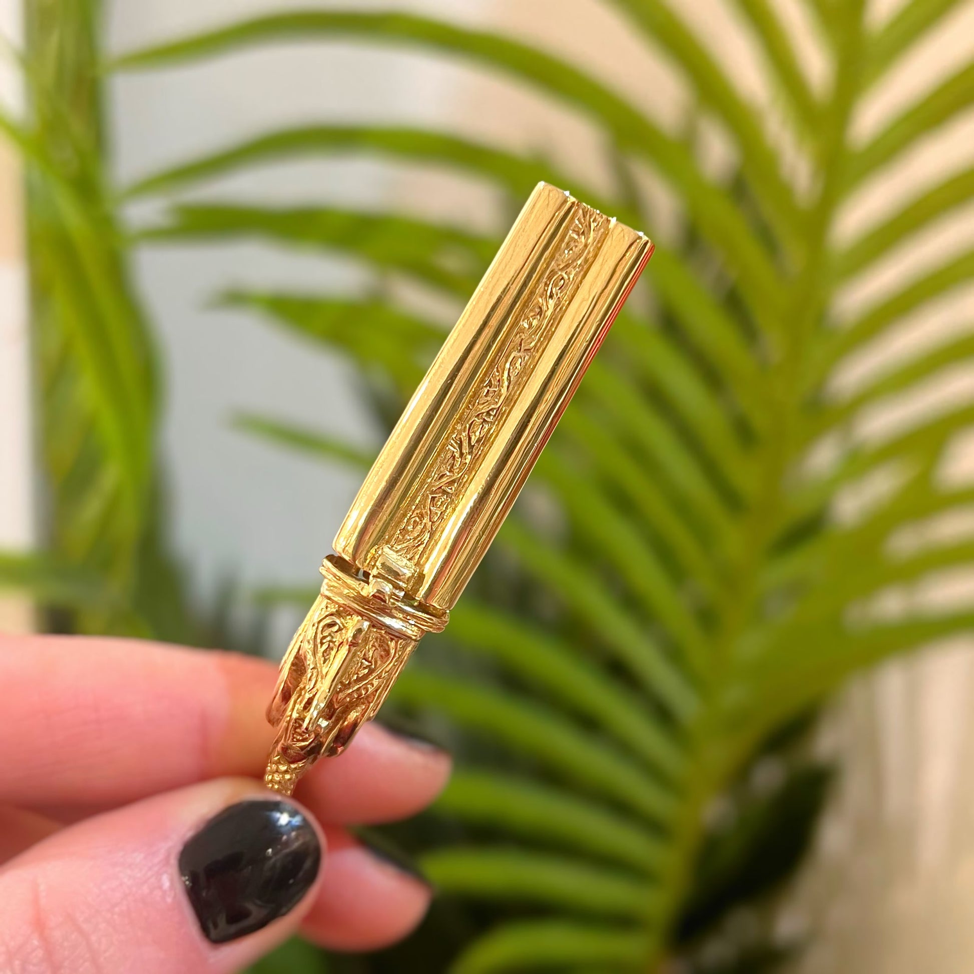 It’s a golden artefact crafted with extraordinary attention to detail, featuring a finely shaped handle and trigger, along with scrollwork patterns that make it look like a lavishly decorated miniature firearm.