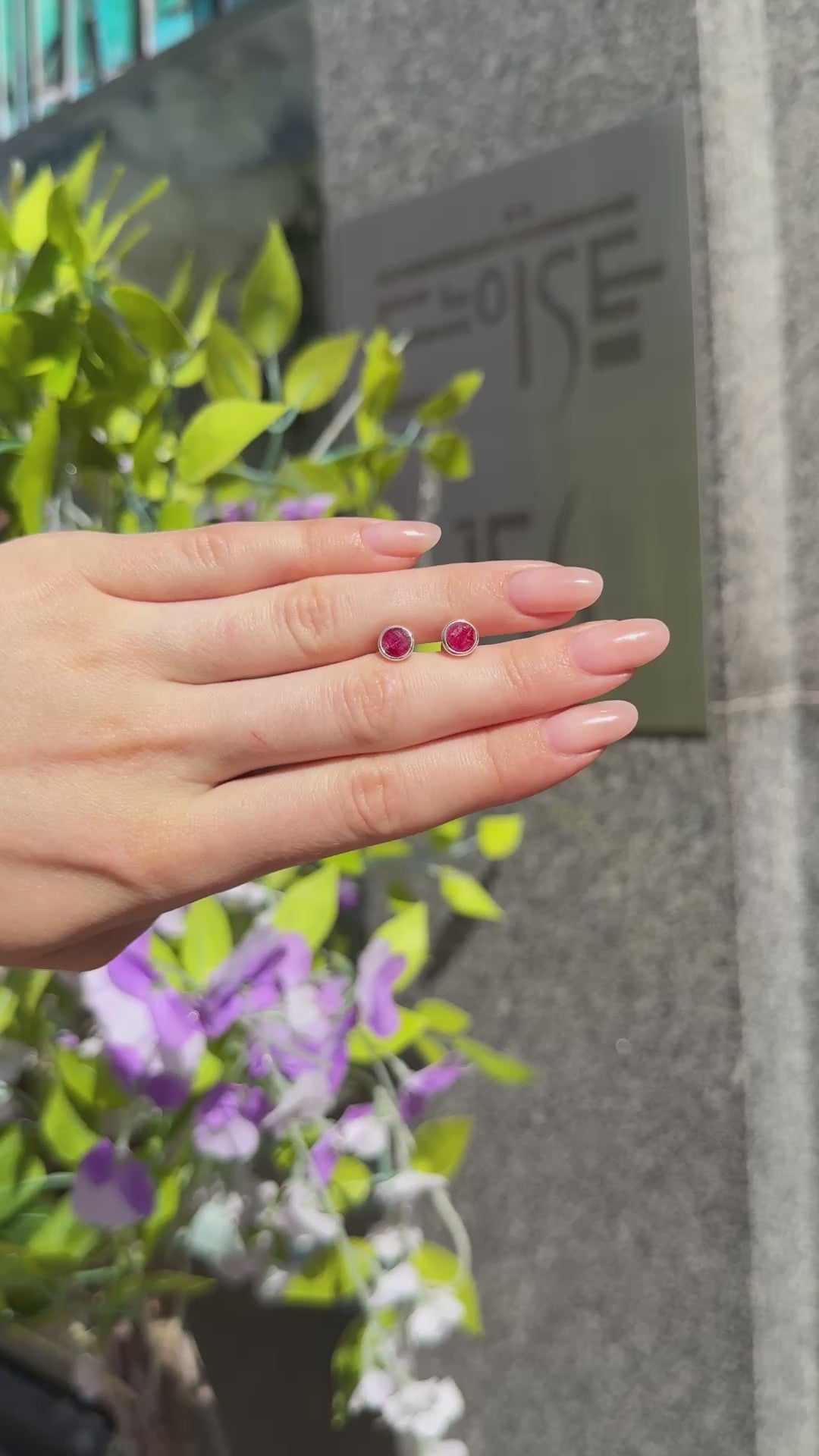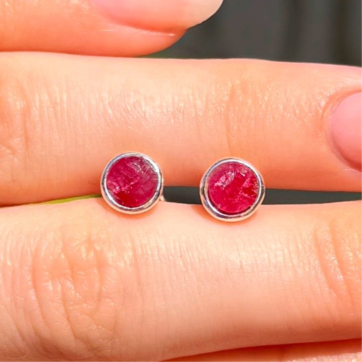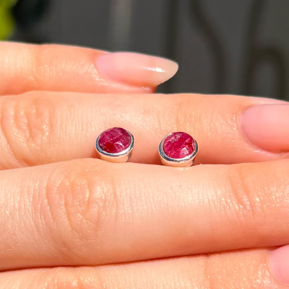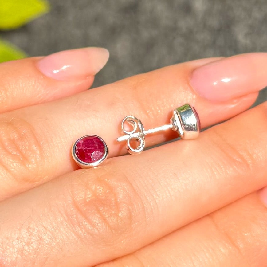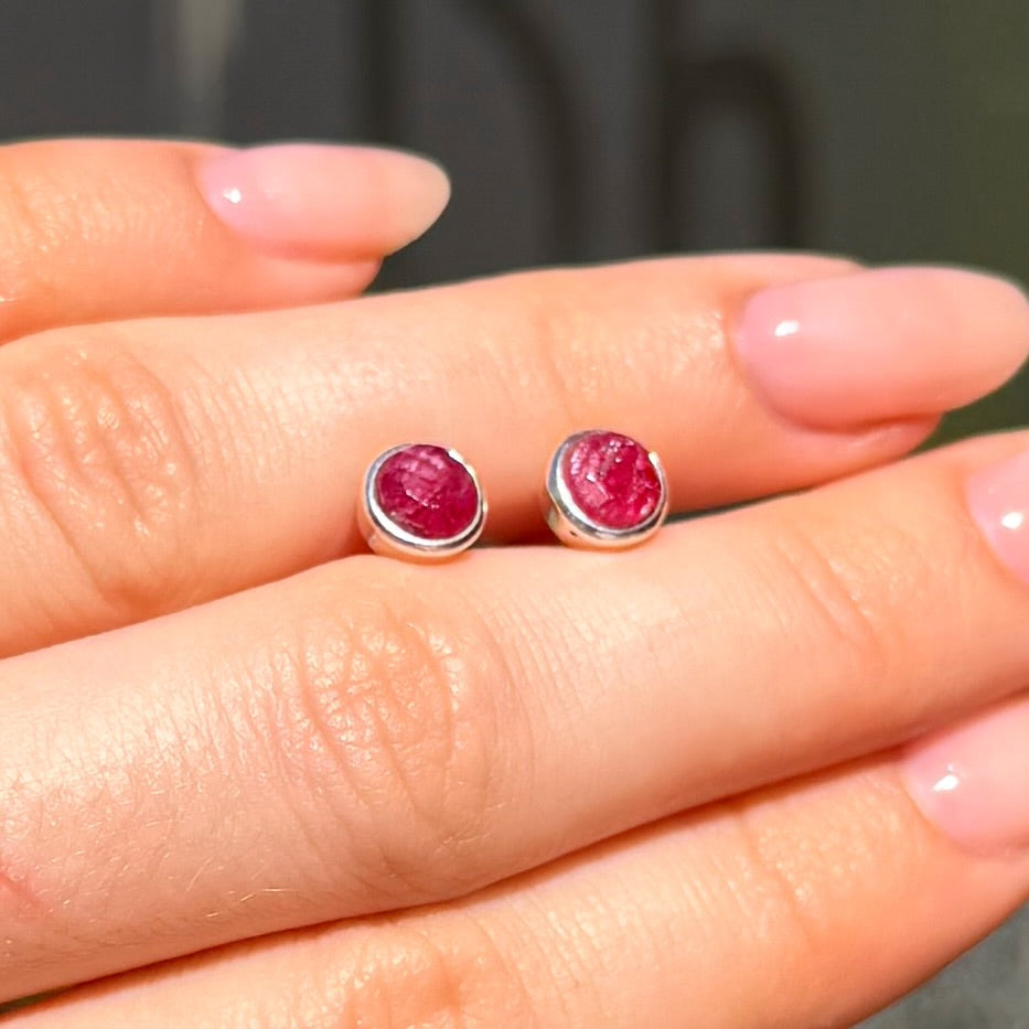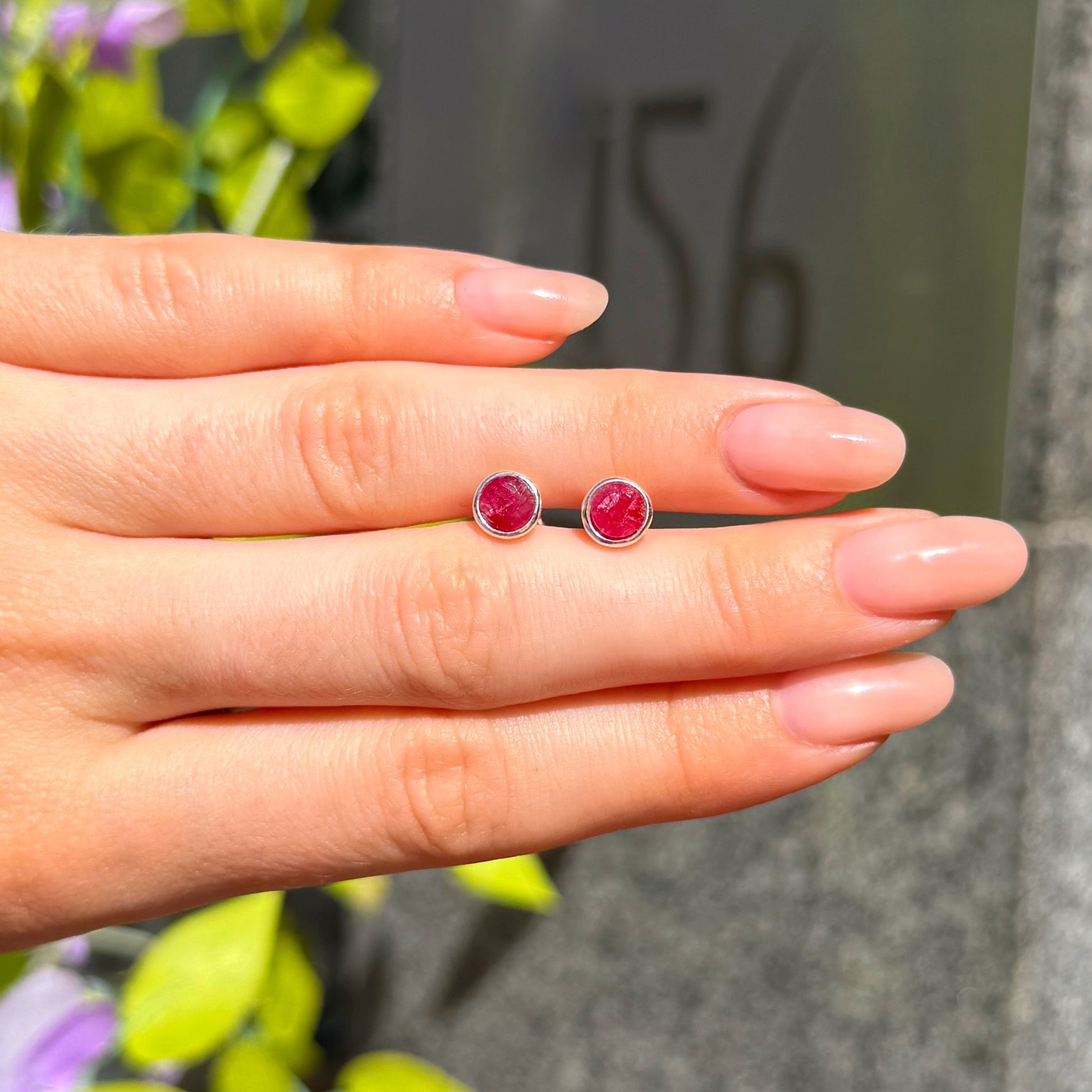 Bezel set in sterling silver these earrings feature faceted red ruby gemstones in a minimalist design.