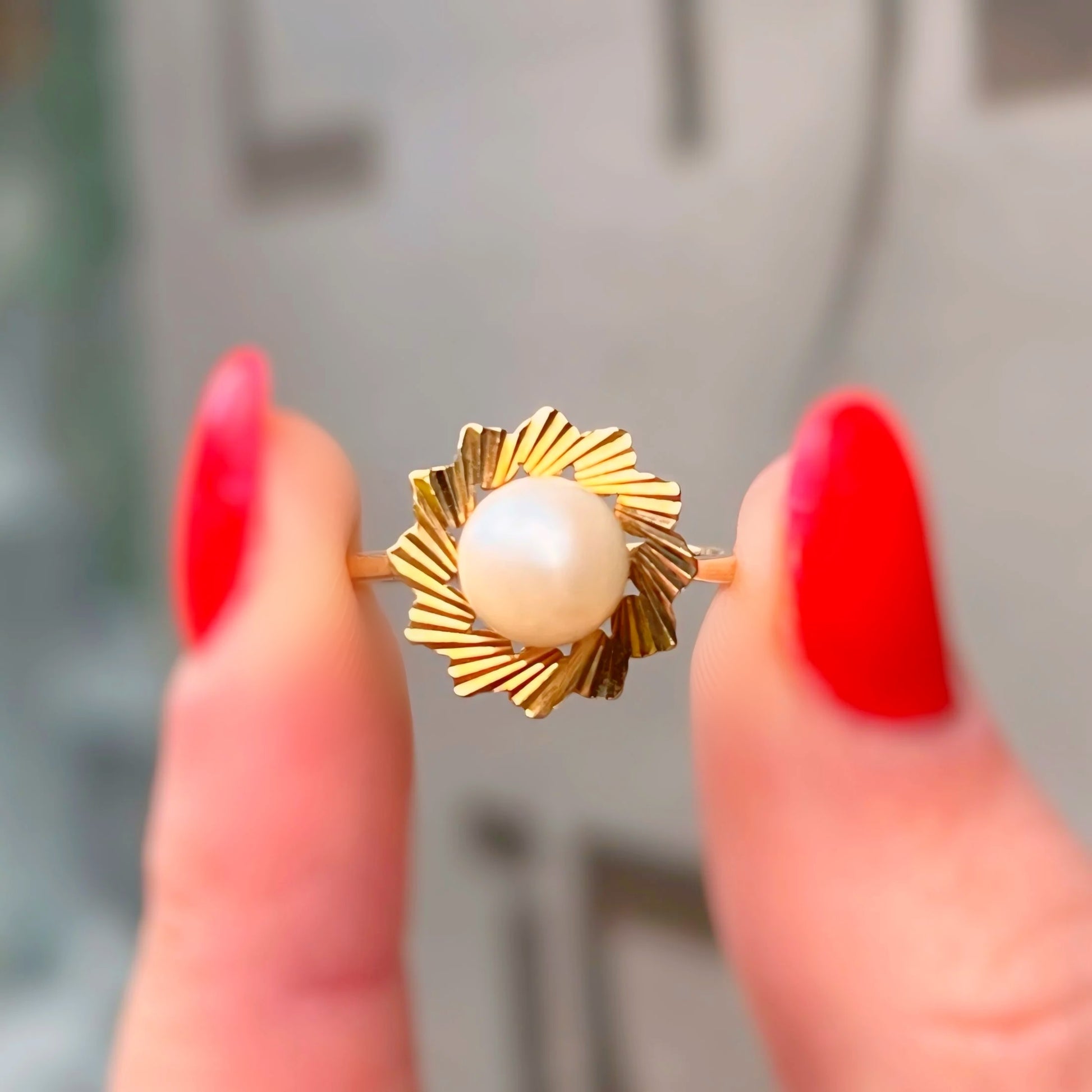 Retro 9ct Yellow Gold Pearl Ring - Size M