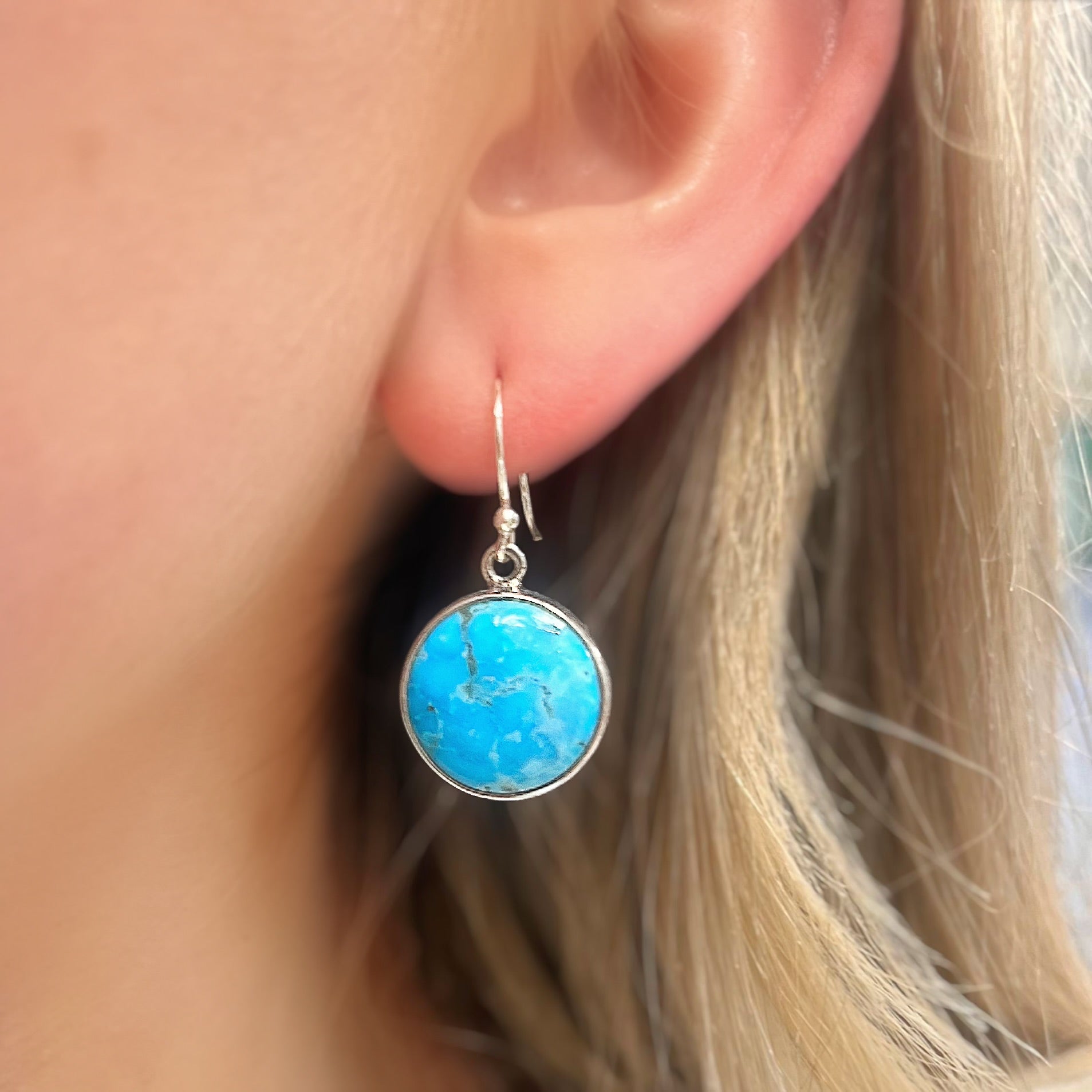 These lovely drop earrings feature bright blue turquoise gemstones, expertly set in a sleek sterling silver bezel to emphasise their beauty.