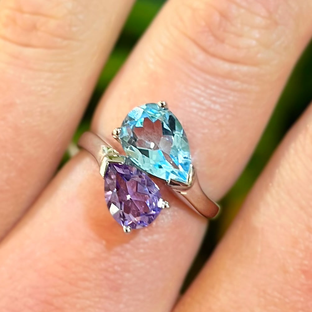 This eye-catching piece is made in bright sterling silver and features two pear-shaped, faceted gemstones—an amethyst and a blue topaz—expertly claw-set in a modern toi et moi style design.