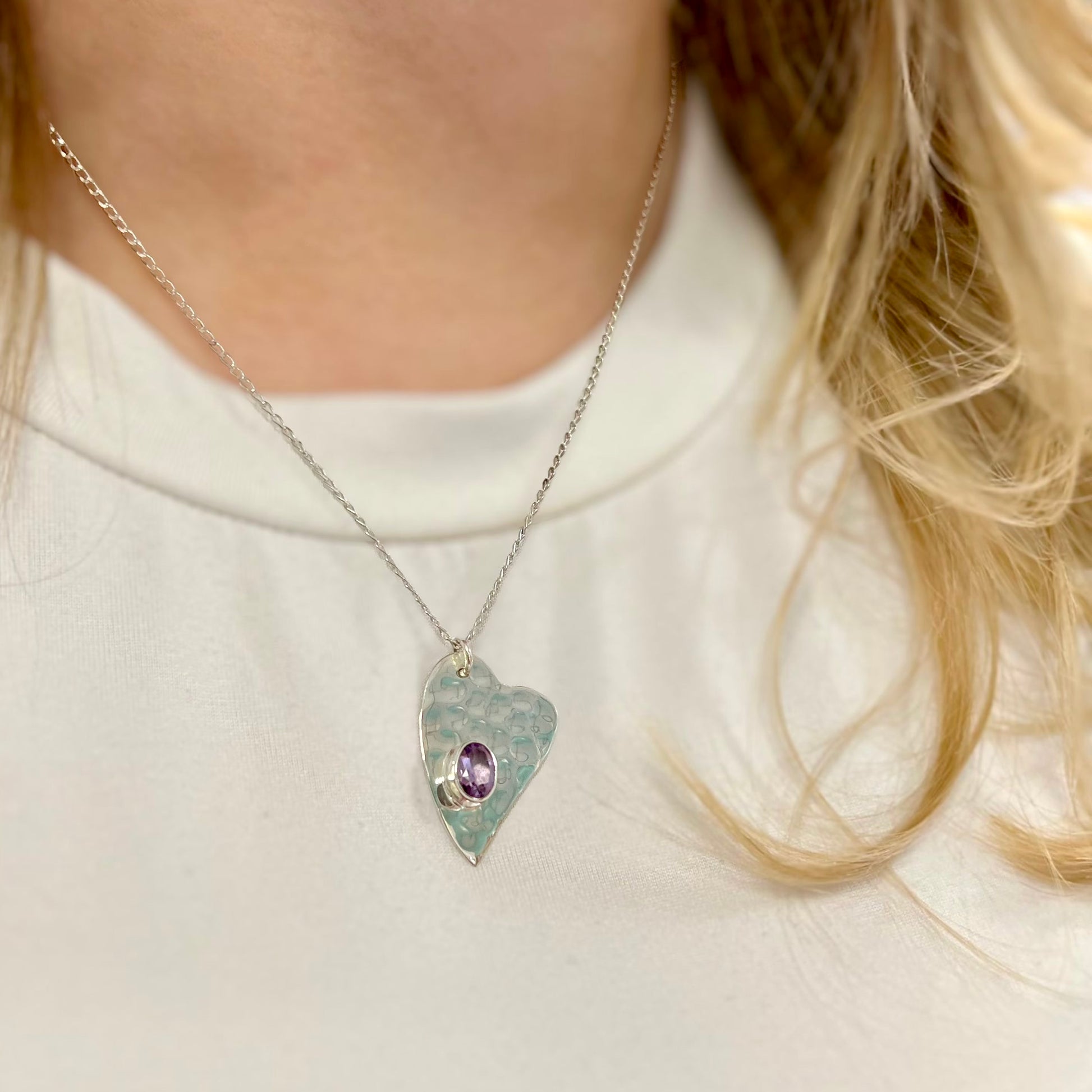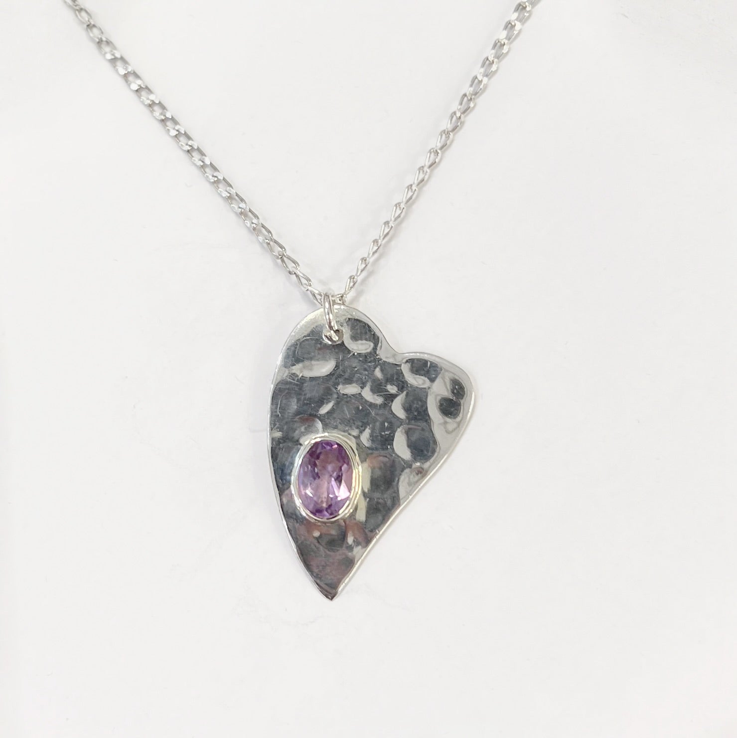 Made in bright sterling silver, this beautiful necklace features a lilac-purple amethyst securely bezel-set into a heart-shaped design that has been organically hammered to create a lovely contemporary finish.