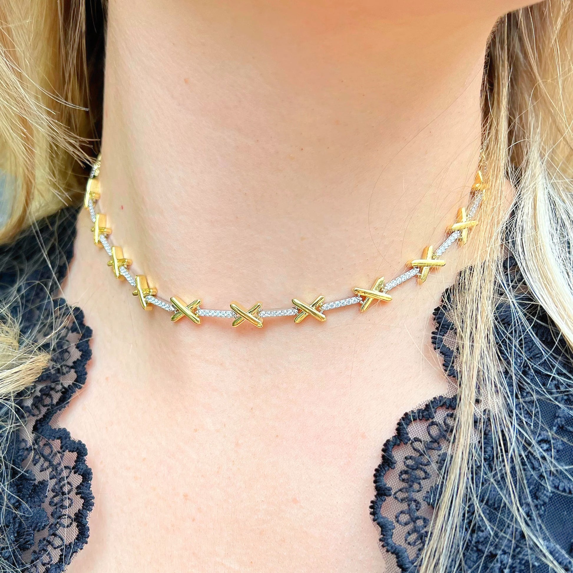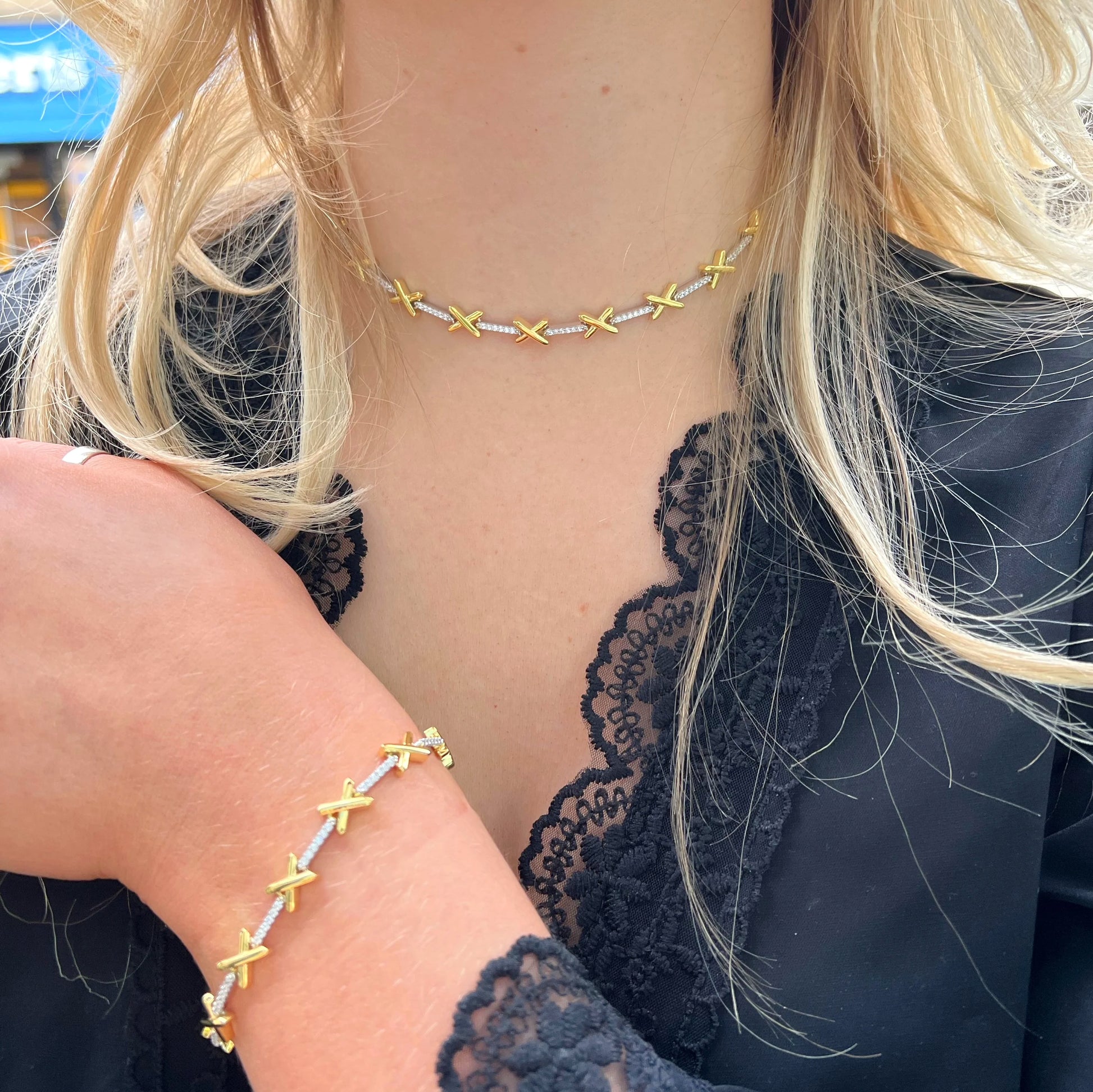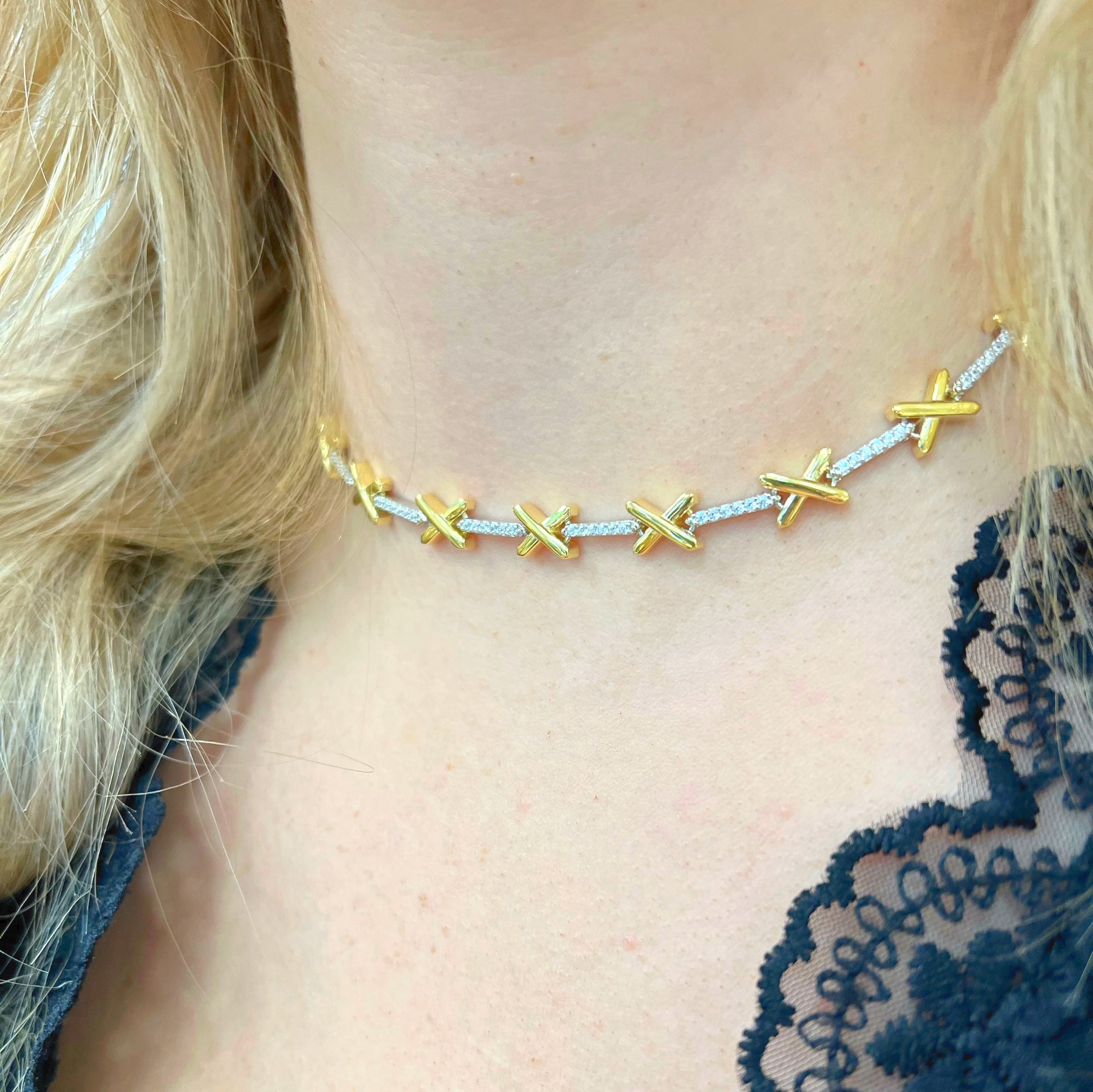 This sweet necklace would make a brilliant valentines gift! It features silver, cubic zirconia, encrusted bars, alternating between gold plated Xs. This necklace really has a glamorous designer feel and would look great everyday.