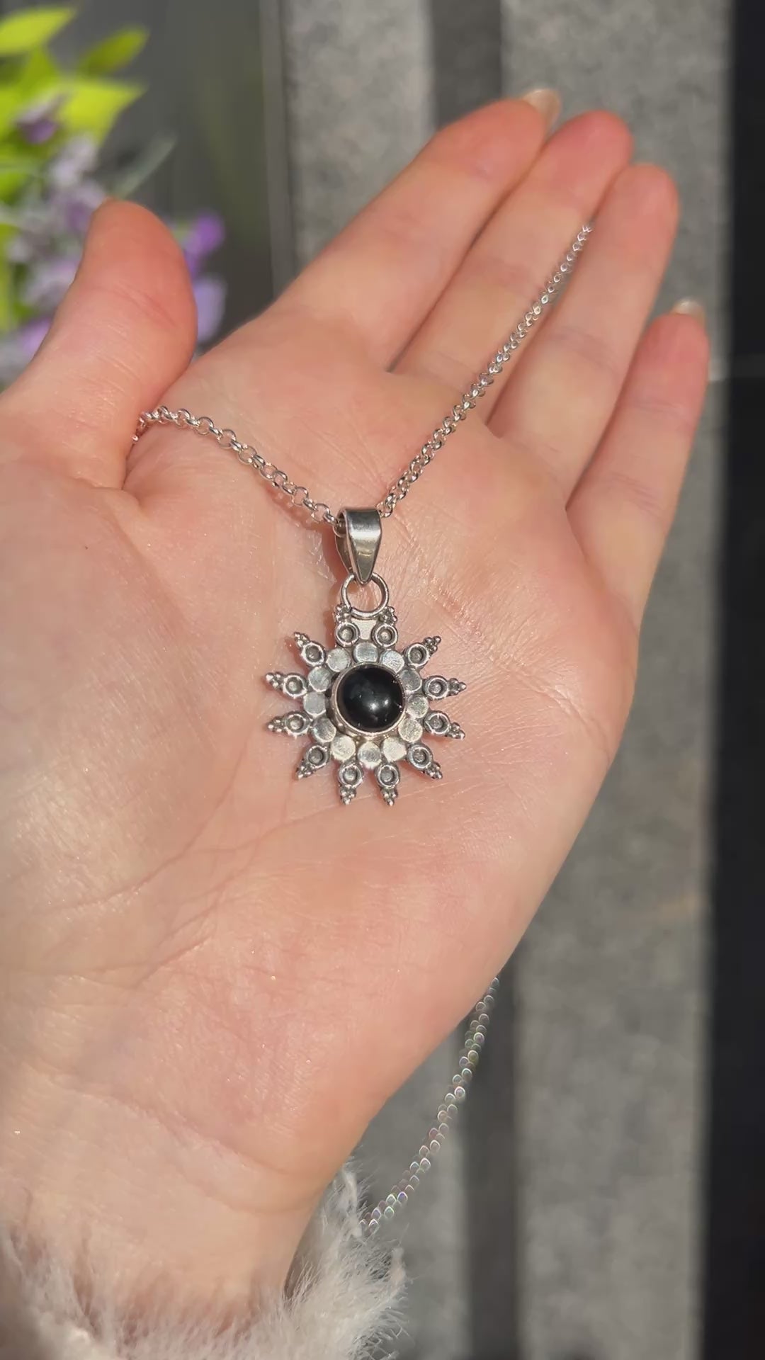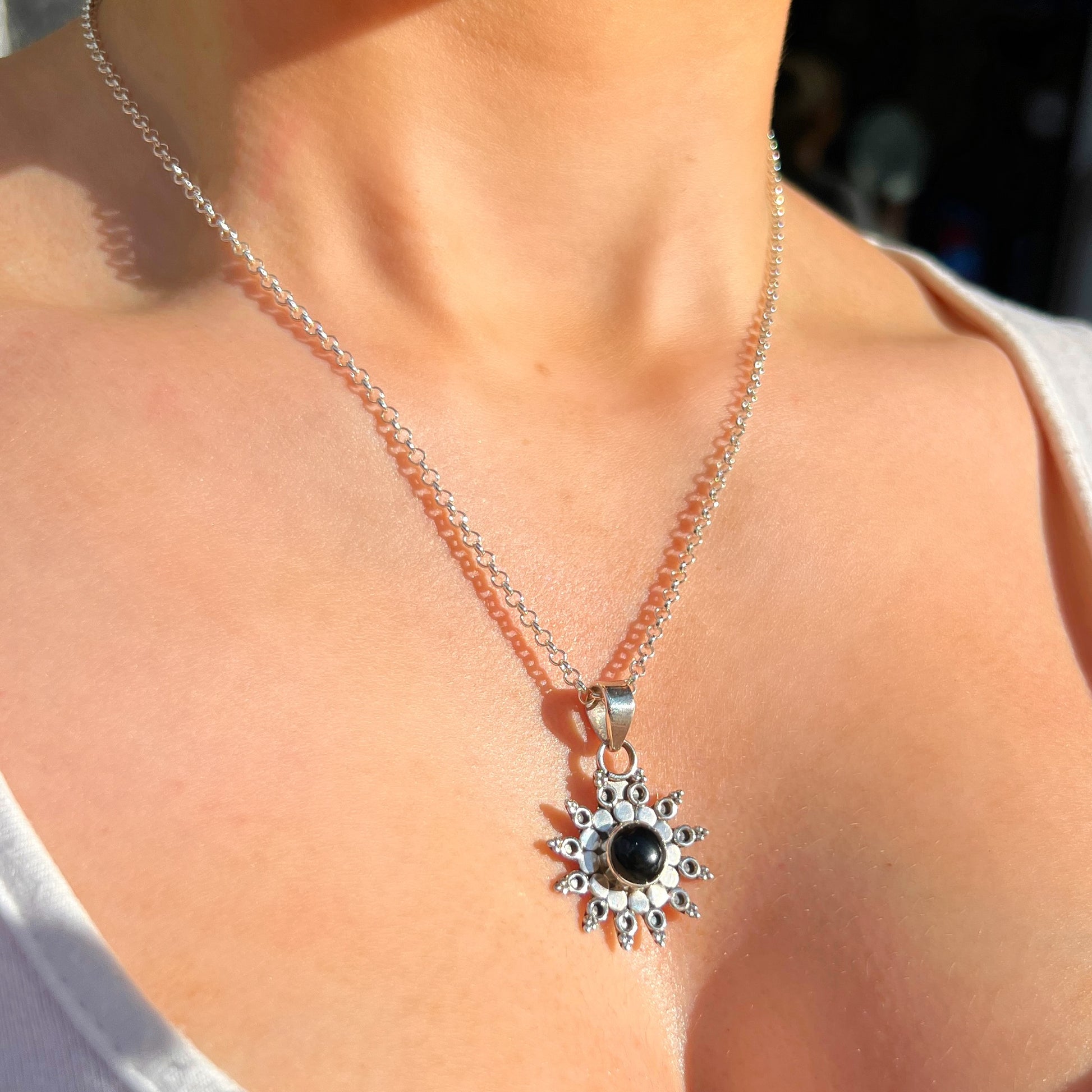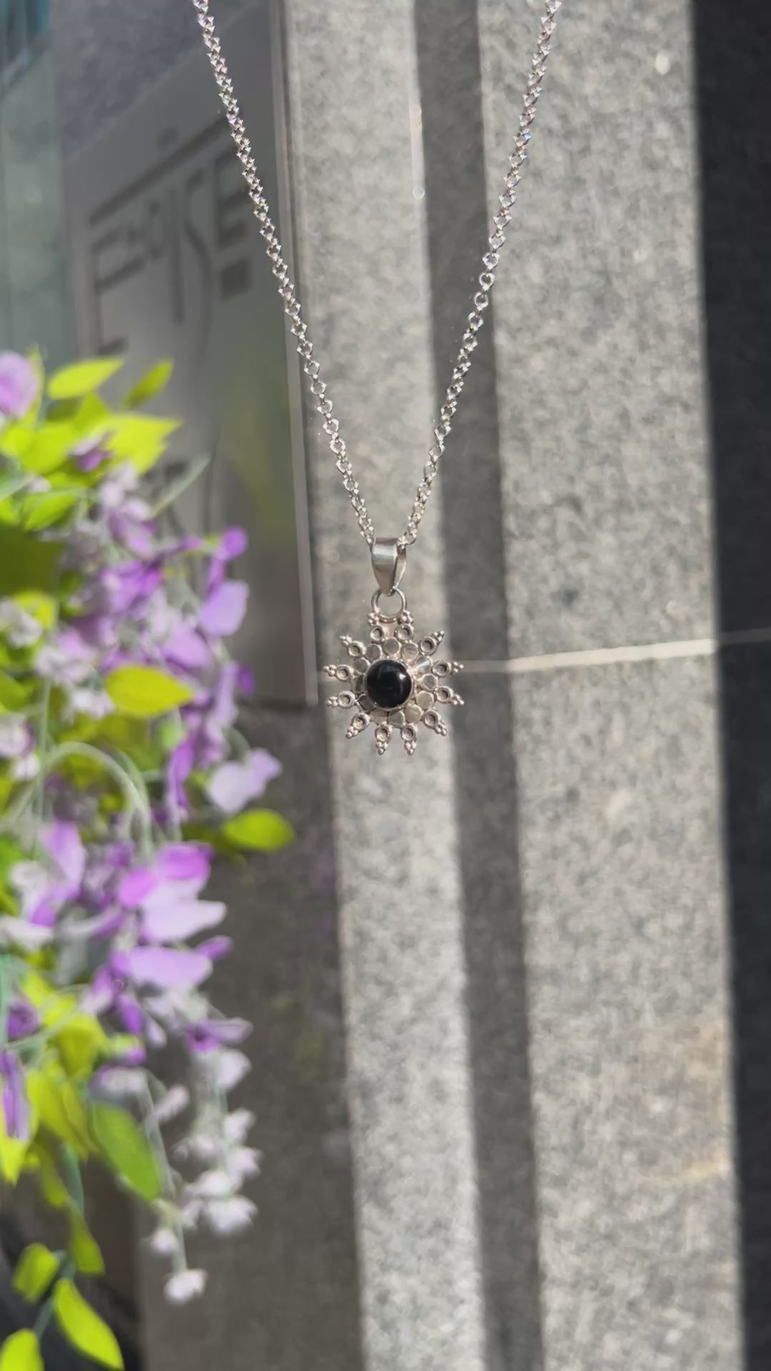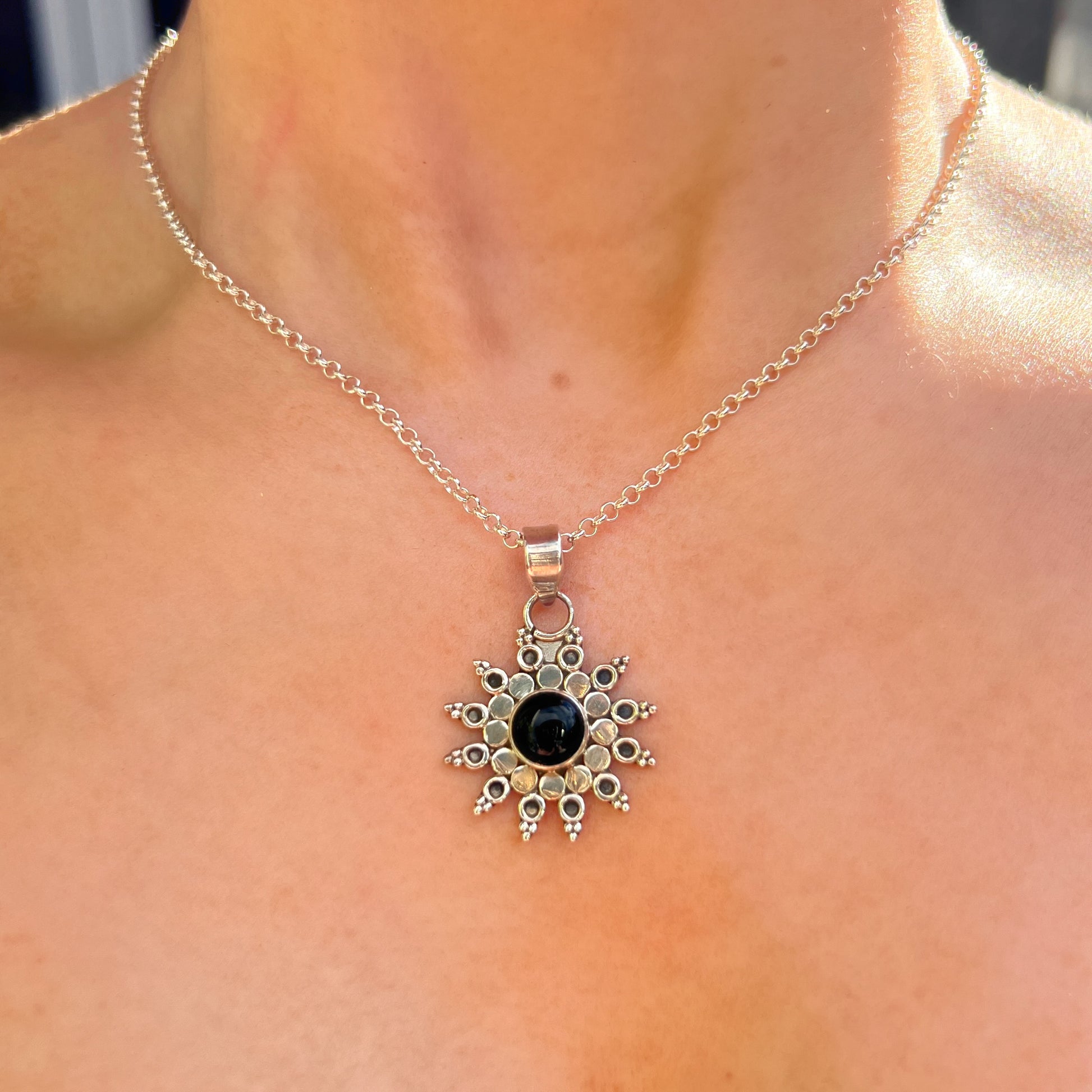 This beautiful sterling silver necklace features one black onyx gemstone in a mandala sun design.