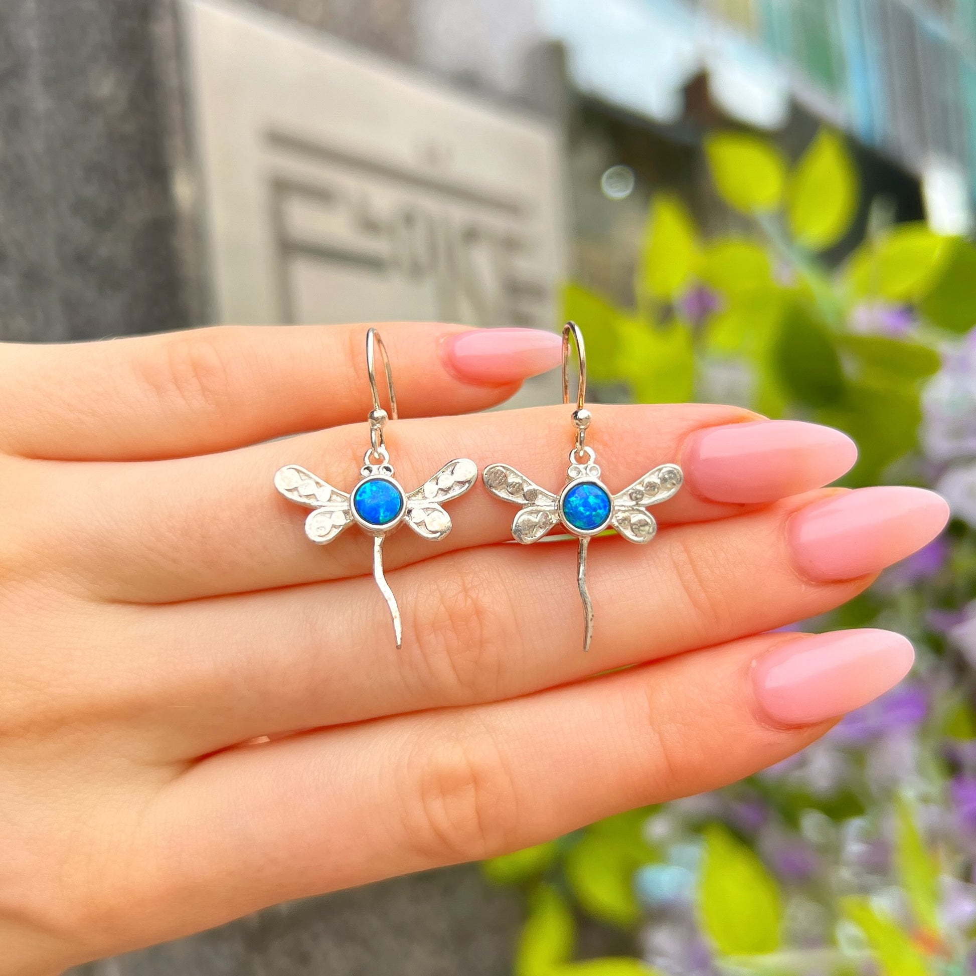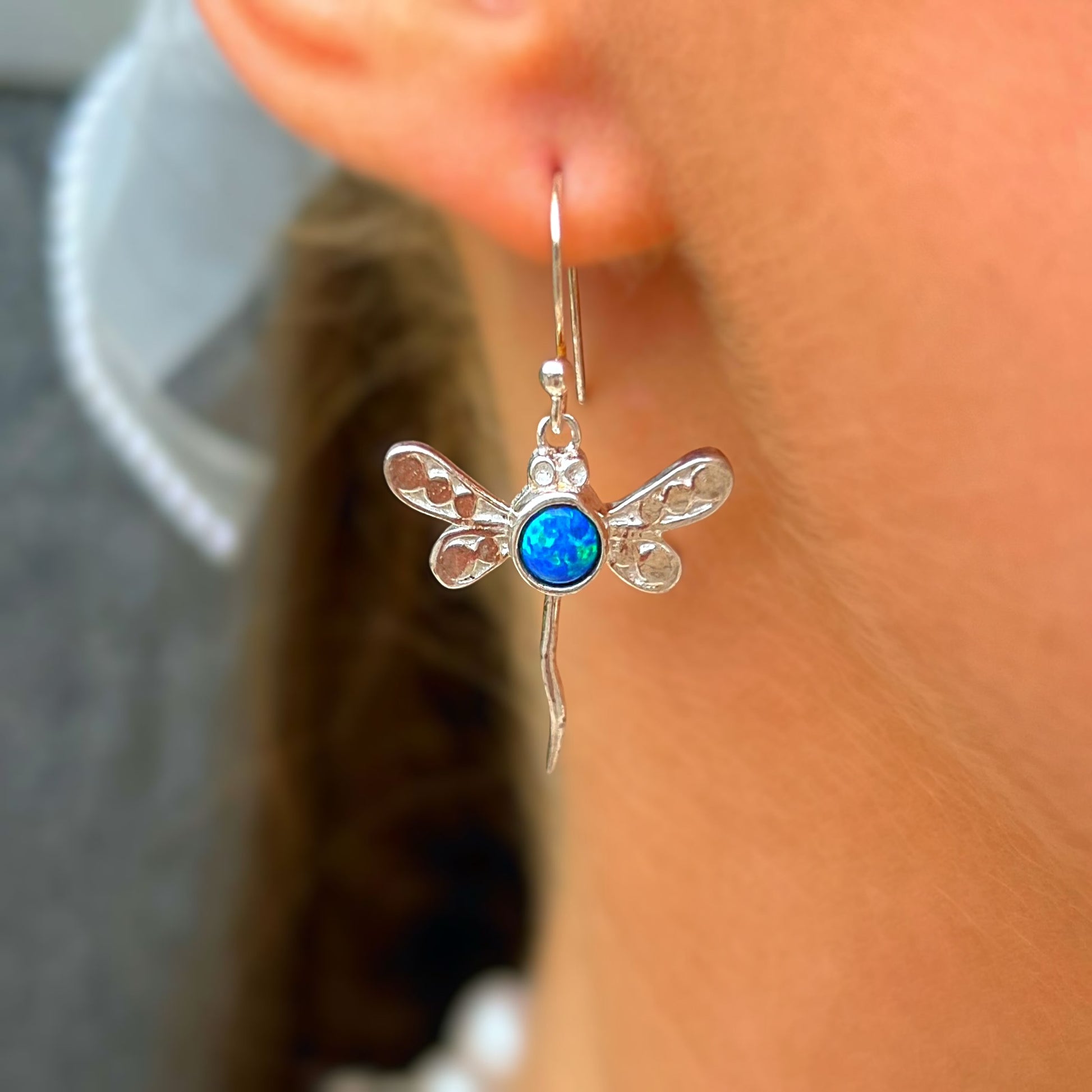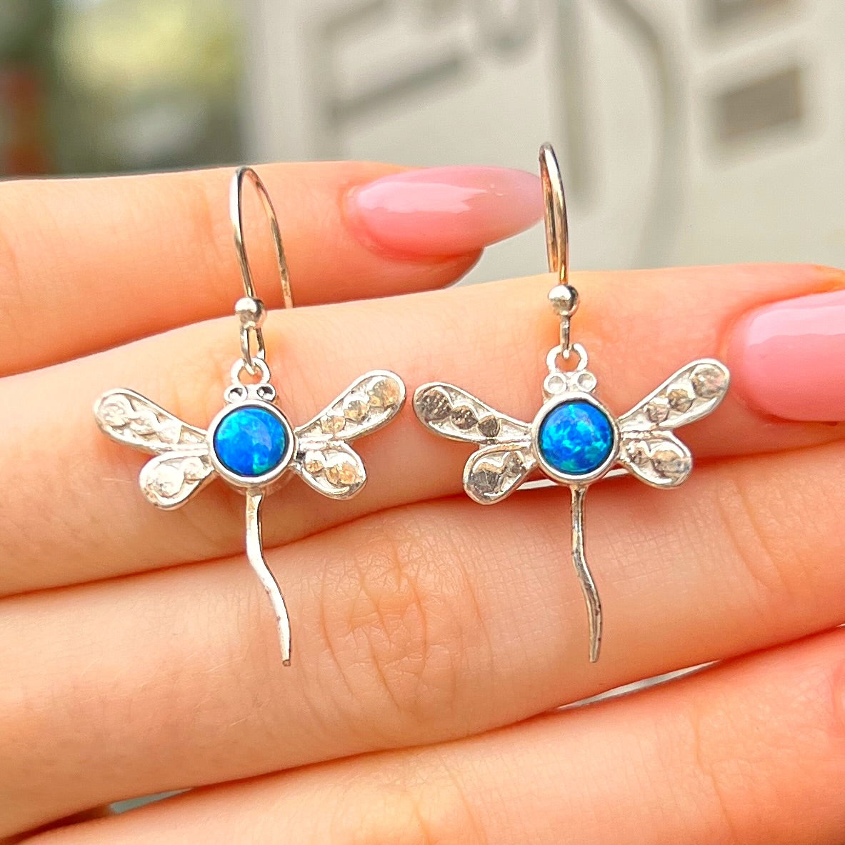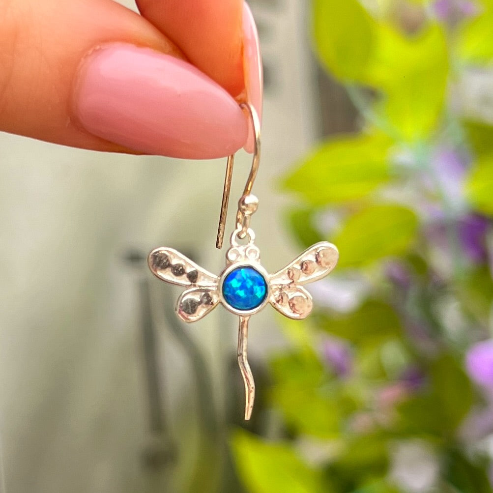 Sterling Silver Blue Opal Dragonfly Drop Earrings