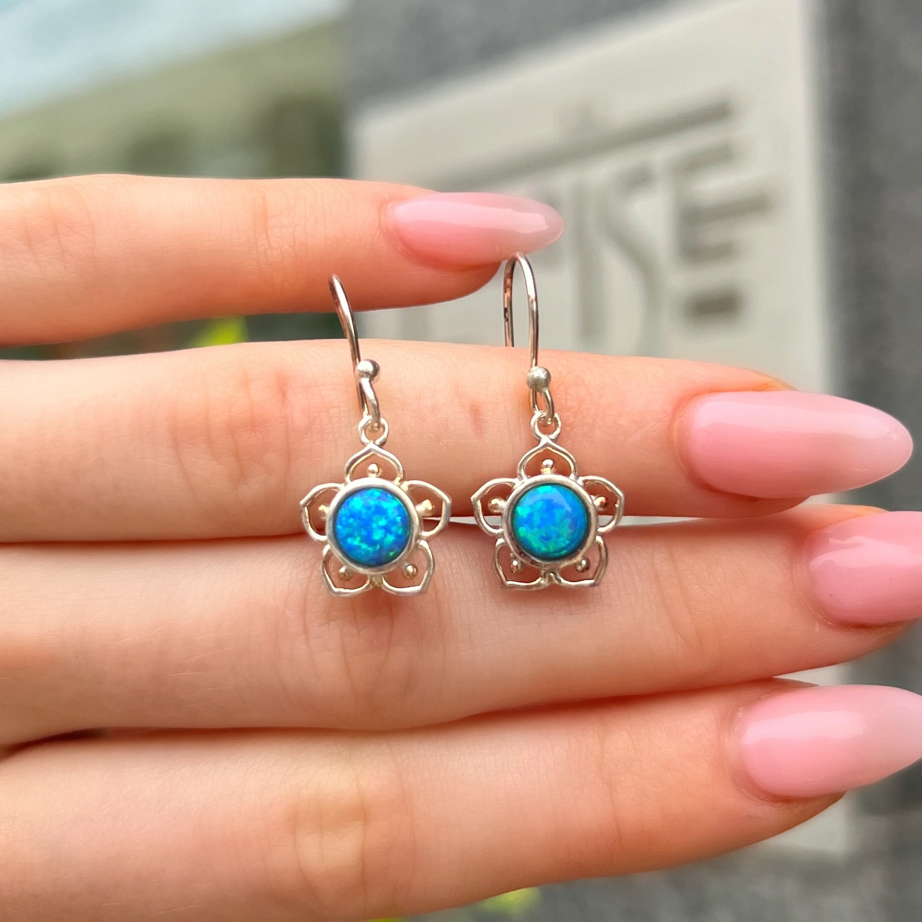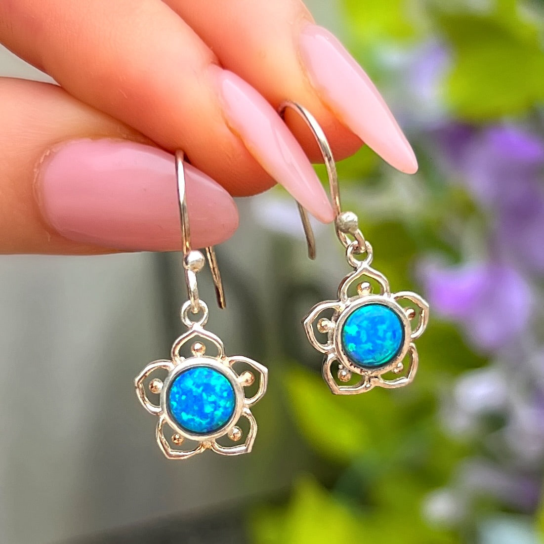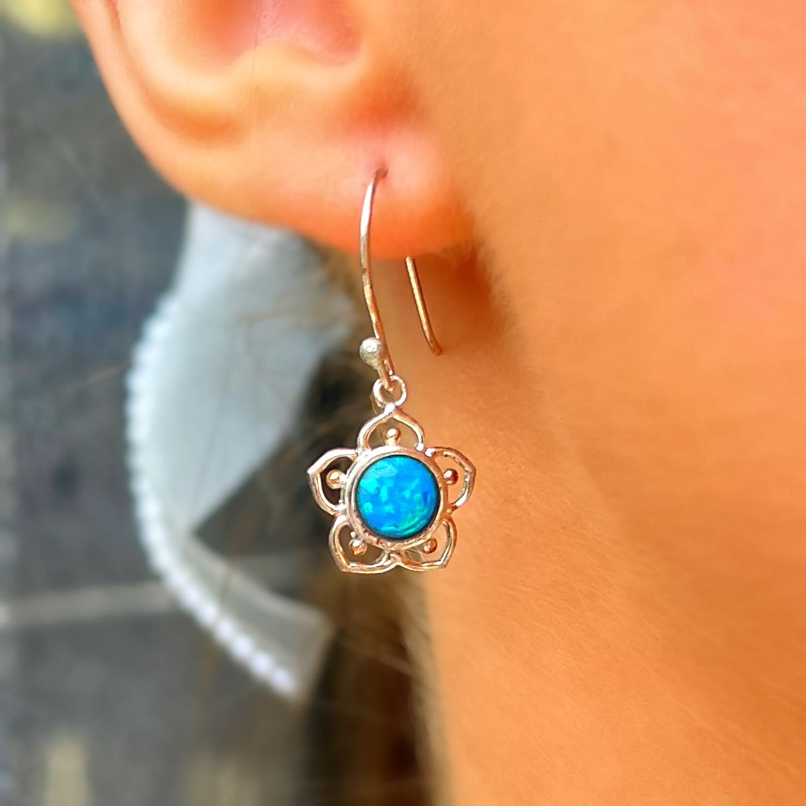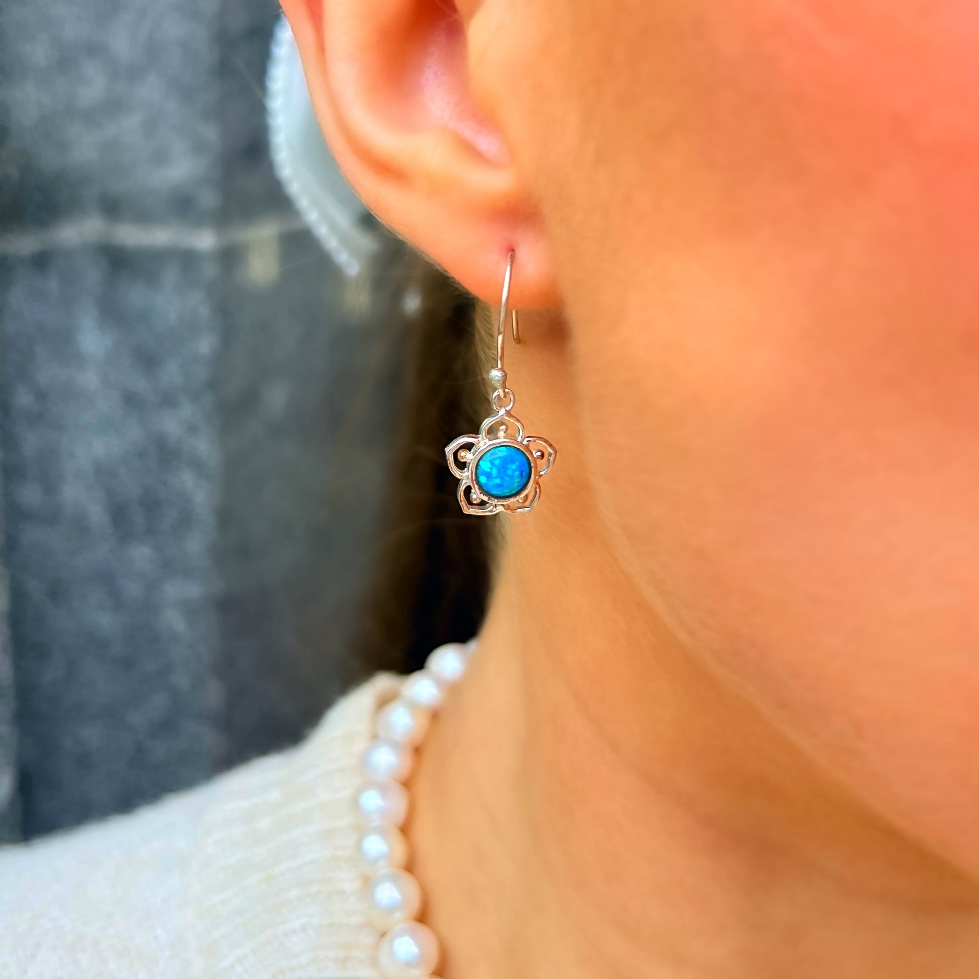 Sterling Silver Blue Opal Flower Design Drop Earrings
