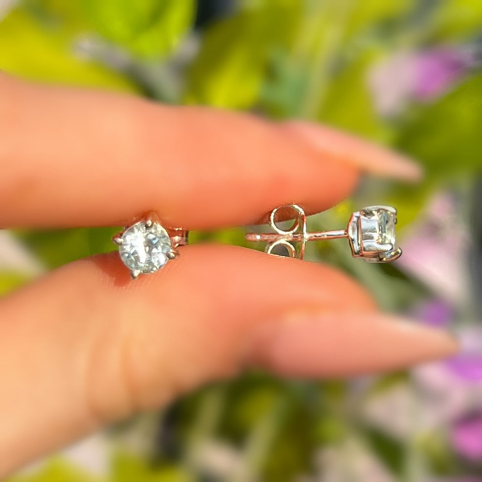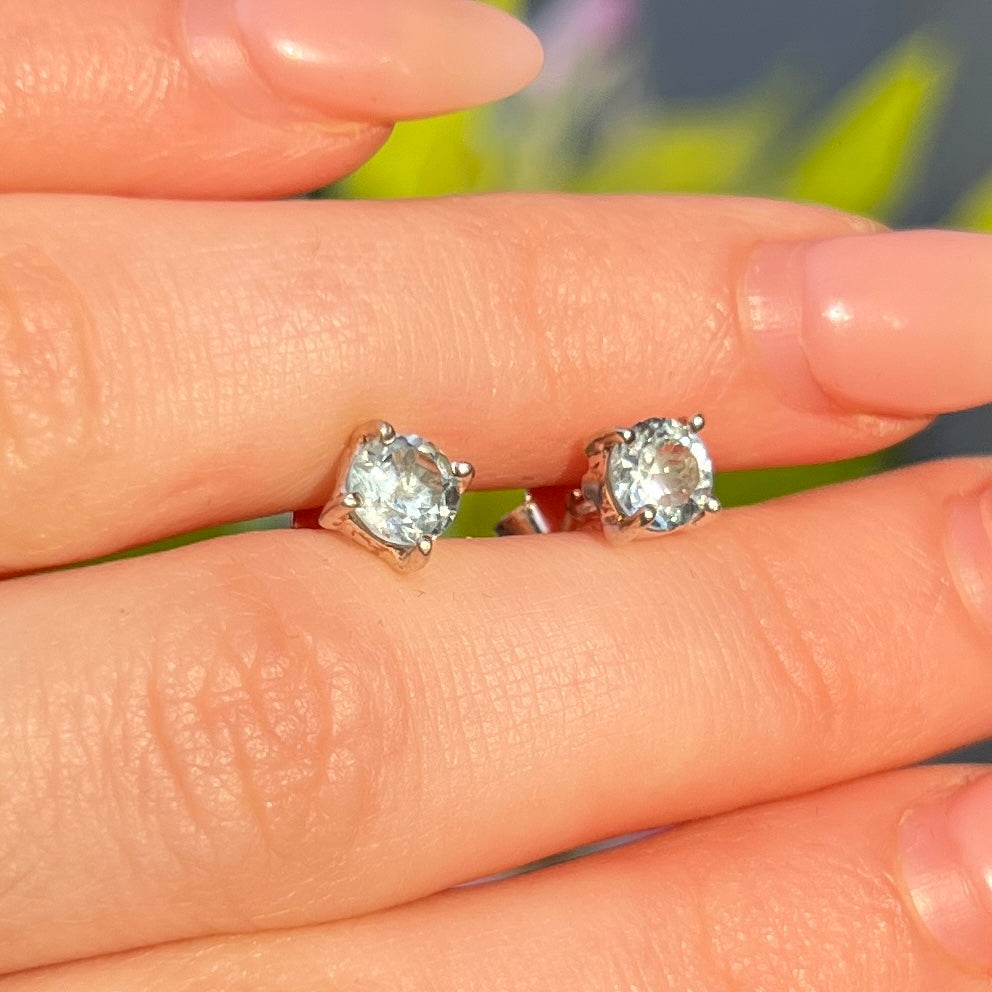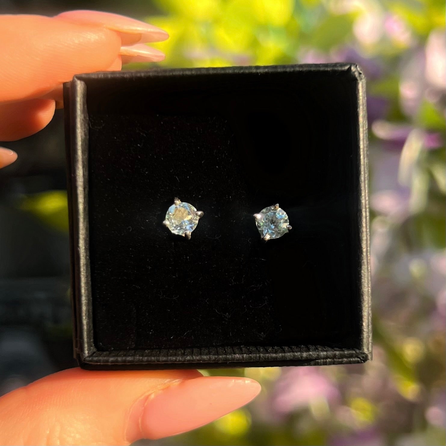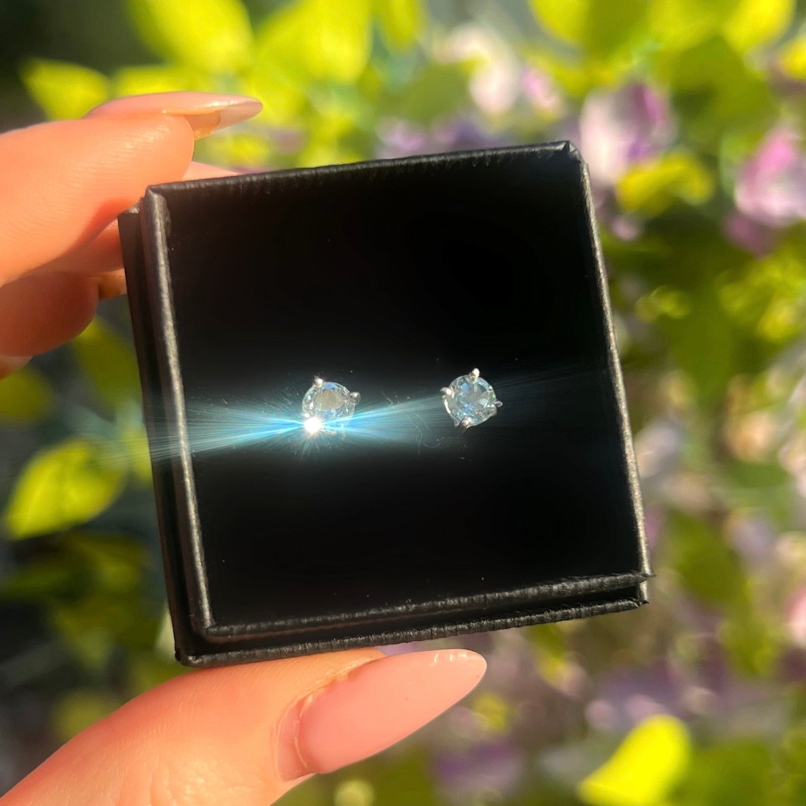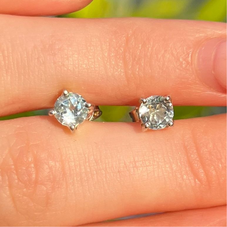 Round cut pale blue topaz faceted stones, claw set in sterling silver stud earrings.