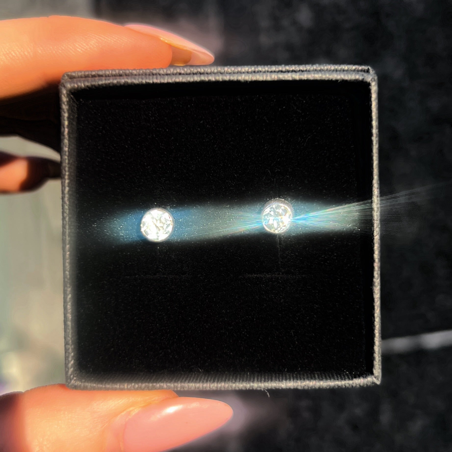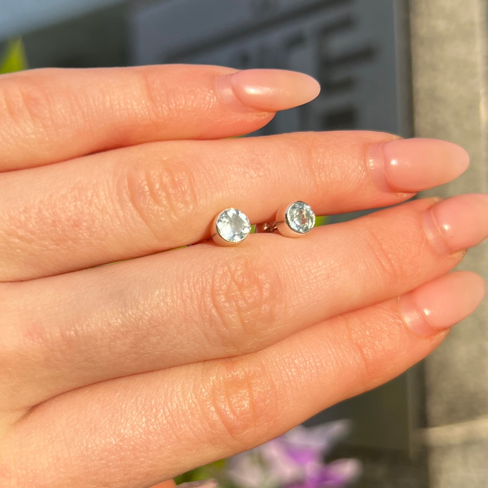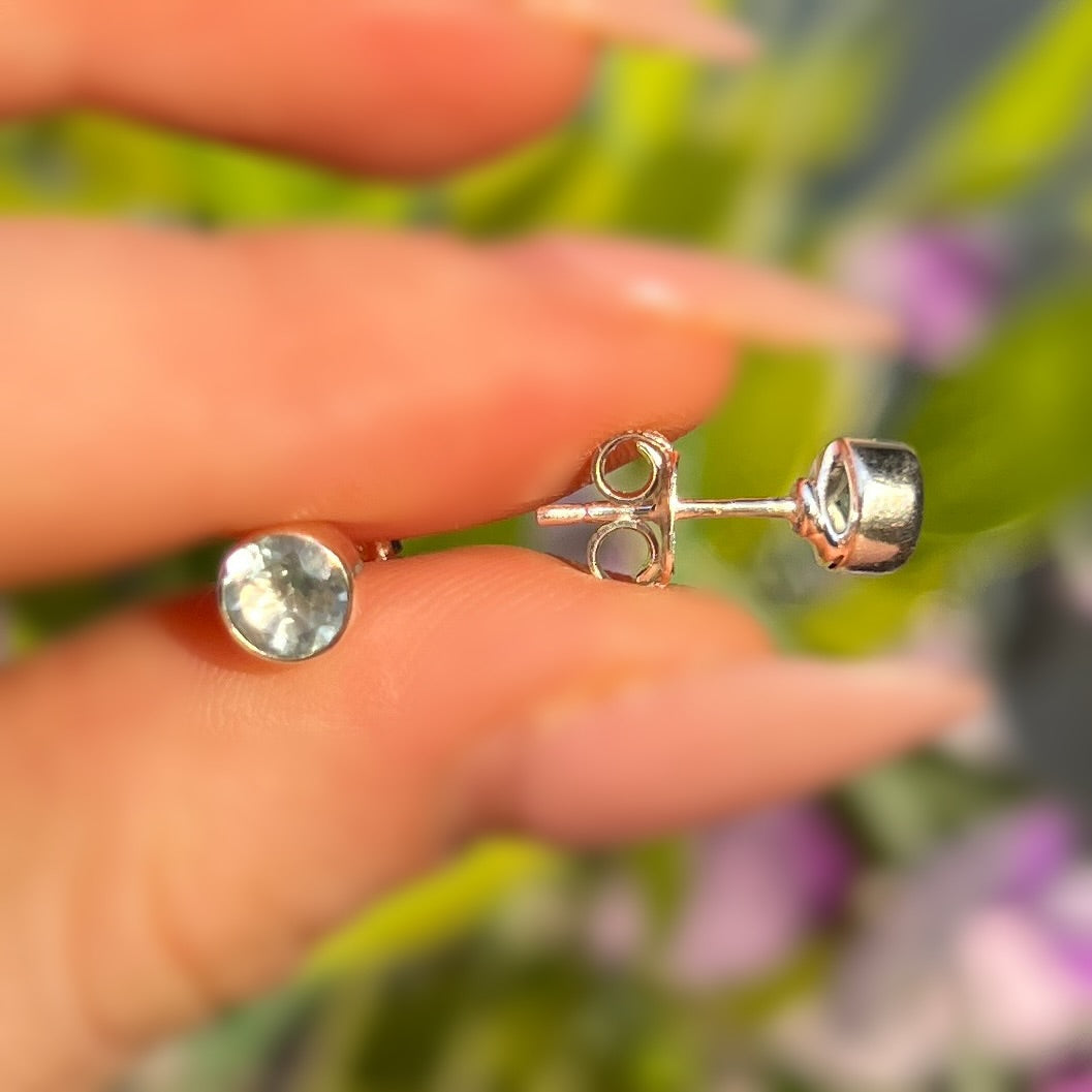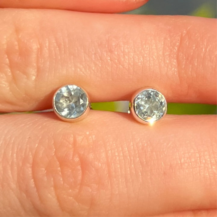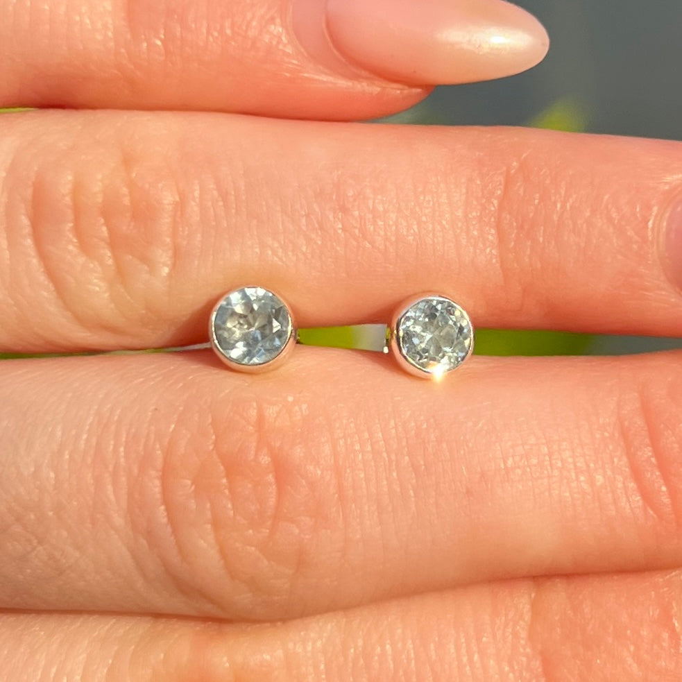 Round cut pale blue topaz faceted stones, bezel set in sterling silver stud earrings.